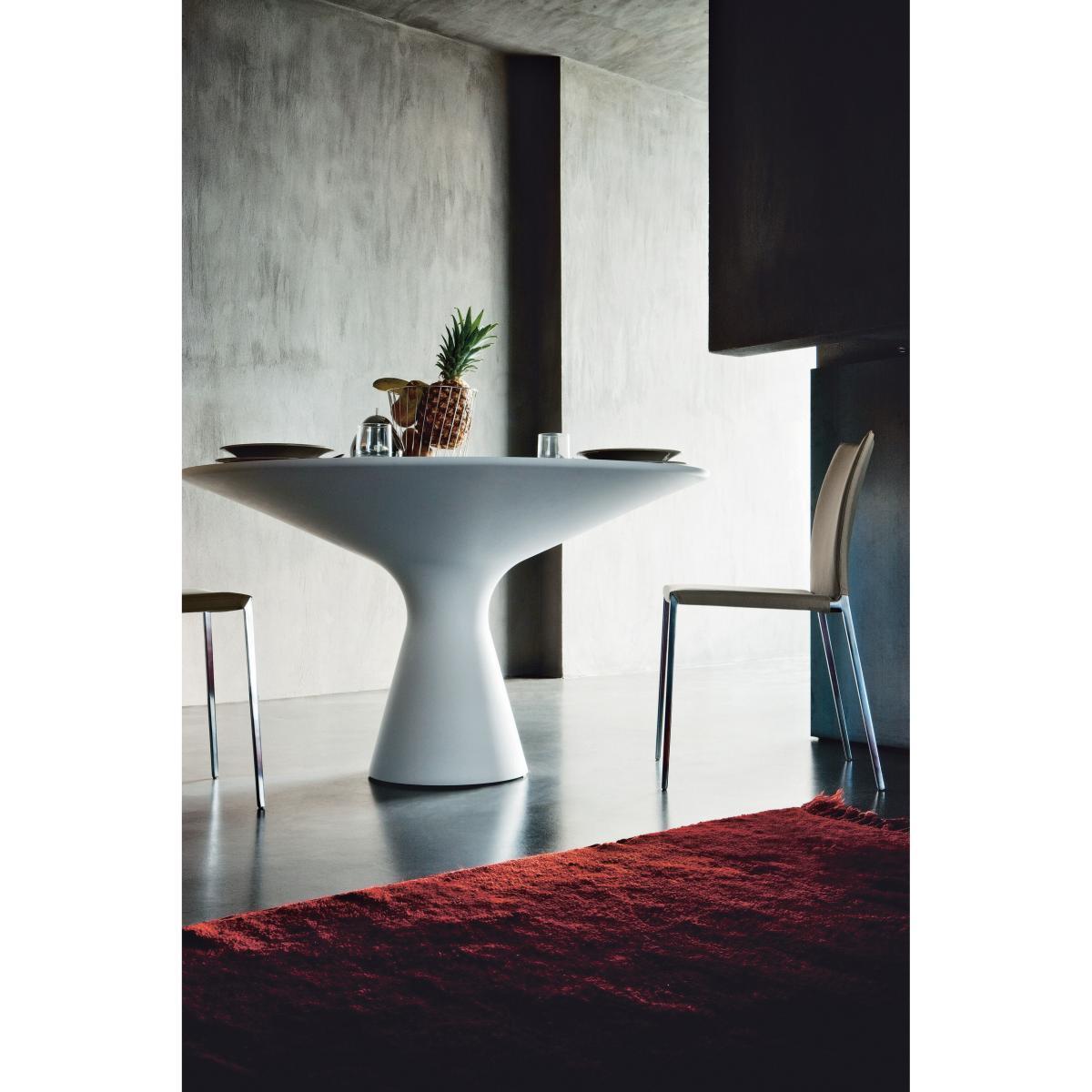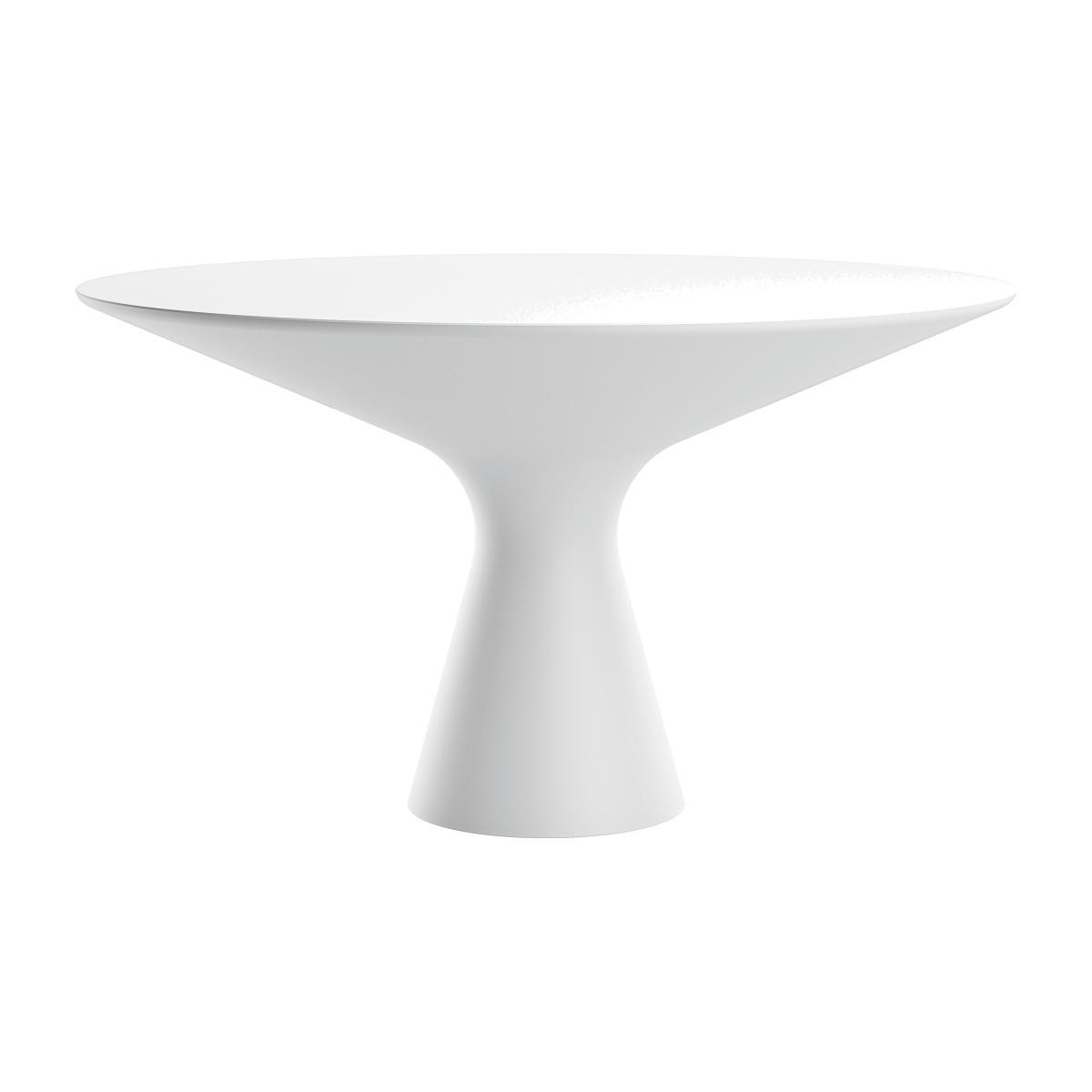 Elegant and simple at the same time, this table comes in a sculptural version, with base and top in Cristalplant®, a composite material based on acrylic resins loaded with minerals and mass-pigmented in the shade of matt white.