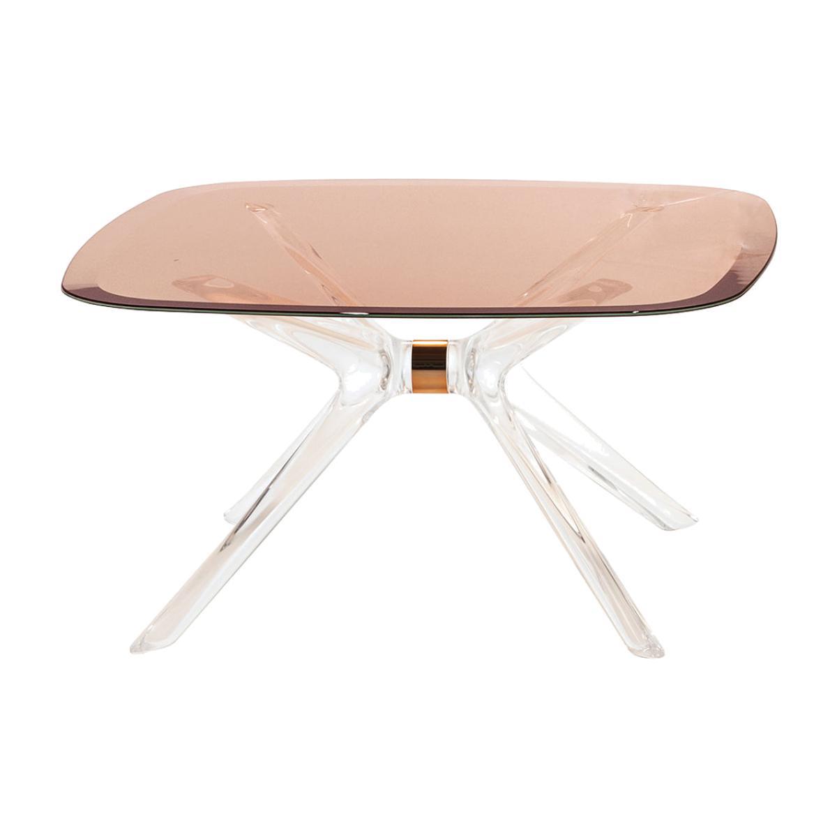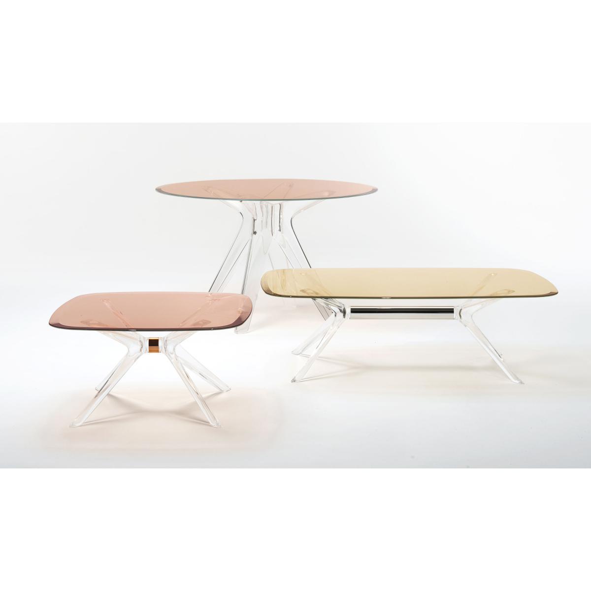 A sculptural masterpiece, a fascinating and timeless coffee table signed by Philippe Starck. The fruit of a high tech manufacturing process, the polycarbonate base is made in a highly innovative mould that enables extreme durability with minimal materials. The base is ethereal with four tapered branches, and is strong enough to hold the glass top perfectly stable. The base is set with a central bronze-coloured ring, like a precious jewel. Blast is a tribute to lightness and formal purity. It reflects Starck's obsession with creating maximum effect with minimal material, embodied in the transparent polycarbonate base. The bevelled edges of the glass top is available in soft and translucent colours, which show off the beautiful base. This is a timeless coffee table that will fit in well in any decor – evanescent and discreet but with a strong character. Philippe Starck about Blast: "A coffee table that does not need to be decorated with a book, since it is already a work of art. ".