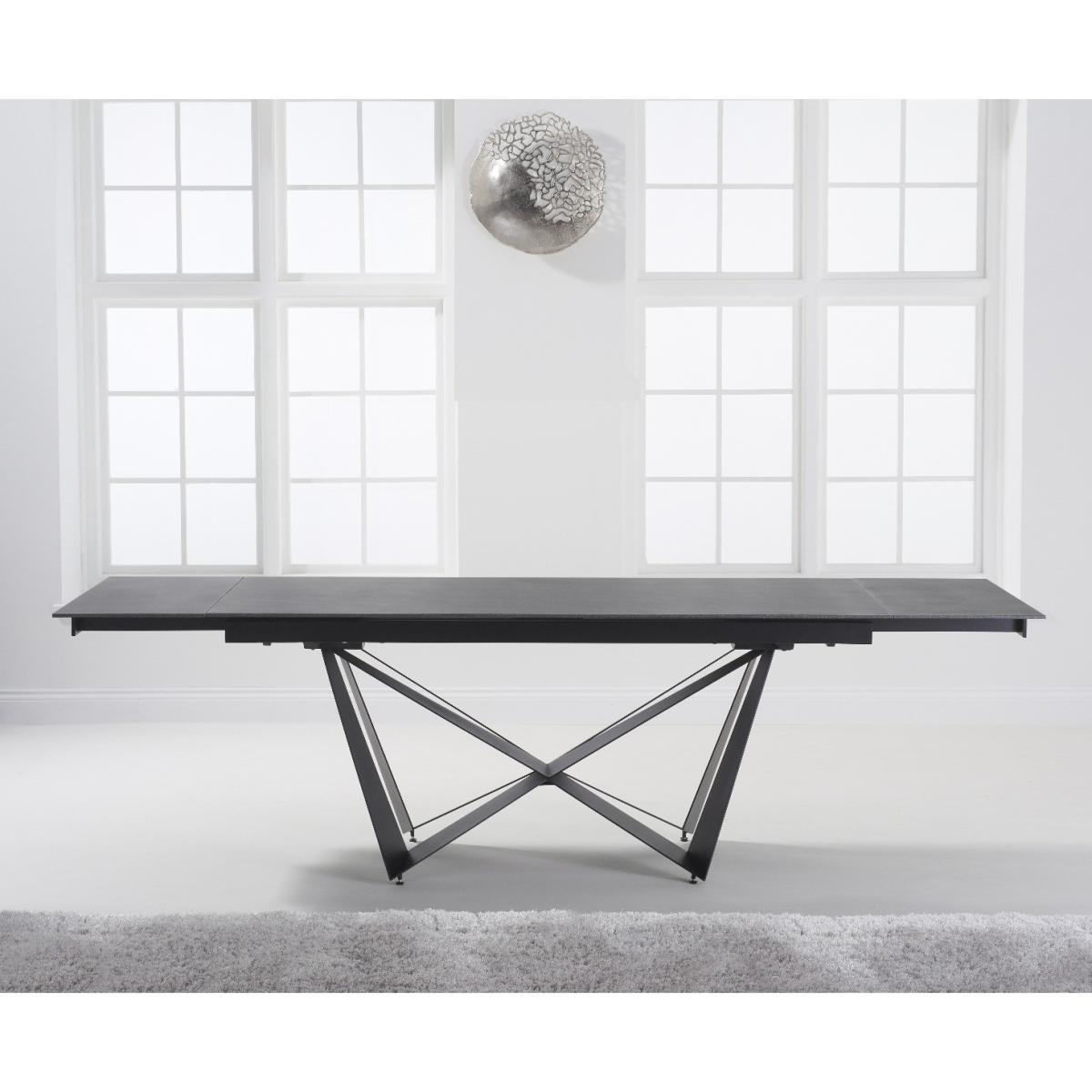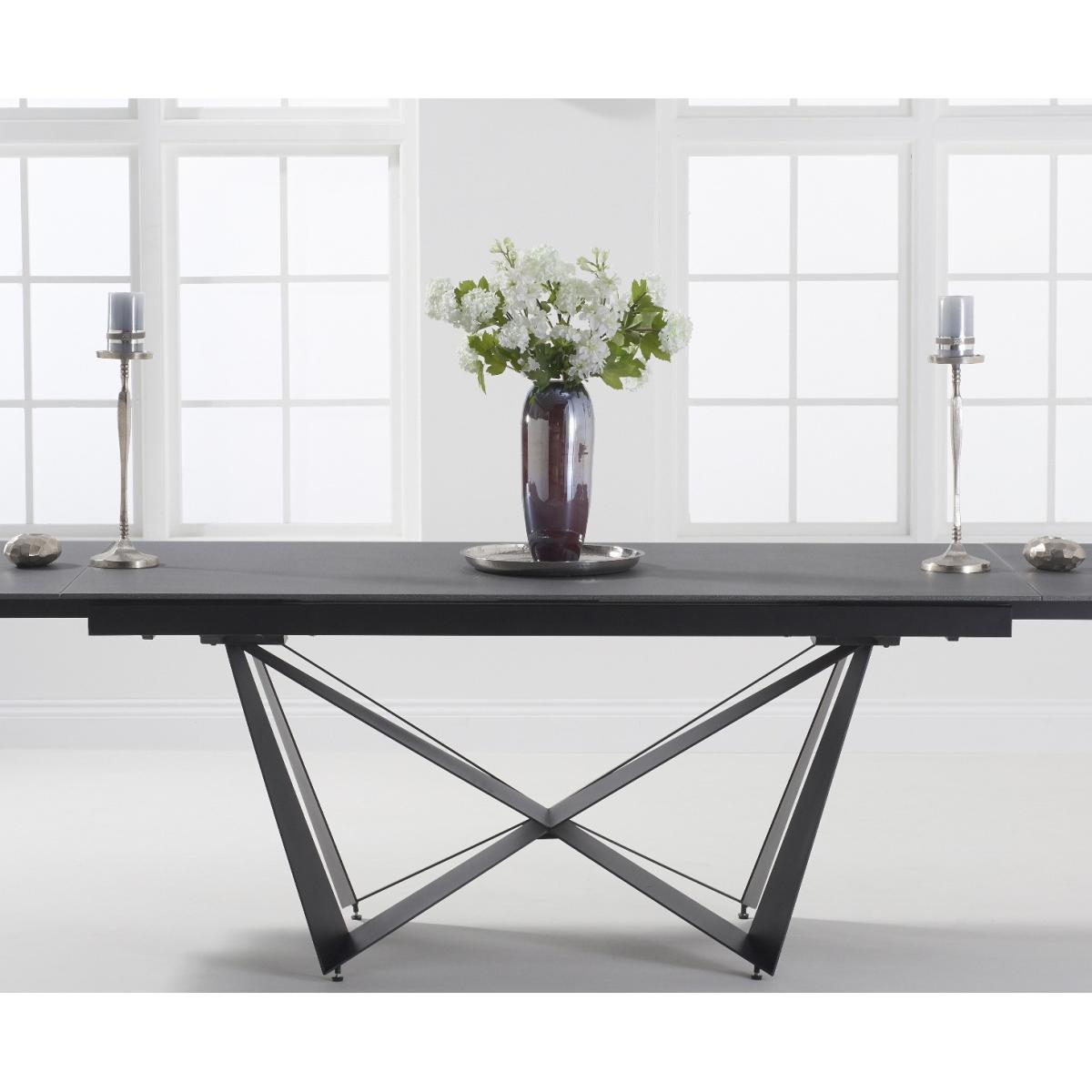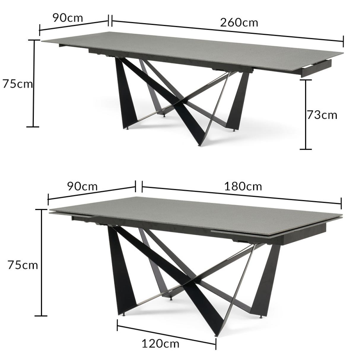The Blenheim 180cm Extending Grey Stone Dining Table features a unique modern design that makes an impression. Featuring a smooth, durable grey stone-finished table top and sturdy black legs, the table seats 8 and extends to 220cm to seat 12.Stylish large extending dining table Practical and versatile – seats 8 and extends to seat 12 Convenient inbuilt extension feature. Smooth, grey stone-finishedtable top is simply wiped clean3mm stone finish on 8mm of glass Durable black powder coated metal legs with unique modern design provide great support. Extends to 220cm3mm stone finish on 8mm of glas