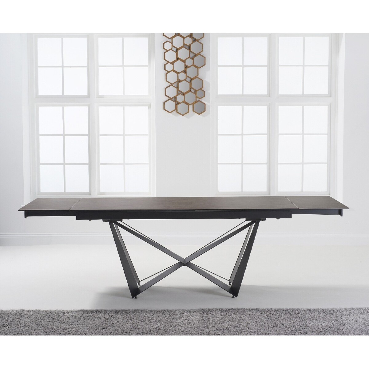 The stylish Blenheim range features extending dining tables with glass table tops with a ceramic finish and black metal legs. A spacious, practical and ultra-modern collection perfect for the contemporary home. The Blenheim features a glass table top with a sleek 3mm mink ceramic finish. Extending to an impressive 260cm. The stunning Blenheim table features black metal legs in a striking crossed design. For a look that makes a statement.