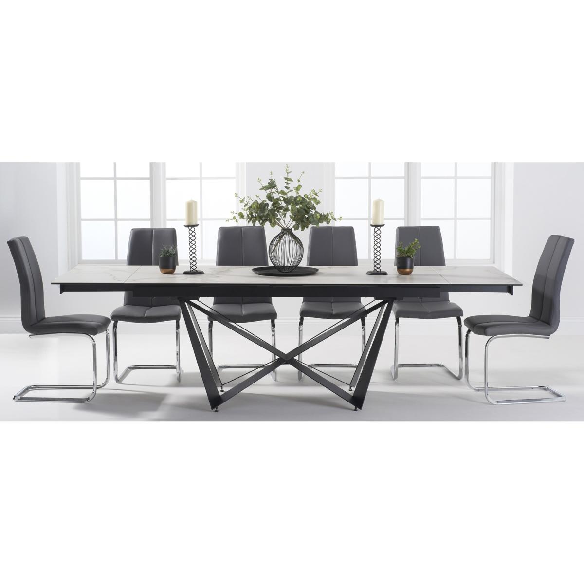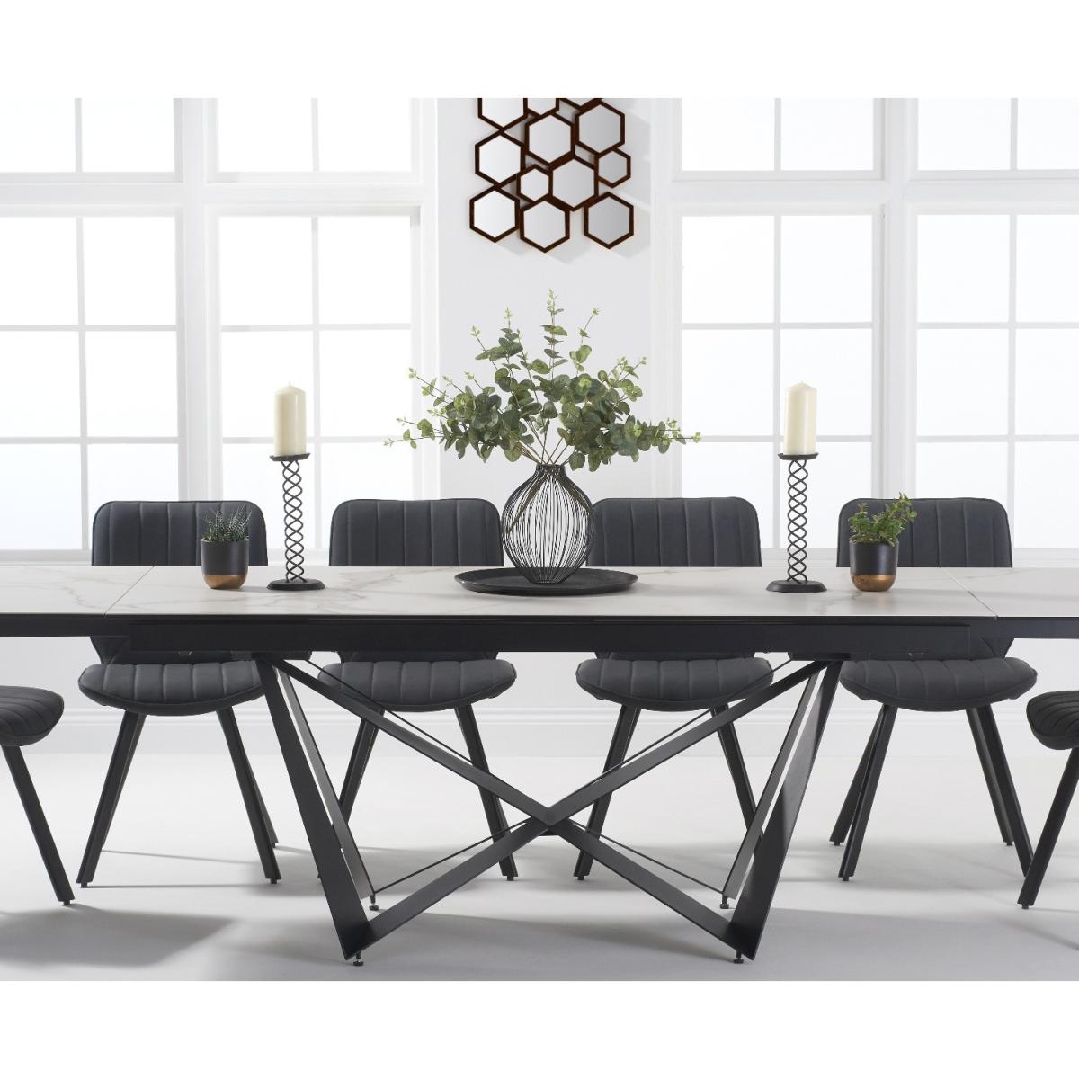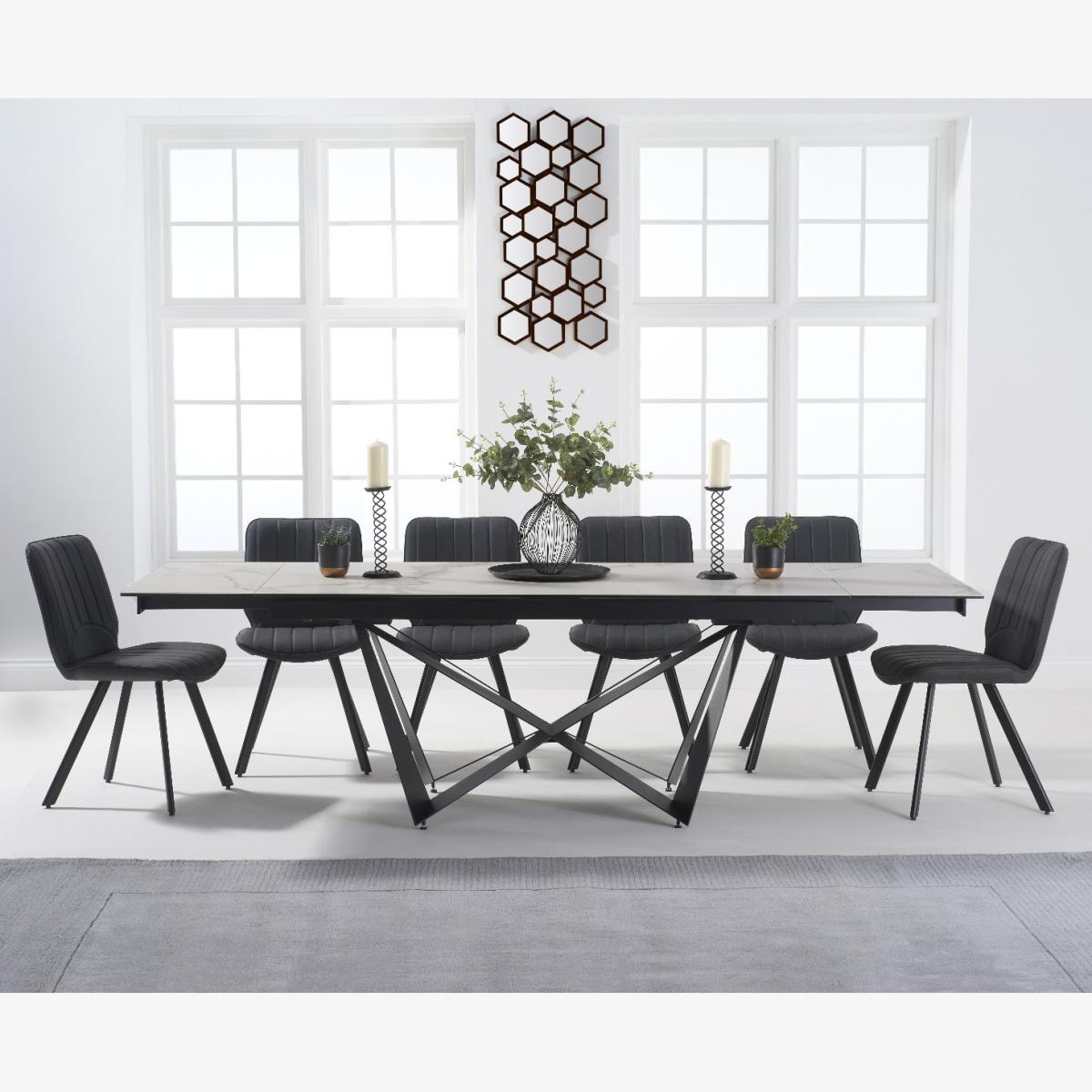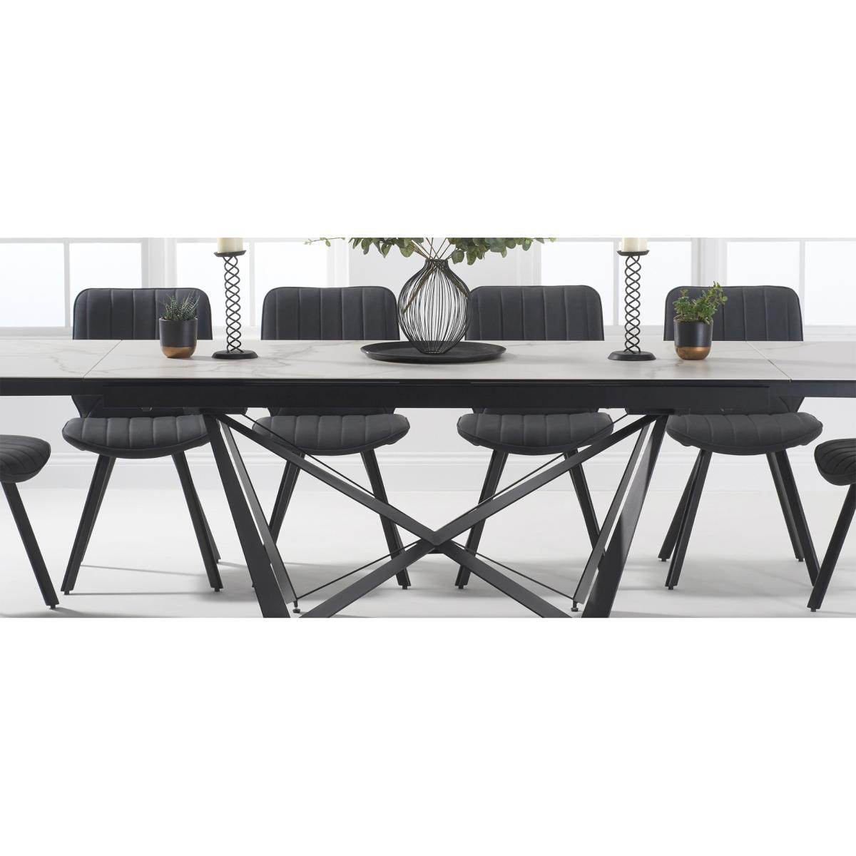 A stylish extending dining table set. The Blenheim range features glass table tops with a stone finish and black metal legs.