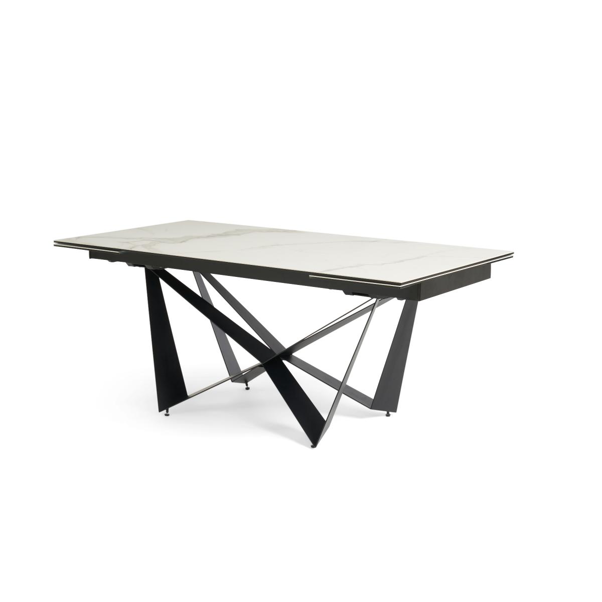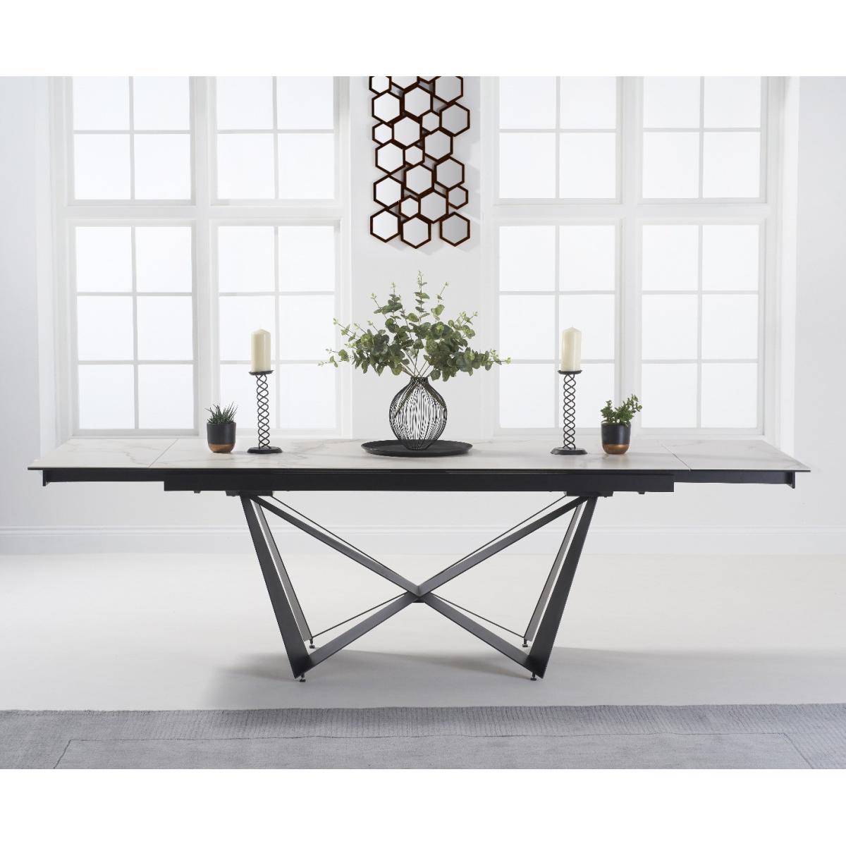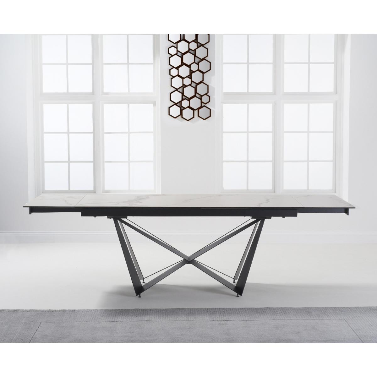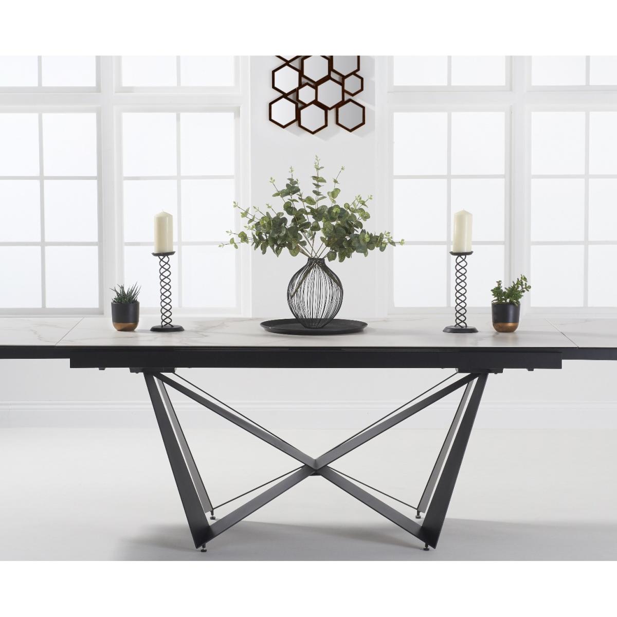 A stylish extending dining table set. The Blenheim range features glass table tops with a stone finish and black metal legs.