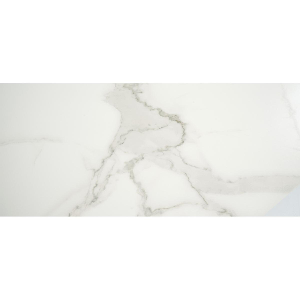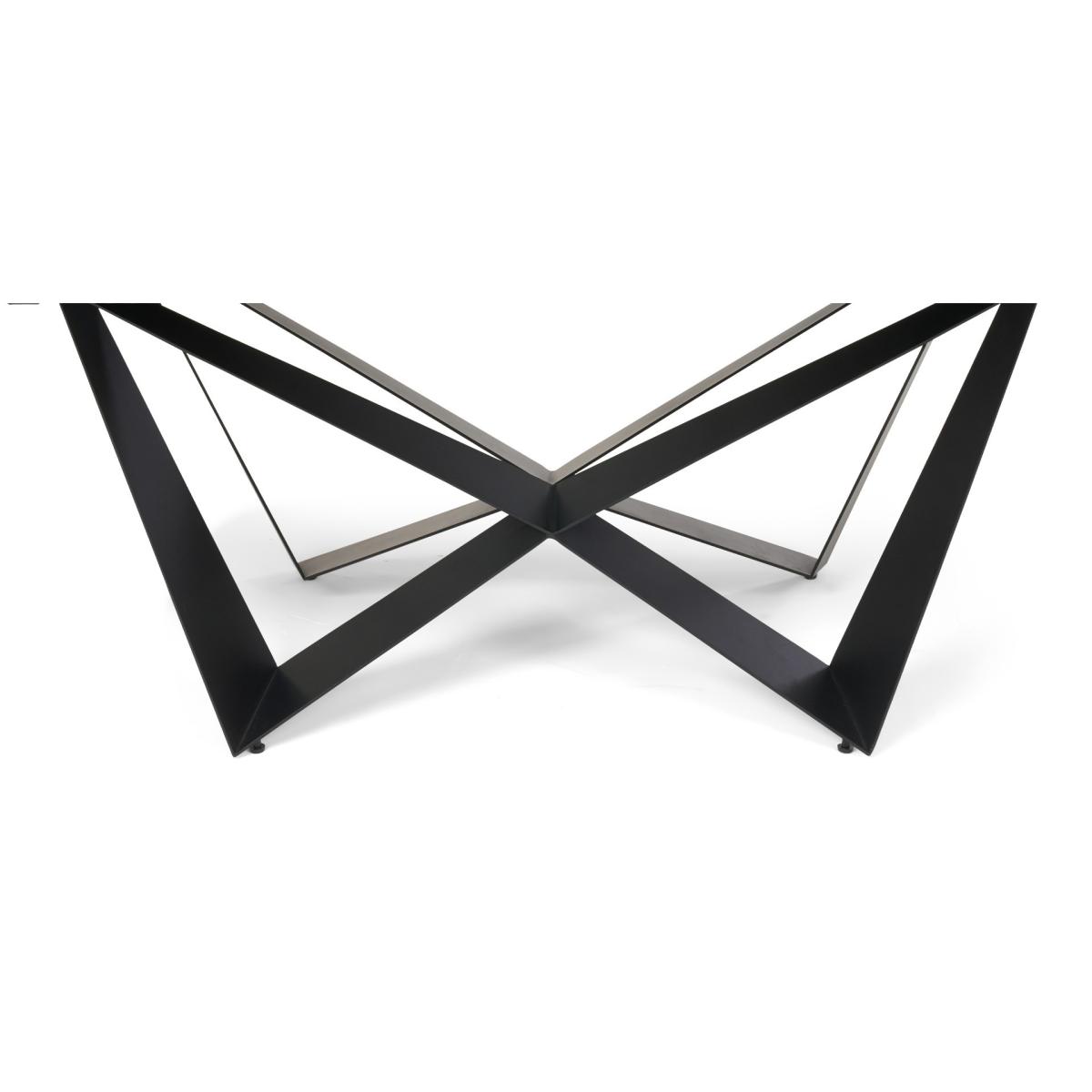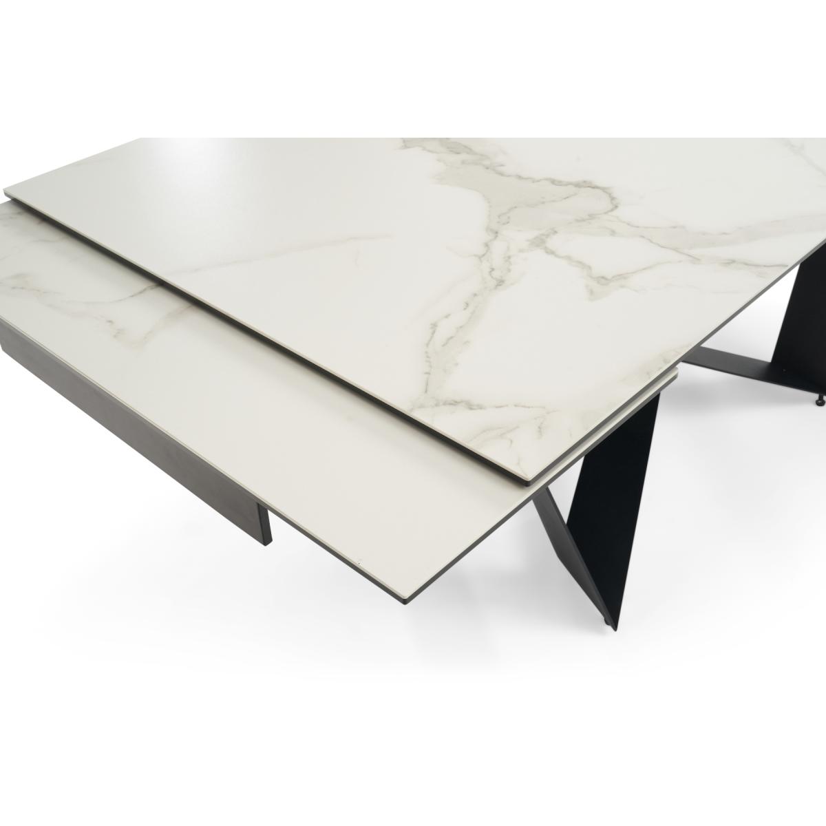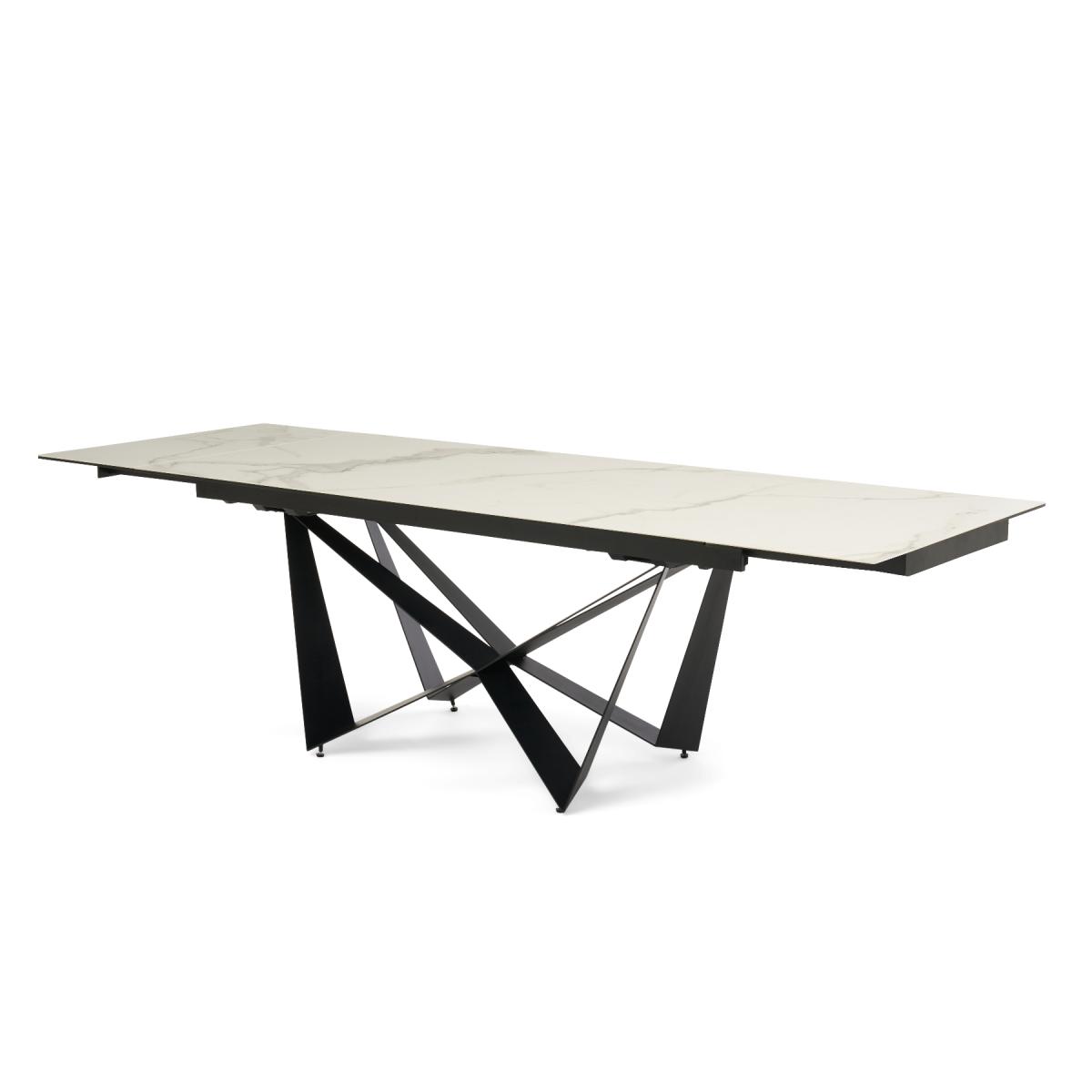 A stylish extending dining table set. The Blenheim range features glass table tops with a stone finish and black metal legs.