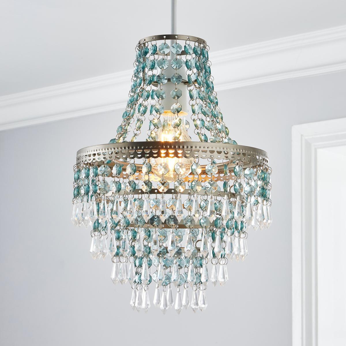 Introduce an opulent feel to any room with our striking mini easy fit pendant, suitable for kids rooms. Constructed from two satin nickle finish rings that have cascading coloured acrylic beads and droplets falling from them, this easy fit pendant will add a touch of glamour to your little ones room. Matching family items are available to help coordinate your home.