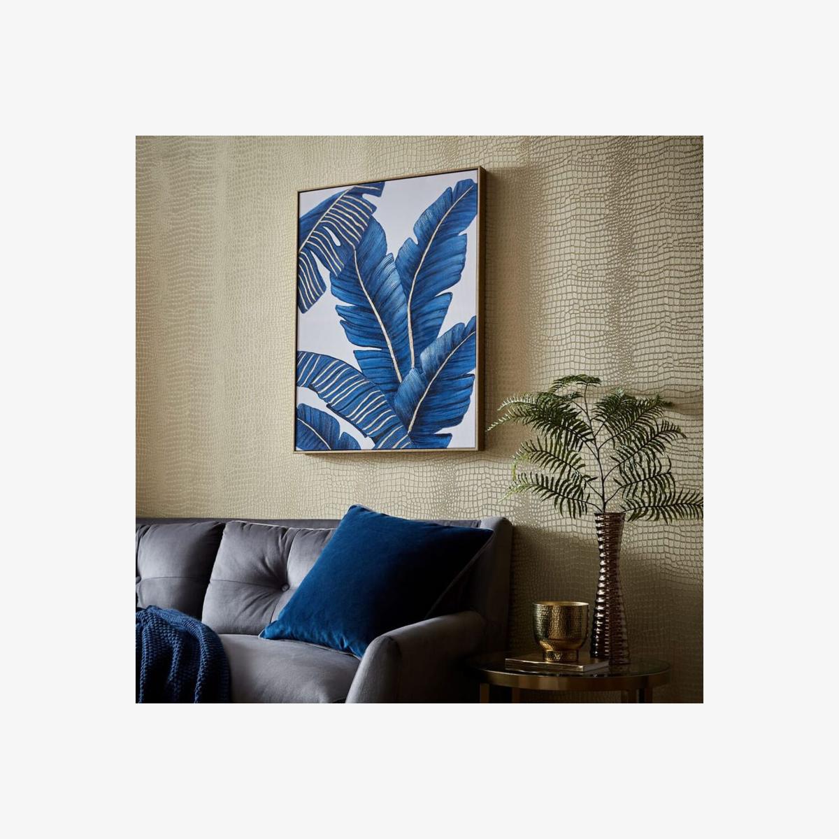 The Blissful Blue Tropics Box Framed Canvas has luxury written all over it. With the on trend cobalt tropical blue leaves and the gold metallic highlights it is sure to create a bold look and a real focal point on your wall. Creating a real luxury statement this eye-catching design has been beautifully finished with elements of hand painted detail.