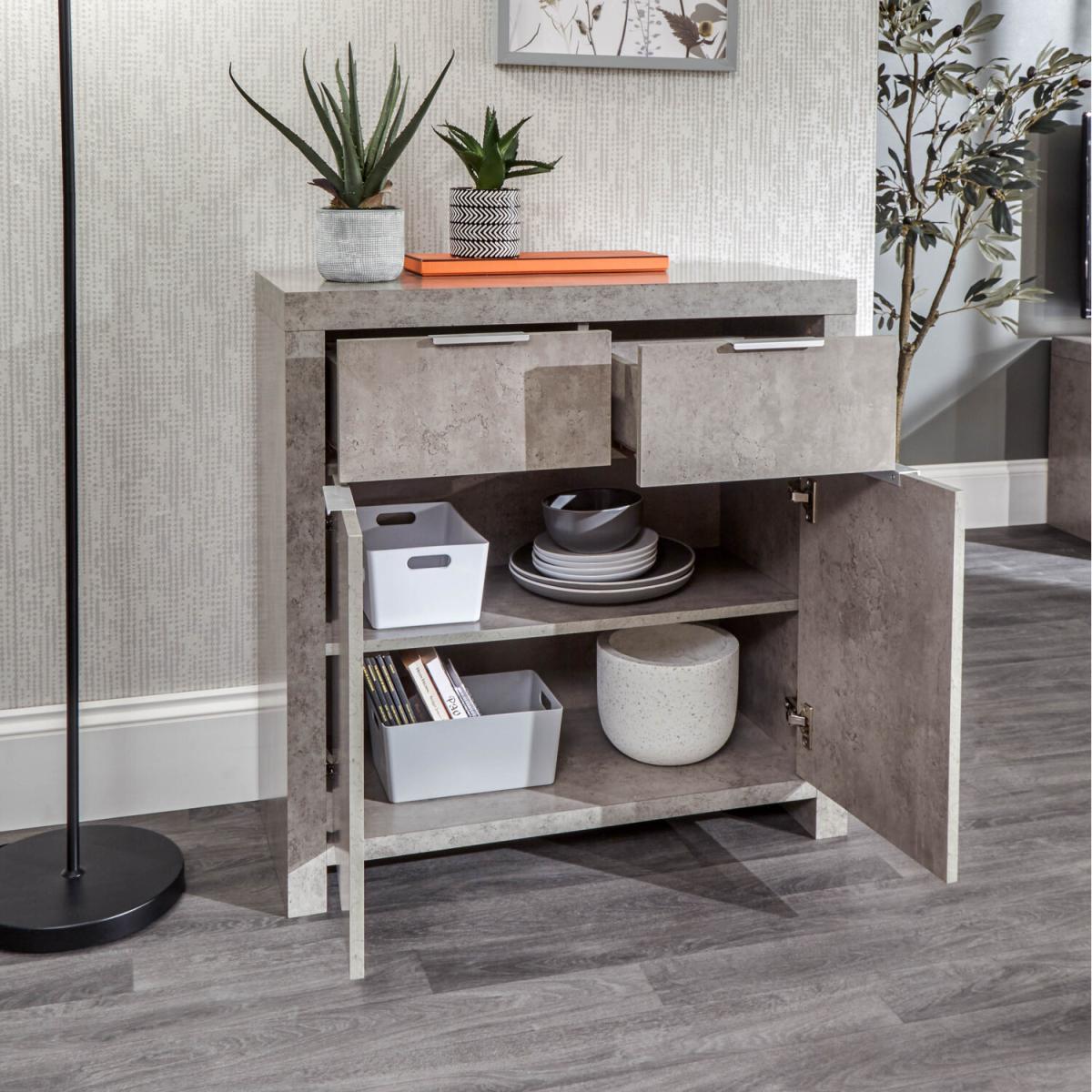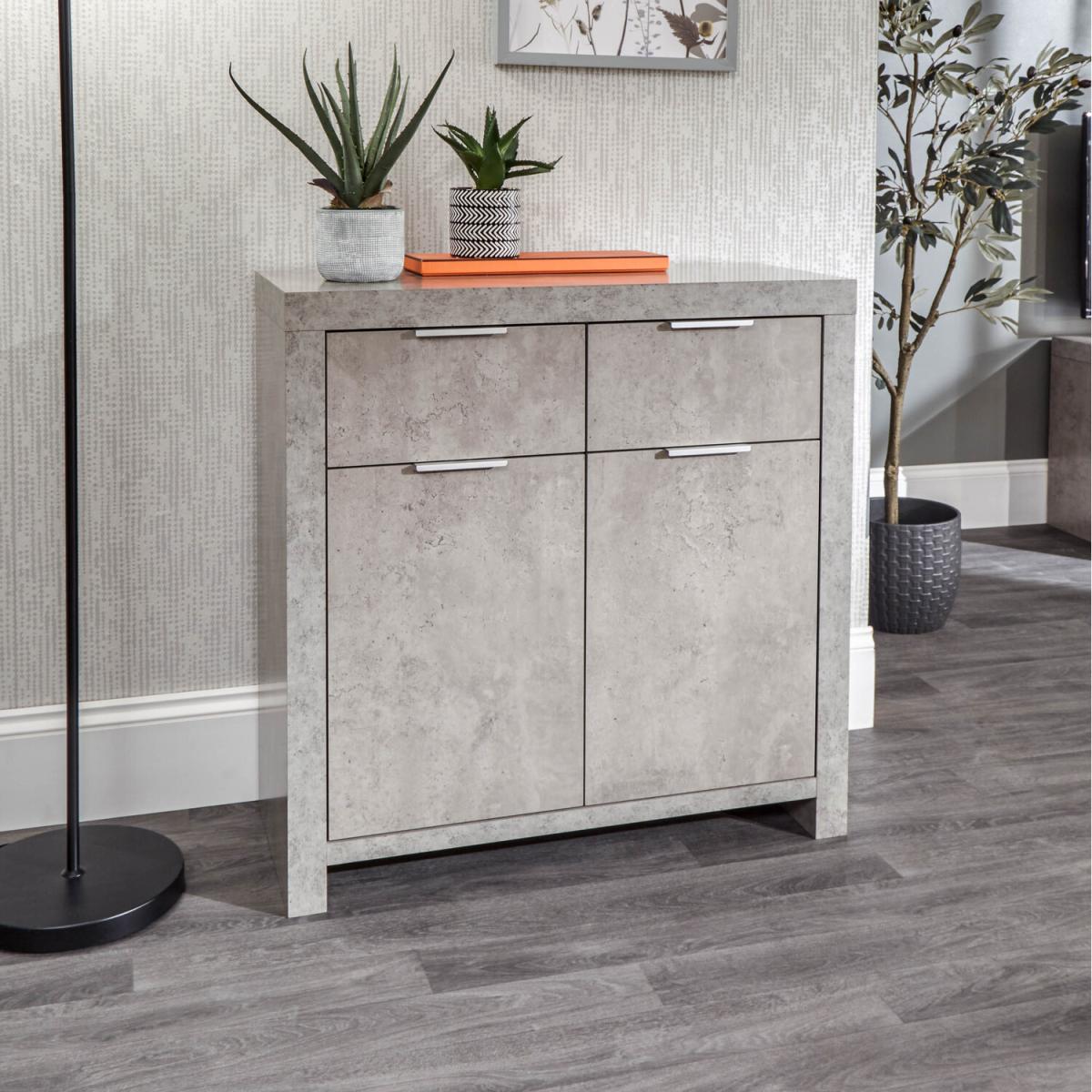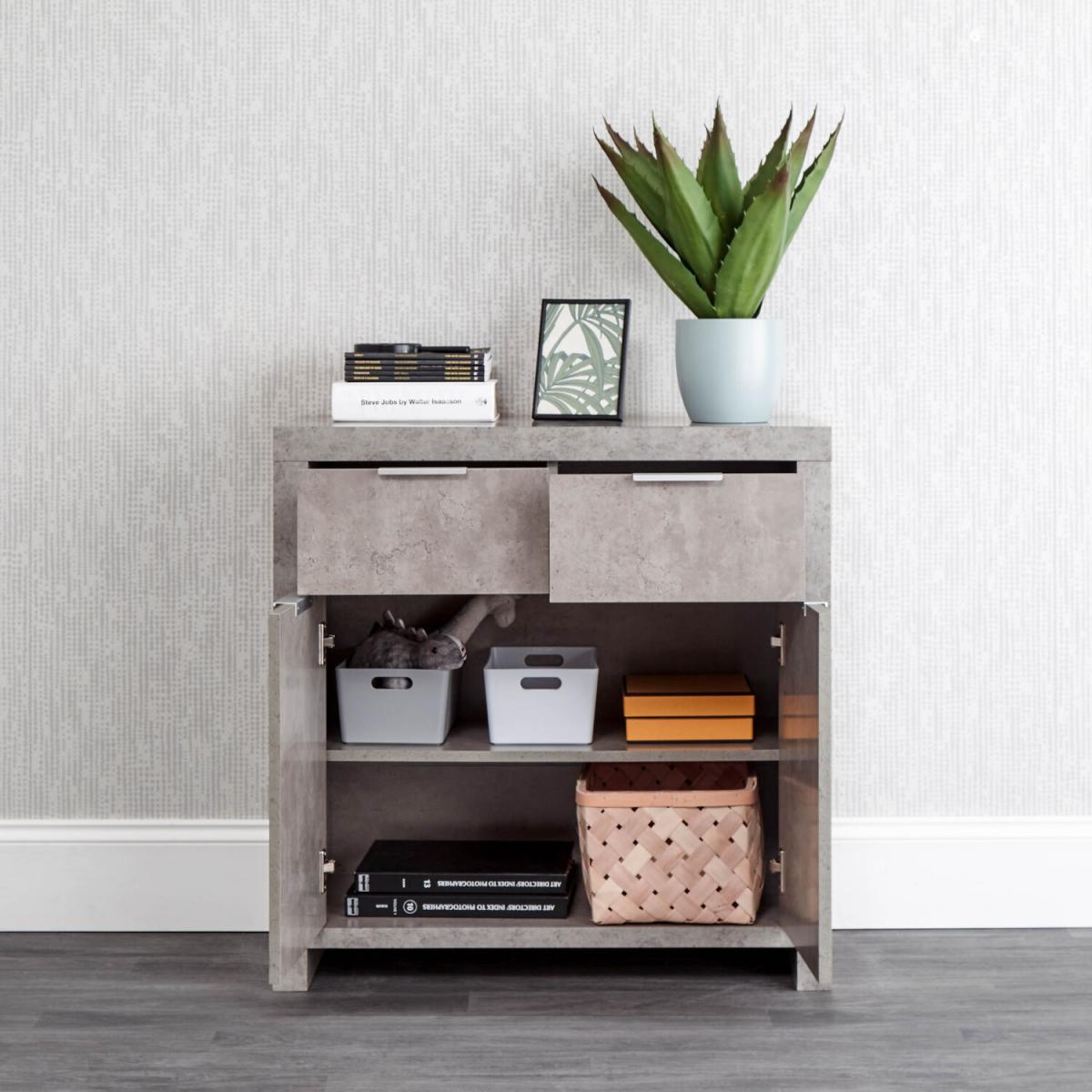 With Bloc, you don't have to choose between form and function. The sleek and stylish design pairs clean lines with chunky panel construction to provide a compact storage option that helps keep your home clutter-free. Finished in distressed concrete-effect melamine, it offers plenty of space for equipment and accessories. The two-door cabinet incorporates an adjustable shelf and is topped by matching twin drawers with slender finger plates that add to the urban-industrial appeal.