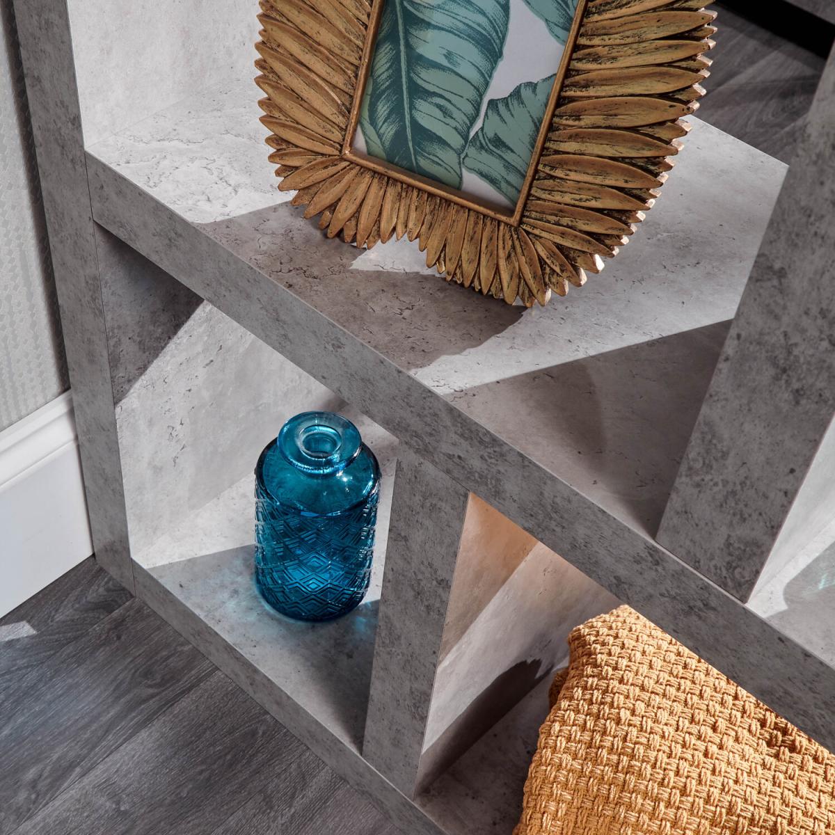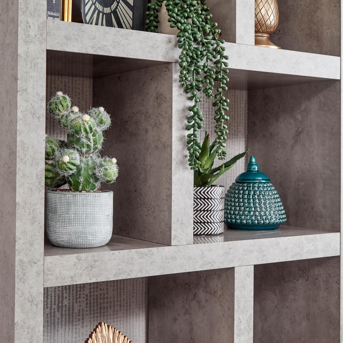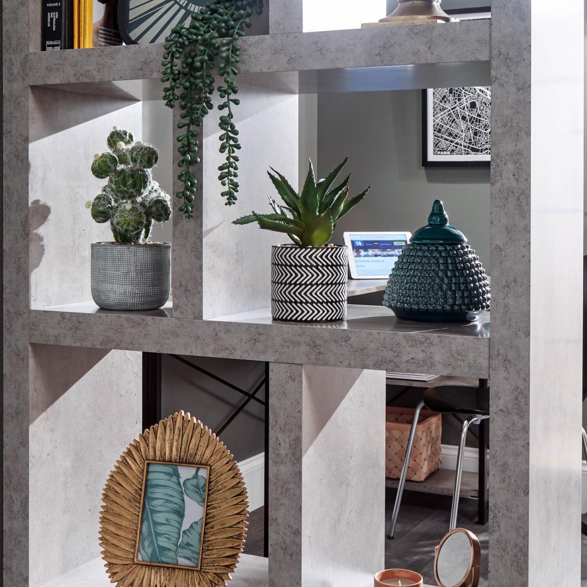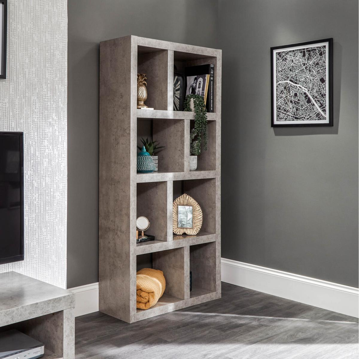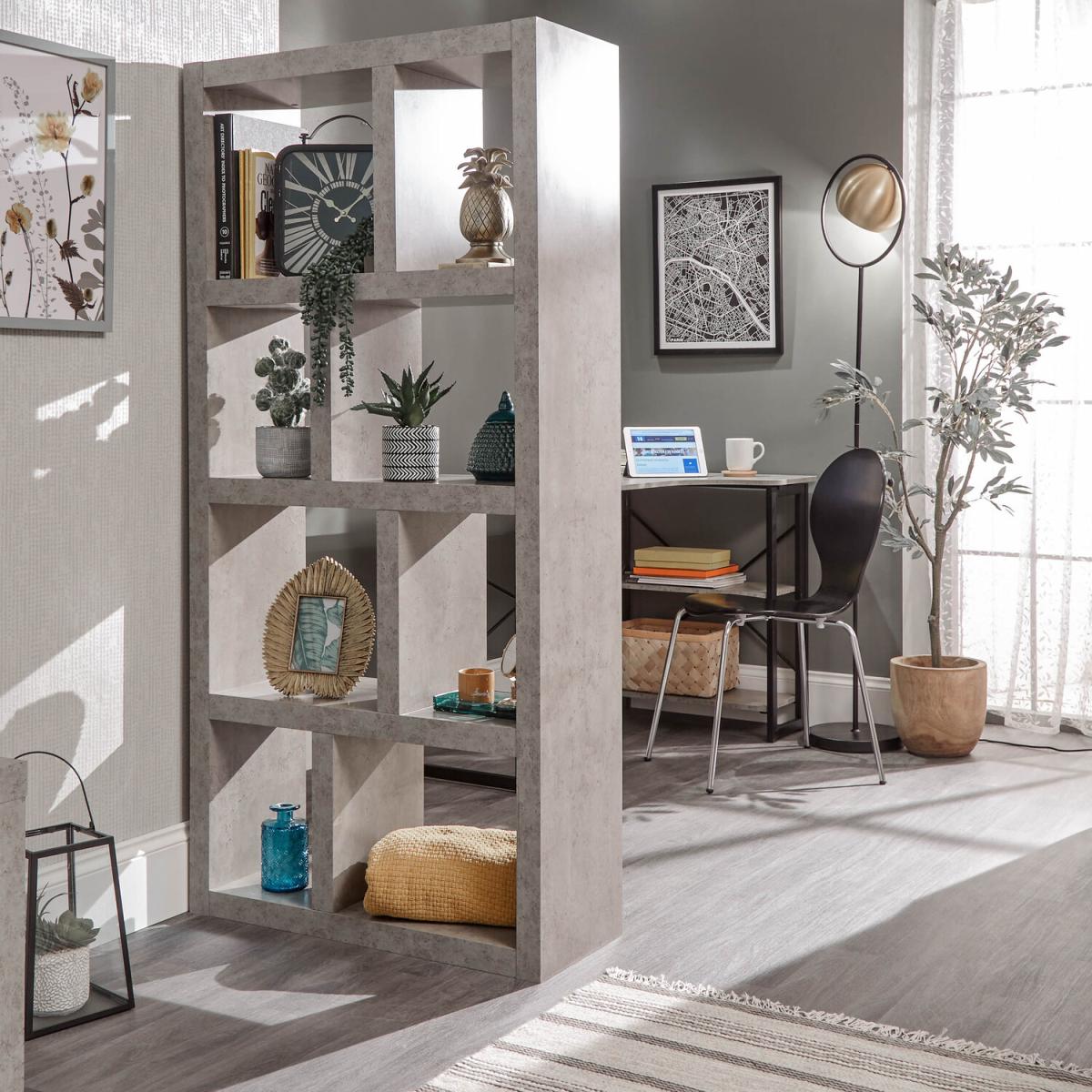 Give your home the storage it deserves with this cool, contemporary shelving unit. The chunky panels are sturdy and durable without being too weighty. Featuring a distressed concrete-effect melamine finish, the shelves are arranged in a clever offset layout that provides eight storage and display cubbies that make a smart backdrop for your artfully arranged books, vases and ornaments. A really striking furnishing piece that adds a splash of industrial cool to an urban-inspired decor scheme.
