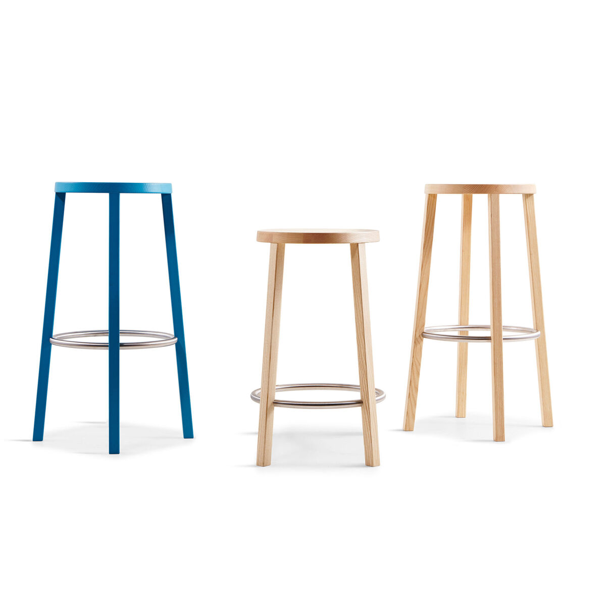 Collection of chair, armchair and stool designed by Naoto Fukasawa. Ash wooden structure - natural lacquered, black stained lacquered or colored with a matt open grain in grey, white and blue. Chair and armchair stackable. Ring stool in satin stainless steel. Versions : chair, armchair, stool.