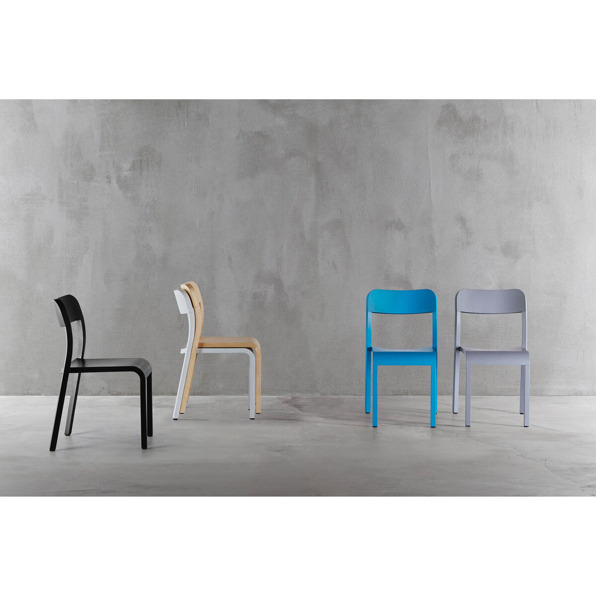 Collection of chair, armchair and stool designed by Naoto Fukasawa. Ash wooden structure - natural lacquered, black stained lacquered or colored with a matt open grain in grey, white and blue. Chair and armchair stackable. Ring stool in satin stainless steel. Versions : chair, armchair, stool.