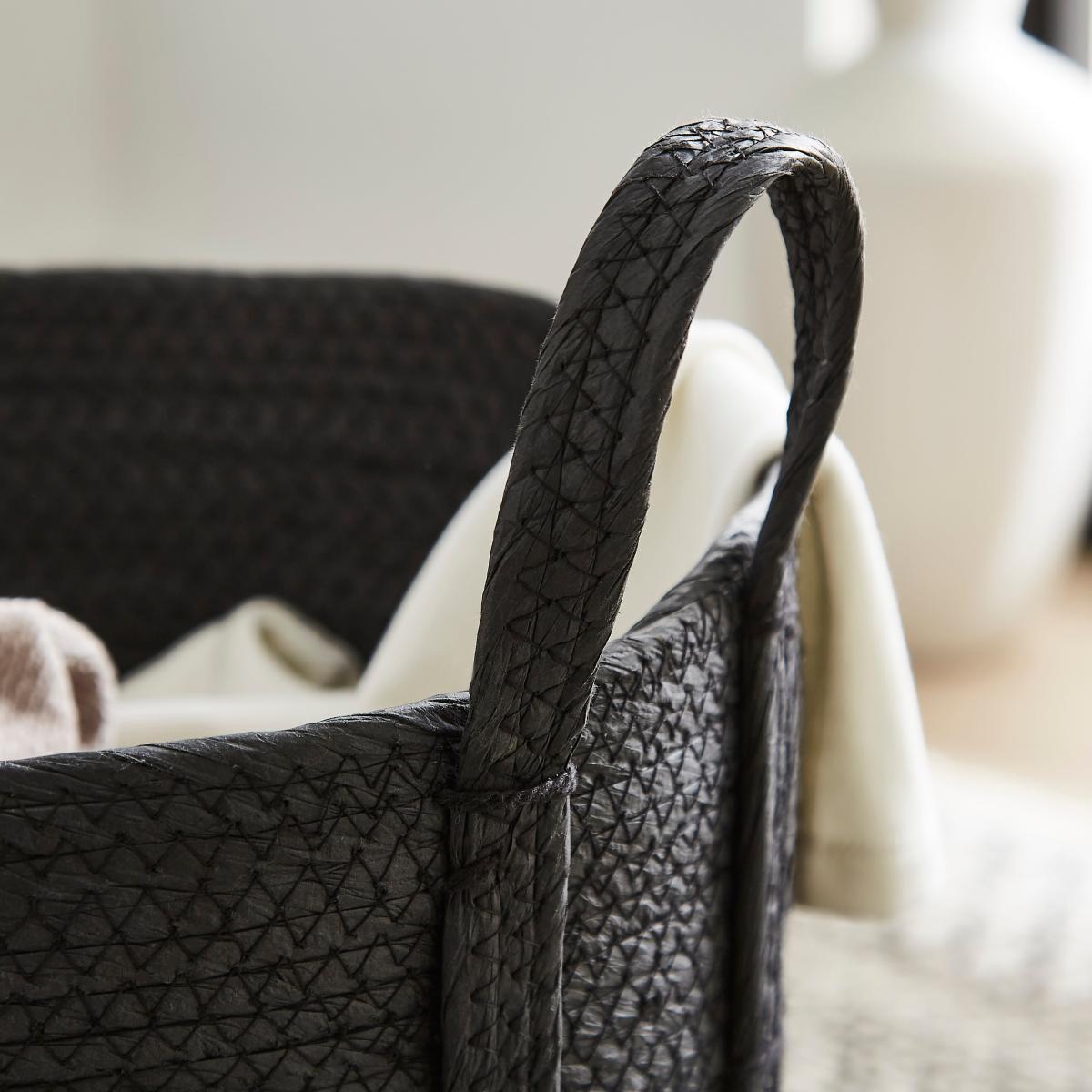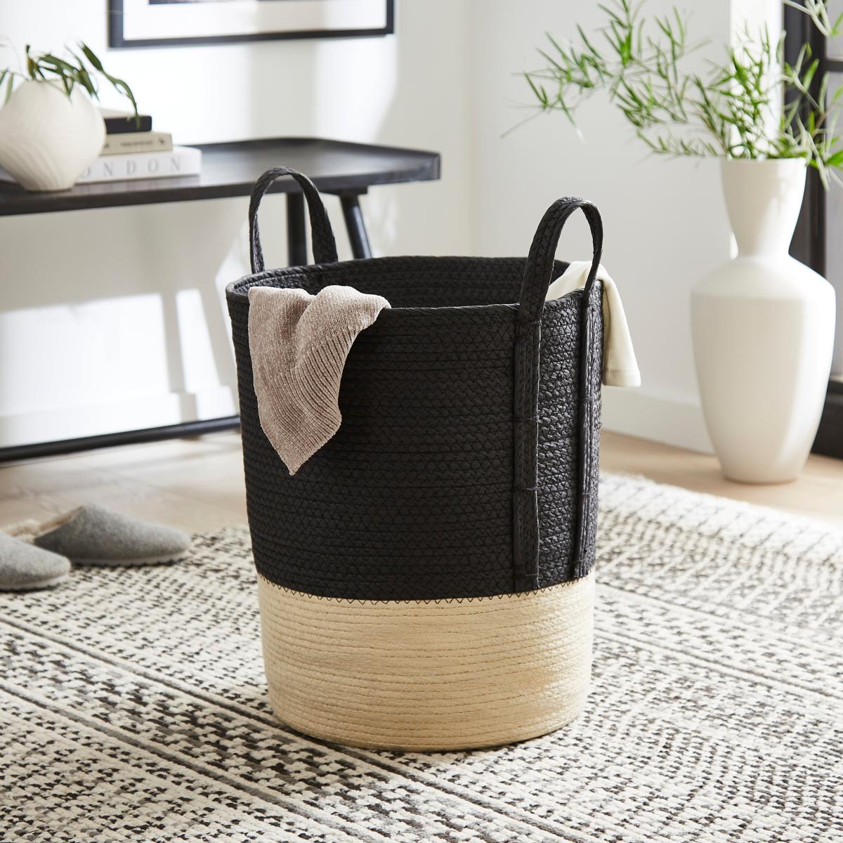I love this basket’s bold design, making it a great statement piece in any room. The block colour and sizeable form lend themselves well to modern or minimalist interiors, but it can also add a striking contrast in more eclectic settings. Its neutral palette ensures it’s versatile, whether placed in a living room for blankets, a bathroom for towels, or a nursery for toys. Practical styling tips include using it to define a designated storage area or to keep clutter out of sight while maintaining an organised aesthetic. Its large size makes it functional while contributing to a clean, streamlined look.