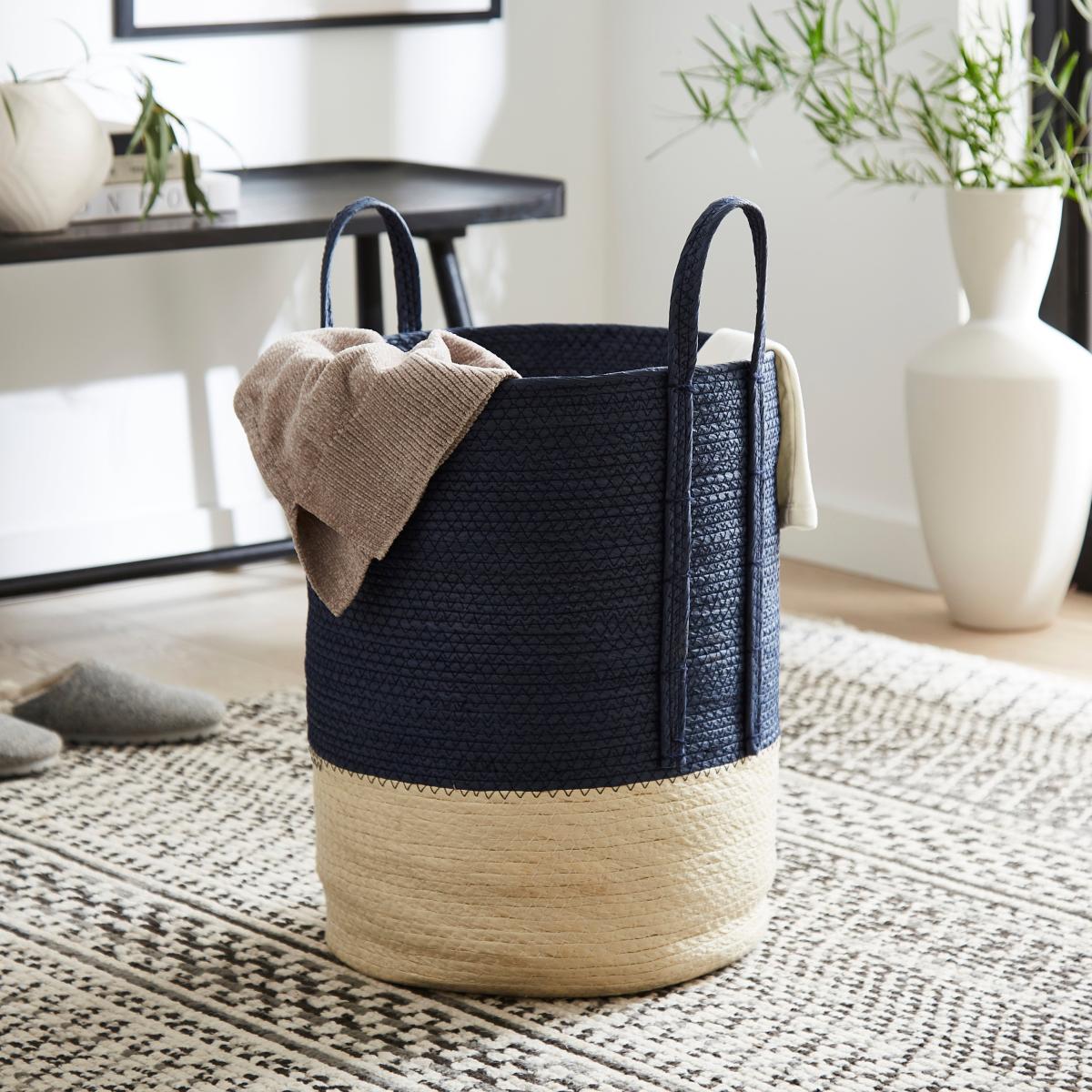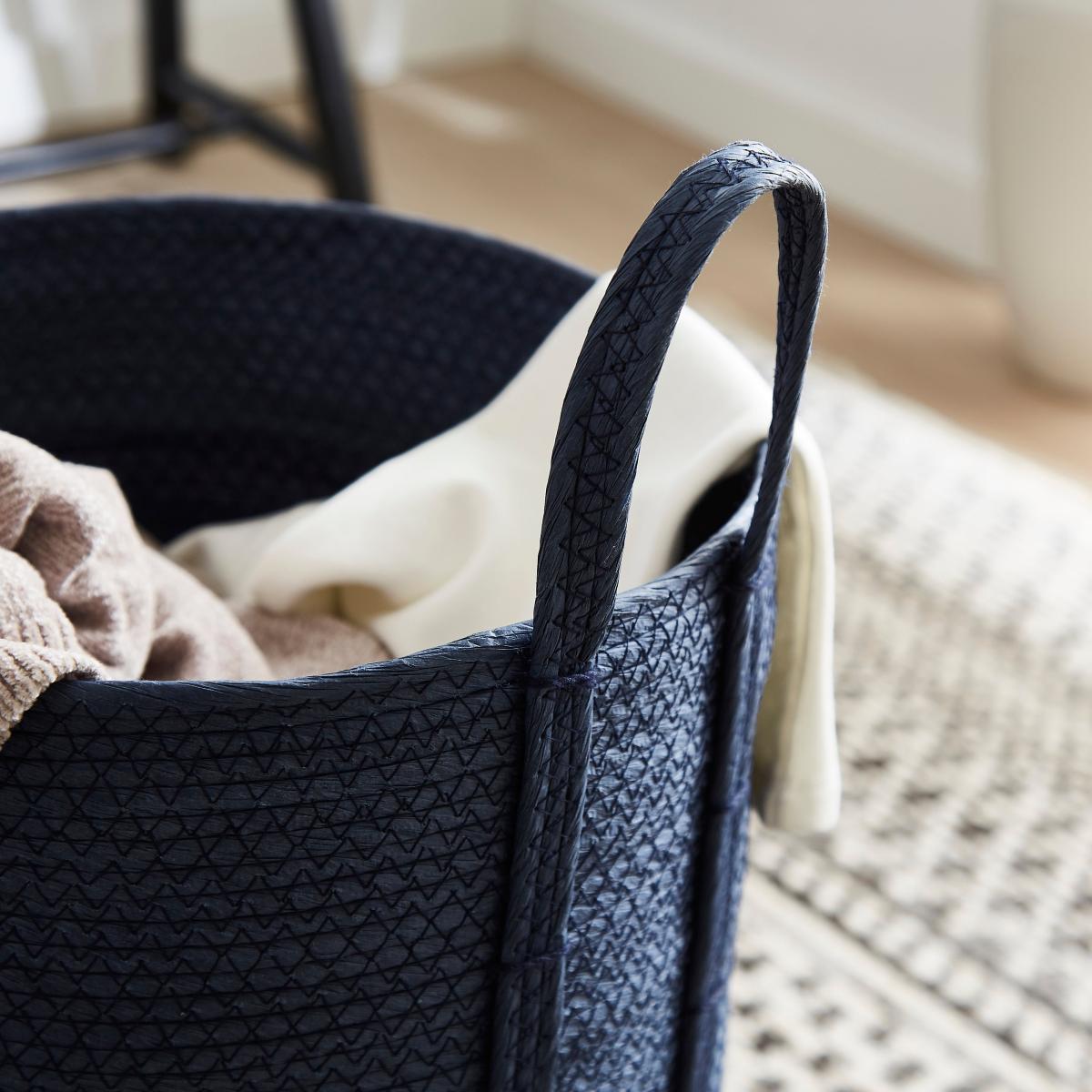 I love this big navy basket because of its clean, versatile look that works well in both contemporary and coastal-inspired interiors. Its substantial size makes it ideal for storage in living rooms, bedrooms, or utility areas-perfect for organising throws, magazines, or kids’ toys. A practical styling tip is to fold or drape textiles over the edge to add texture and visual interest, while pairing it with neutral or natural tones for a relaxed yet polished feel. Its deep navy hue adds a touch of colour without overpowering a space, making it a flexible choice for a variety of colour schemes.