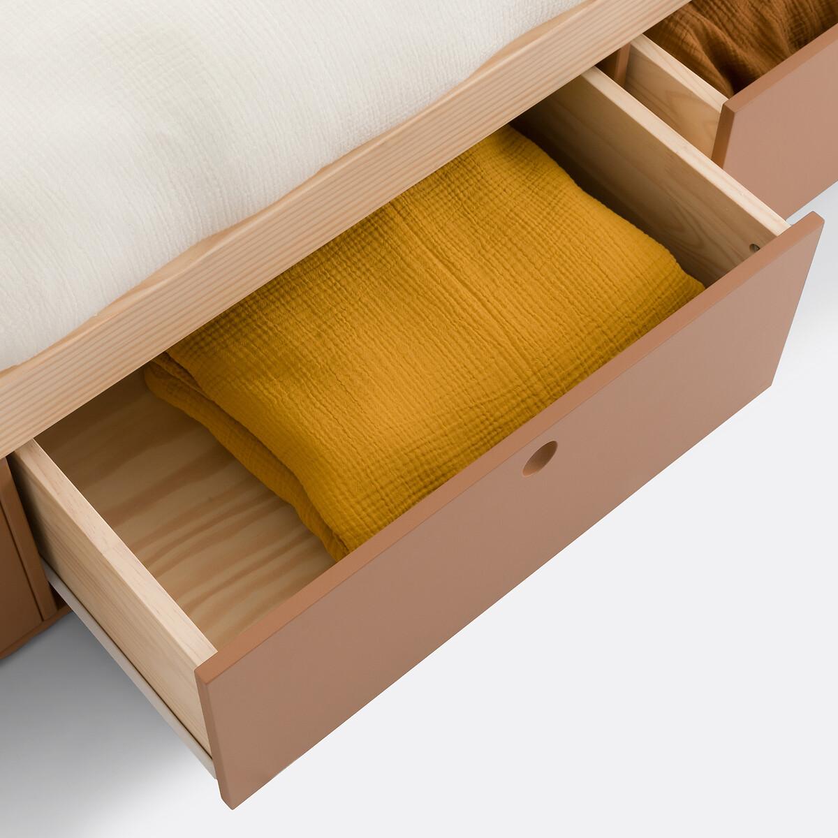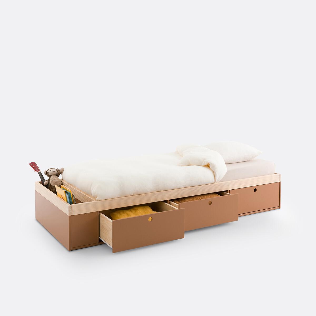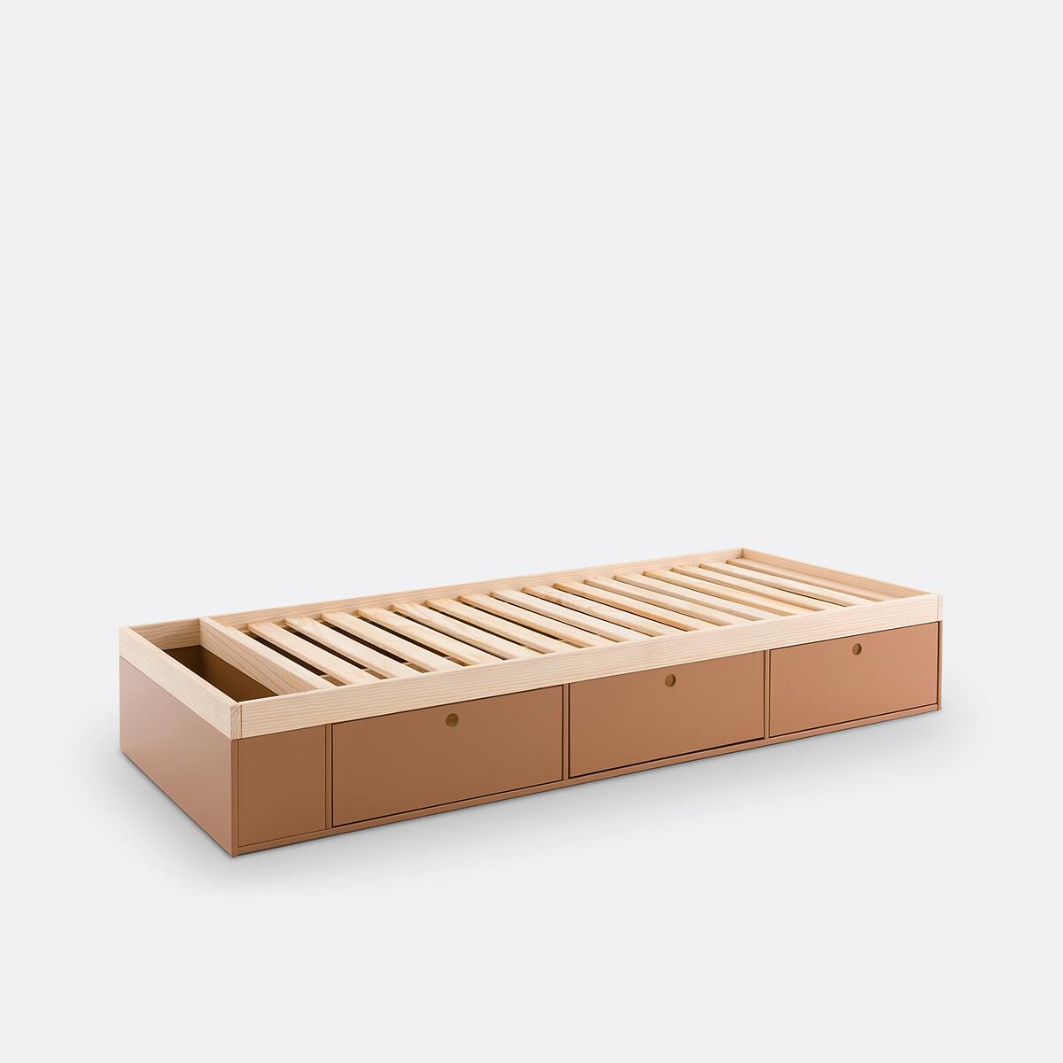 The Bloky bed is part of our Les Ingénieux collection. Creations full of ideas to make life simpler and everyday life more beautiful, imagined by our designers in France..Blocky, the cubed bed: For tidy rooms and deep sleep. Under its compact, cosy and contemporary design, it combines a storage bin and, under its bed base, 3 drawers. Why will you love it • 3 storage drawers under the bed frame • 1 storage bin at the end of the bed to keep books and toys within reach. Product Details • Solid pine • MDF drawers, acrylic paint • 1 storage bin at the foot of the bed • 3 drawers • Delivered with box spring frame with pine slats to screw onto the internal frame of the bed • Mattress not included. To move your bed, we advise you to lift it and not push or pull it. Quality Info • This product complies with current safety requirements. Dimensions Bed • Length: 218.5cm • Height: 35cm • Width: 96cm. Storage drawer • Depth: 47cm • Height: 19cm • Length: 60cm Cot size • Single 90 x 190cm • This product requires assembly. Dimensions and weight of parcel2 parcels • L110 x H60.8 x D15cm. 38.5kg • L230 x H31.8 x D12.7cm. 29kg