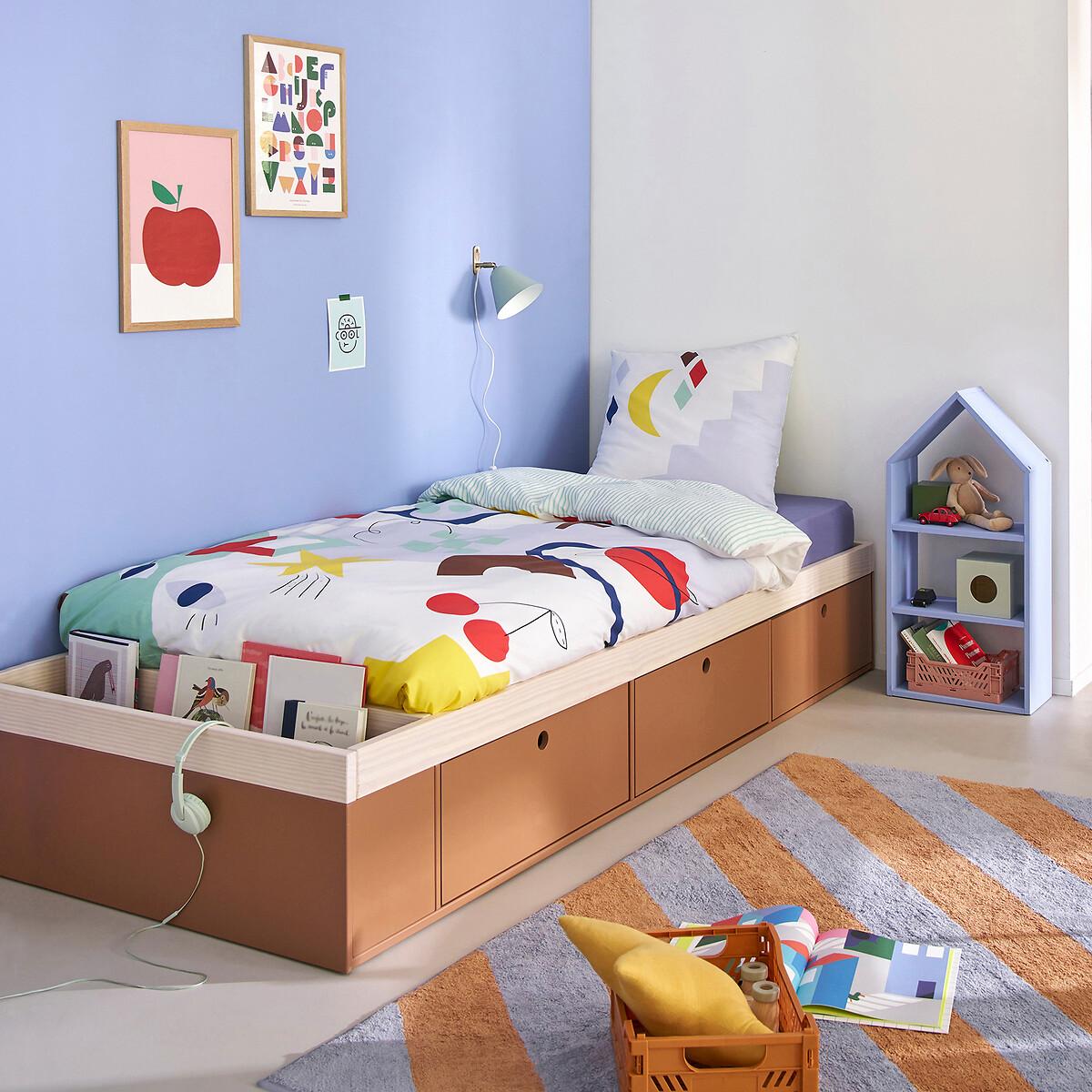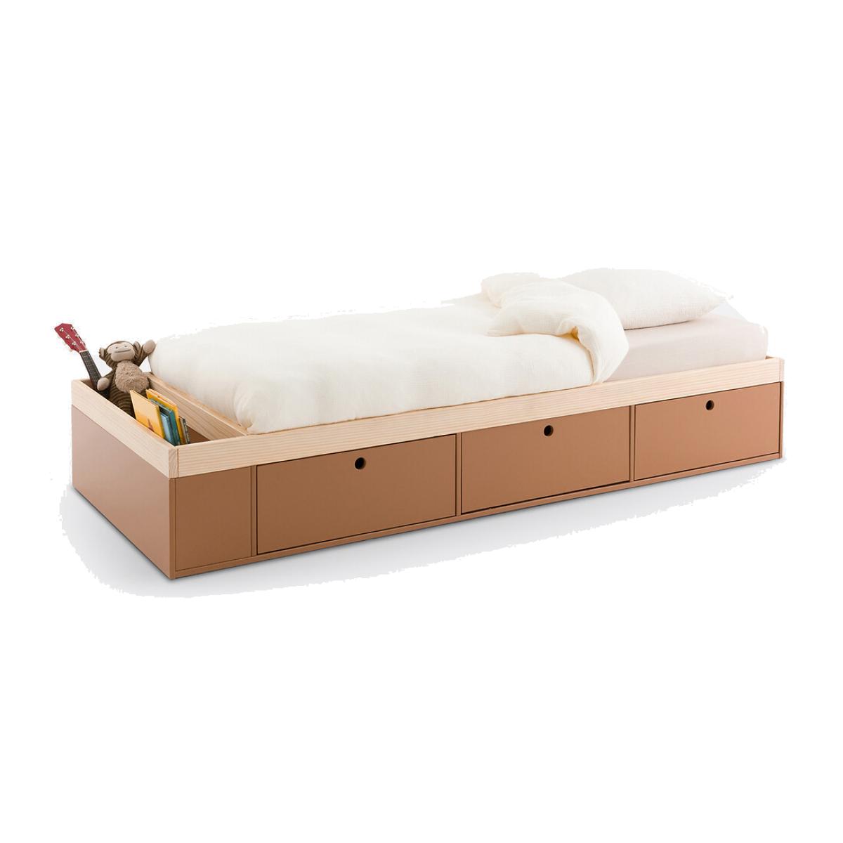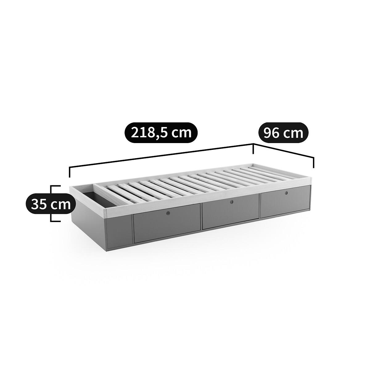 The Bloky bed is part of our Les Ingénieux collection. Creations full of ideas to make life simpler and everyday life more beautiful, imagined by our designers in France..Blocky, the cubed bed: For tidy rooms and deep sleep. Under its compact, cosy and contemporary design, it combines a storage bin and, under its bed base, 3 drawers. Why will you love it • 3 storage drawers under the bed frame • 1 storage bin at the end of the bed to keep books and toys within reach. Product Details • Solid pine • MDF drawers, acrylic paint • 1 storage bin at the foot of the bed • 3 drawers • Delivered with box spring frame with pine slats to screw onto the internal frame of the bed • Mattress not included. To move your bed, we advise you to lift it and not push or pull it. Quality Info • This product complies with current safety requirements. Dimensions Bed • Length: 218.5cm • Height: 35cm • Width: 96cm. Storage drawer • Depth: 47cm • Height: 19cm • Length: 60cm Cot size • Single 90 x 190cm • This product requires assembly. Dimensions and weight of parcel2 parcels • L110 x H60.8 x D15cm. 38.5kg • L230 x H31.8 x D12.7cm. 29kg