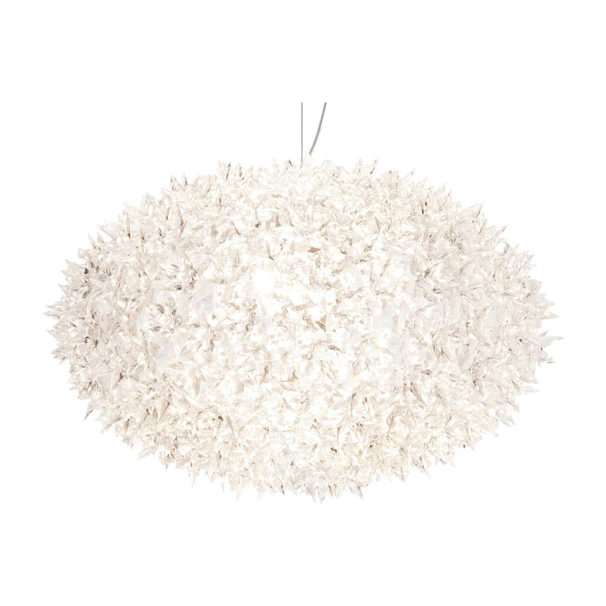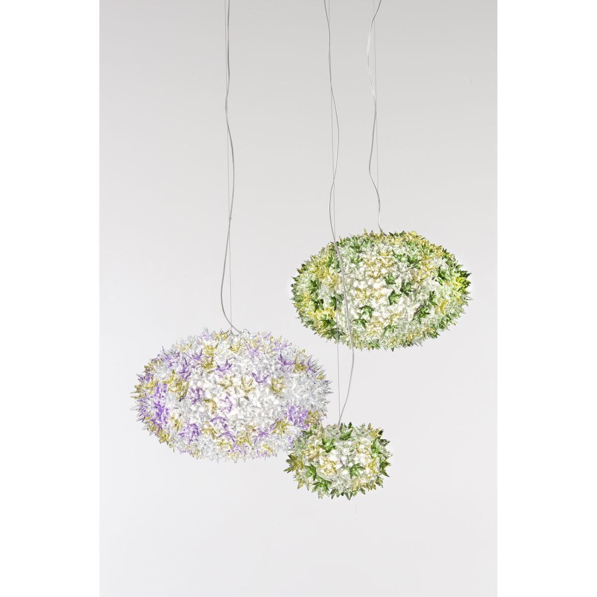A lamp as precious as Murano glass, as cheeky as rock opera – Bloom literally blooms like a splendid, sparking cascade of flowers! The lampshade (Ø 53 x H 35 cm) consists of a polycarbonate frame and lots of delicate, tiny flowers on it, resulting in an industrial object, yet stylistically complex and showing hand-crafted forms. Delicate as a spring bouquet, the Bloom pendant offers an incredible sparkling spectacle! The flowers multiply the light and enrich the beautiful sparkles! The material shines like real crystal… So chic! This subtle and light sculpture will make an original, strong visual presence in any room. Delivered disassembled, assembly required (very easy to undertake). The Bloom collection includes an oval-shaped pendant (Ø 45 x H 70 cm) and a round pendant, available in two sizes (Ø 28 cm and Ø 53 cm), a ceiling light and a wall lamp.