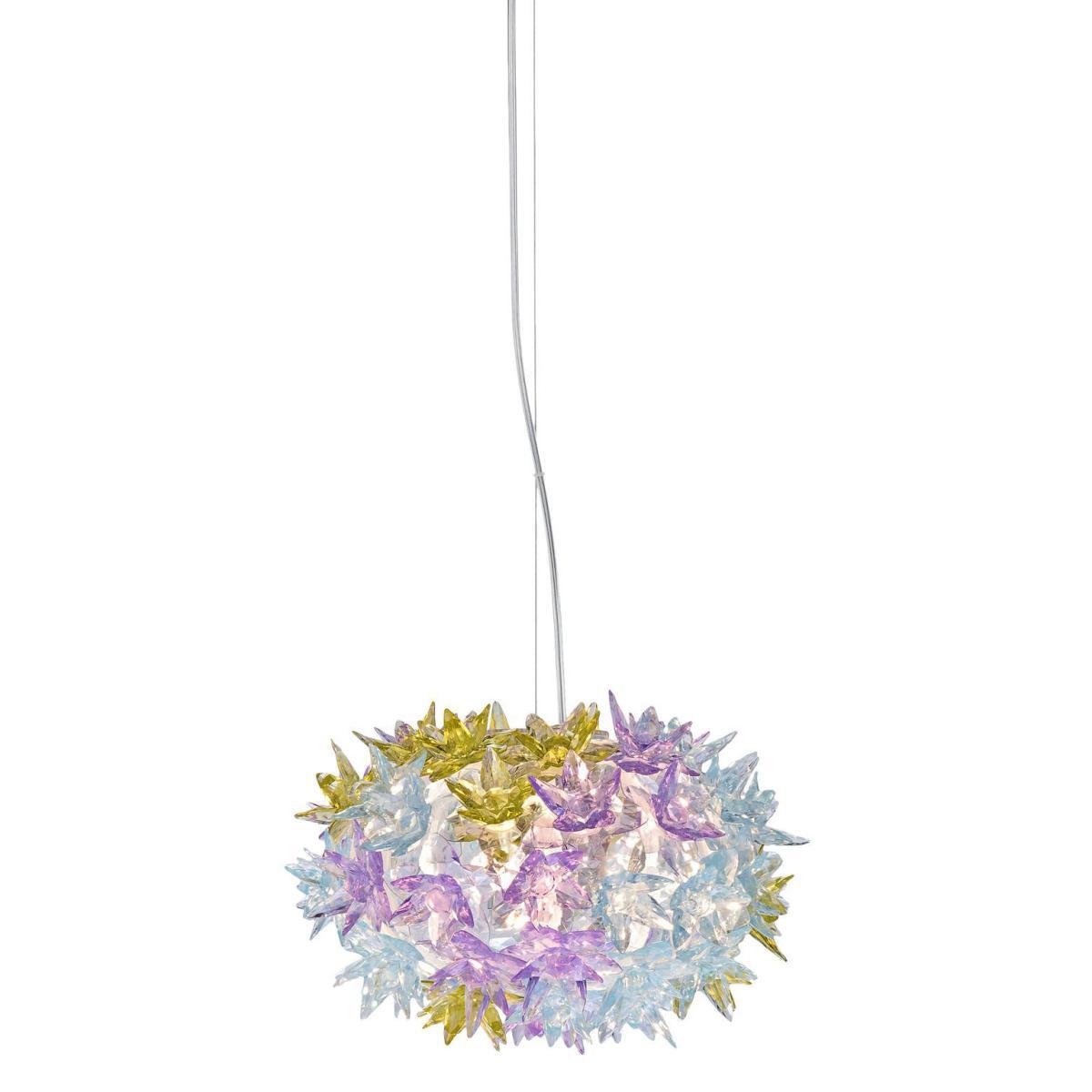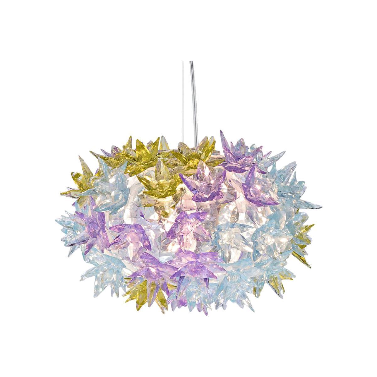 A lamp as precious as Murano glass, as irreverent as a rock opera - Bloom literally blooms in a scintillating and lavish cascade of crystal. Bloom is composed of a tubular polycarbonate framework entirely overlaid with a structure of tiny polycarbonate double corolla flowers. The result is a lamp produced industrially but with all the forms and complexities of a unique handcrafted piece. A series of tiny lights located within the skeletal structure beams light shafts through the petals to refract on the faceted surfaces of the petals and multiply a thousand reflections. Bloom is a new way of interpreting a traditional lamp with that added special touch. A work of art that can furnish and fill a room all by itself, creating that sparkling atmosphere of splendour.