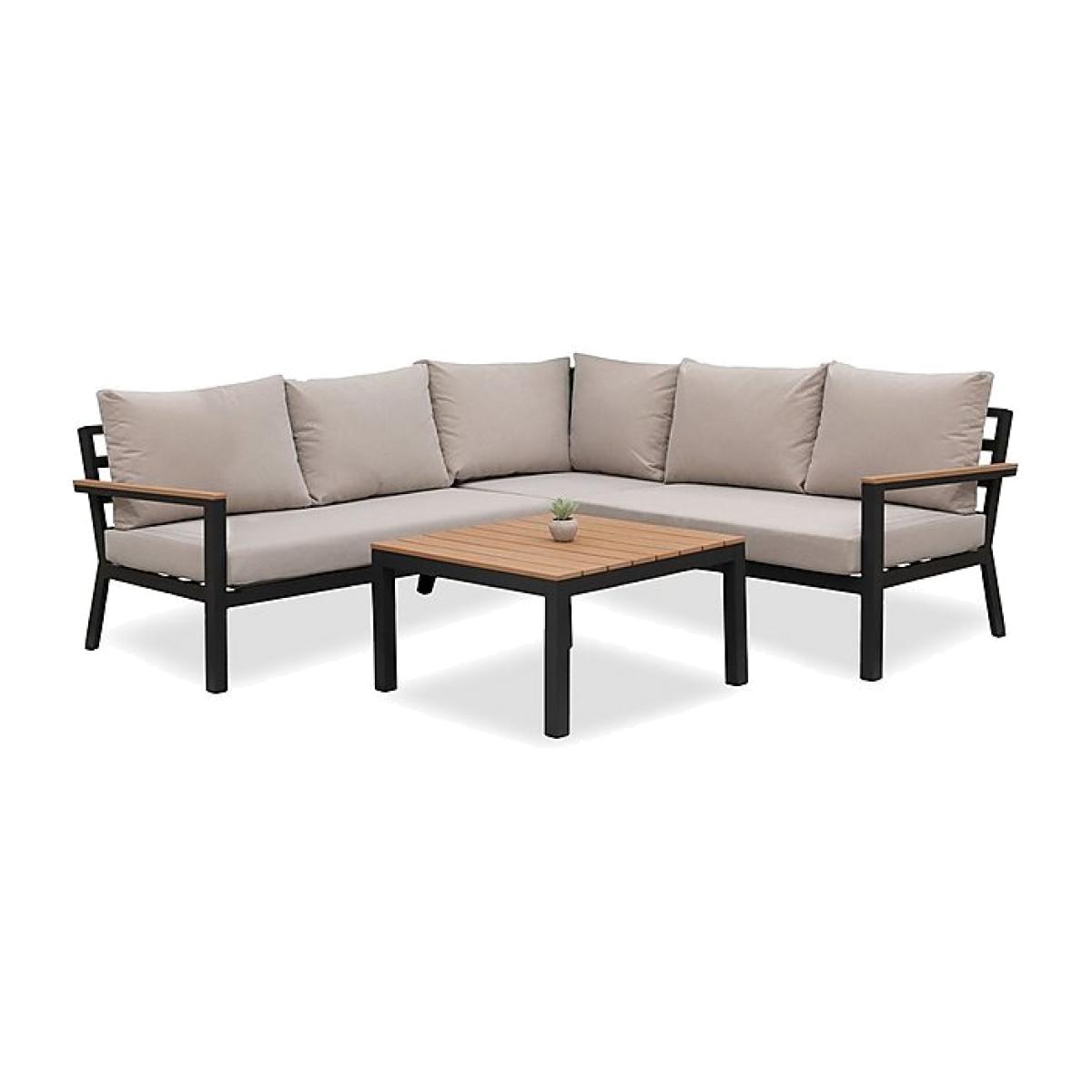 Make balmy evenings more sociable with this garden furniture set. The spacious corner sofa has plenty of room for friends and the square coffee table is the perfect place for a refreshing beverage. Why you'll love it Sophisticated, contemporary and versatile furniture for your garden. Low- maintenance finish, high- end outdoor style. This set includes a corner sofa and a square coffee table. Weatherproof aluminium frames are finished in a fashionable dark grey. Wook- like table top and arm accents are made from Polywood. Made from recycled plastics, Polywood is eco- friendly and so easy to look after. It’s very durable and highly resistant to rot and splintering. Designed to withstand prolonged exposure to UV light without fading or degrading. Showerproof cushions are covered in a hardwearing recycled polyester fabric. The corner sofa is available with the short end on either left- hand or right- hand side. 2- year frame guarantee. This garden corner sofa and coffee table set is part of the Bloom range. What you need to know Made with aluminium and Polywood. Cushions should be stored indoors during wet weather and when not in use. Self- assembly required.