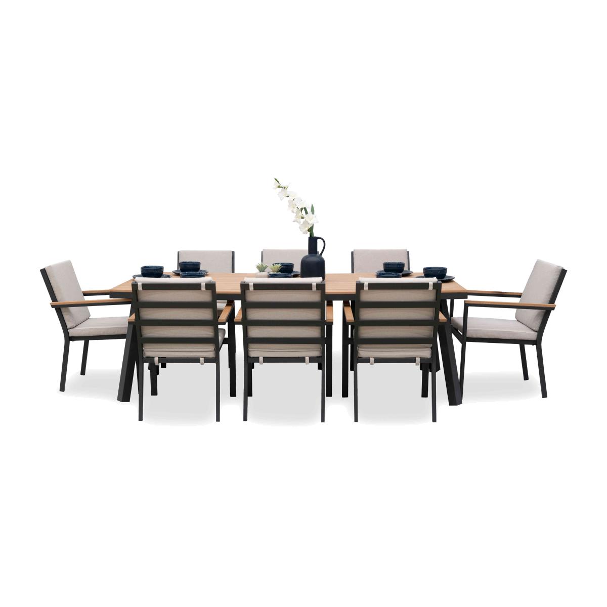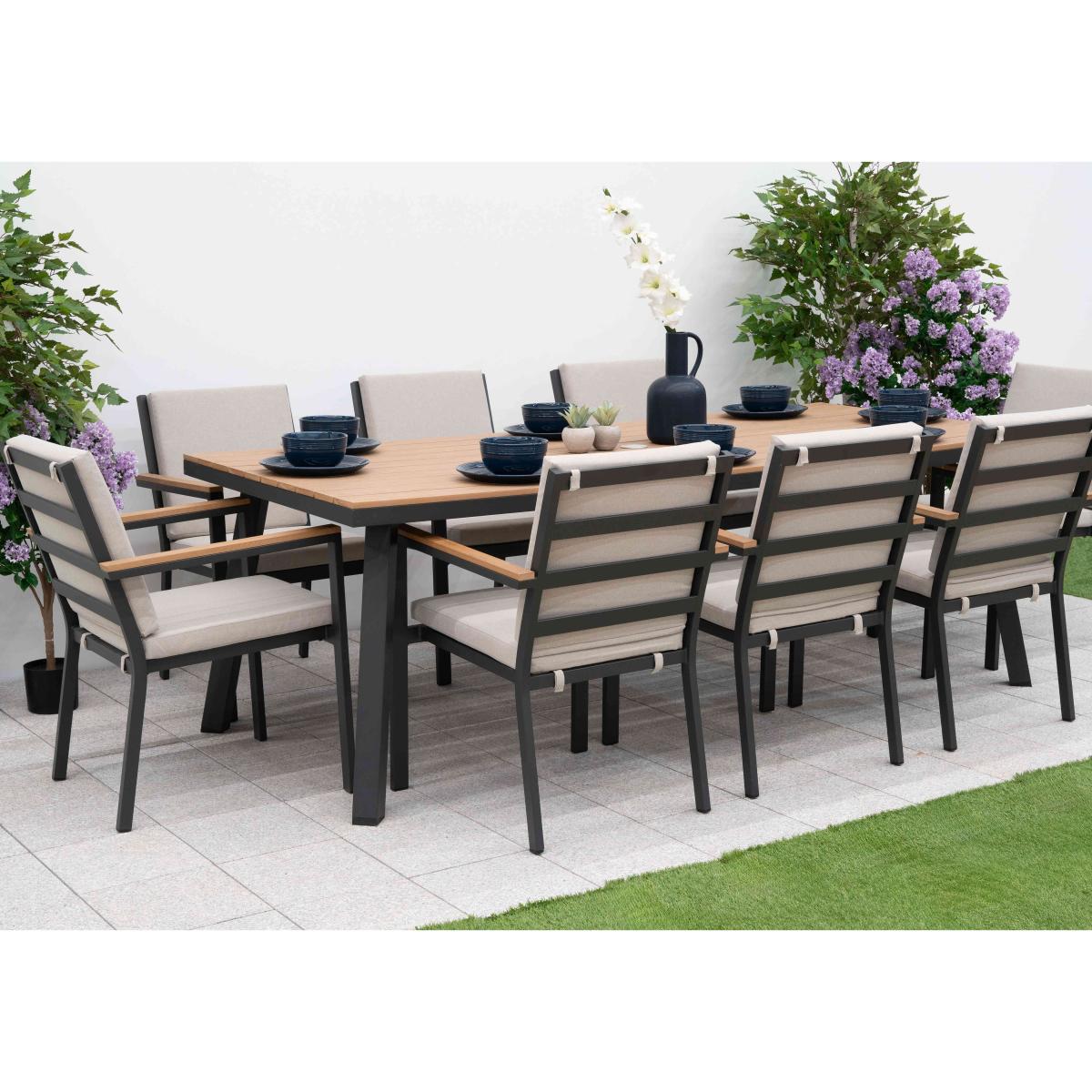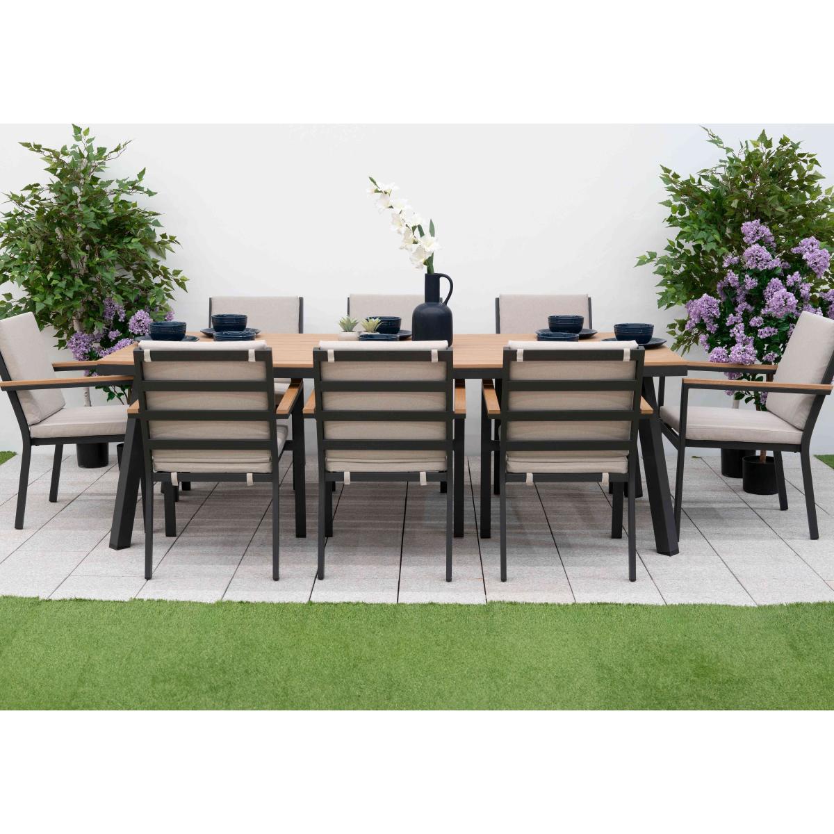 Turn your garden into a stylish place to dine with this contemporary-style outdoor dining set finished in dark grey. Durable construction and low maintenance finish make it even more appealing. Why you'll love it Sophisticated, contemporary and versatile furniture for your garden. Low-maintenance finish, high-end outdoor style. This outdoor dining set includes a rectangular dining table and 8 dining chairs. Weatherproof aluminium frames are finished in a fashionable dark grey. Wook-like table top and arm accents are made from Polywood. Made from recycled plastics, Polywood is eco-friendly and so easy to look after. It’s very durable and highly resistant to rot and splintering. Designed to withstand prolonged exposure to UV light without fading or degrading. Showerproof cushions are covered in a hardwearing recycled polyester fabric. 2-year frame guarantee. This garden dining set is part of the Bloom range. What you need to know Made with aluminium and Polywood. Cushions should be stored indoors during wet weather and when not in use. Self-assembly required. Item code: BLOO8ST---001