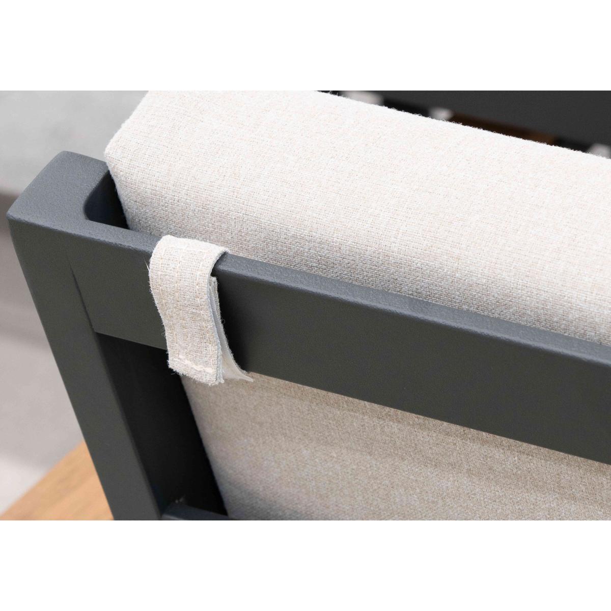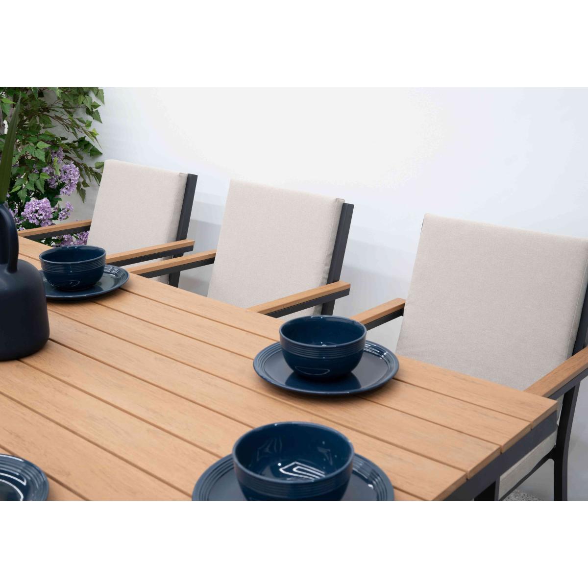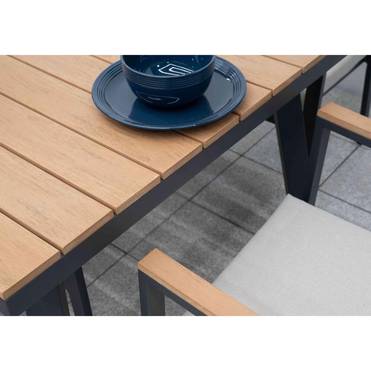 Turn your garden into a stylish place to dine with this contemporary-style outdoor dining set finished in dark grey. Durable construction and low maintenance finish make it even more appealing. Why you'll love it Sophisticated, contemporary and versatile furniture for your garden. Low-maintenance finish, high-end outdoor style. This outdoor dining set includes a rectangular dining table and 8 dining chairs. Weatherproof aluminium frames are finished in a fashionable dark grey. Wook-like table top and arm accents are made from Polywood. Made from recycled plastics, Polywood is eco-friendly and so easy to look after. It’s very durable and highly resistant to rot and splintering. Designed to withstand prolonged exposure to UV light without fading or degrading. Showerproof cushions are covered in a hardwearing recycled polyester fabric. 2-year frame guarantee. This garden dining set is part of the Bloom range. What you need to know Made with aluminium and Polywood. Cushions should be stored indoors during wet weather and when not in use. Self-assembly required. Item code: BLOO8ST---001