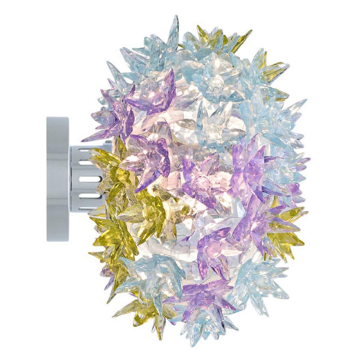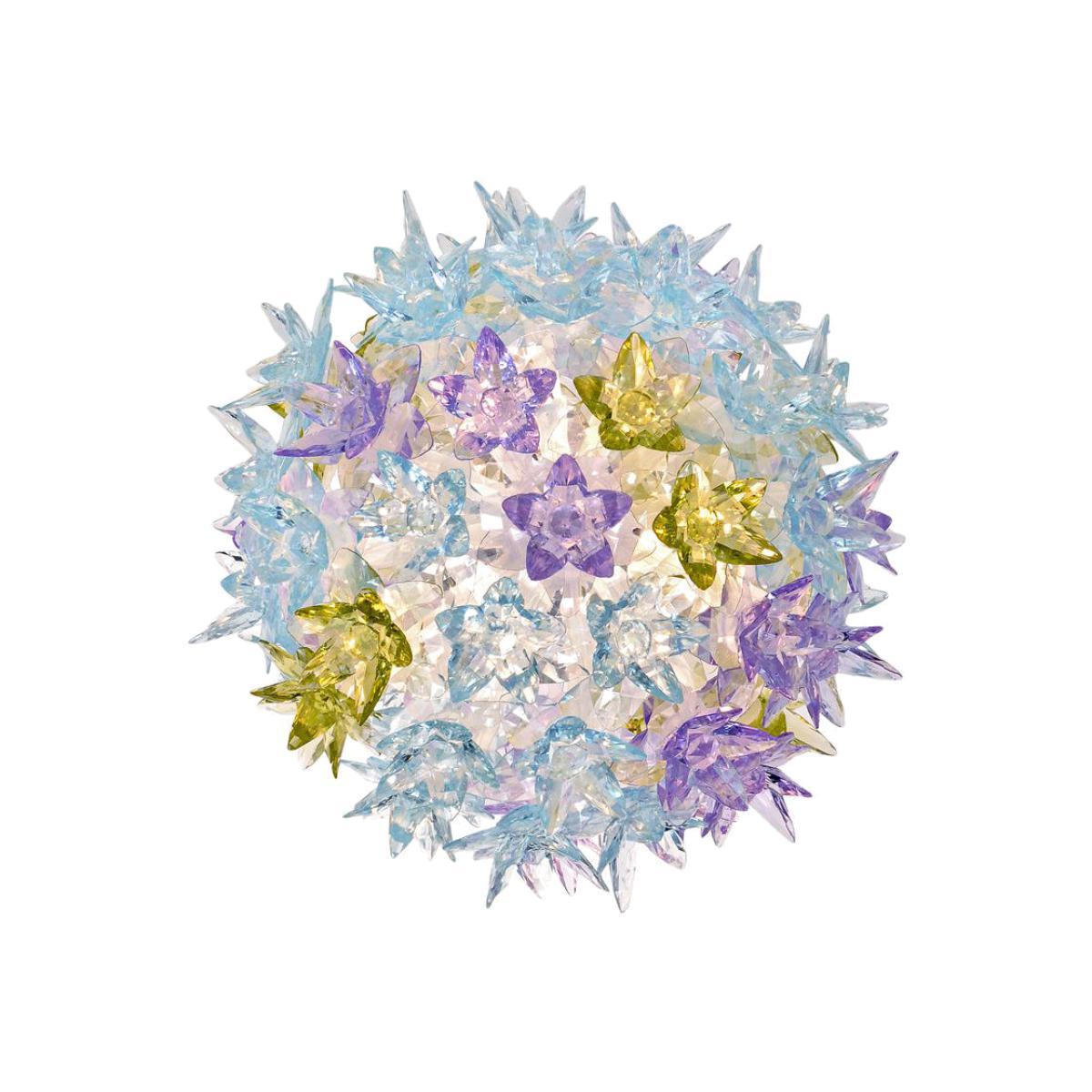 A lamp as precious as Murano glass, as irreverent as a rock opera - Bloom literally blooms in a scintillating and lavish cascade of crystal. Bloom is composed of a tubular polycarbonate framework entirely overlaid with a structure of tiny polycarbonate double corolla flowers. The result is a lamp produced industrially but with all the forms and complexities of a unique handcrafted piece. A series of tiny lights located within the skeletal structure beams light shafts through the petals to refract on the faceted surfaces of the petals and multiply a thousand reflections. Bloom is a new way of interpreting a traditional lamp with that added special touch. A work of art that can furnish and fill a room all by itself, creating that sparkling atmosphere of splendour.