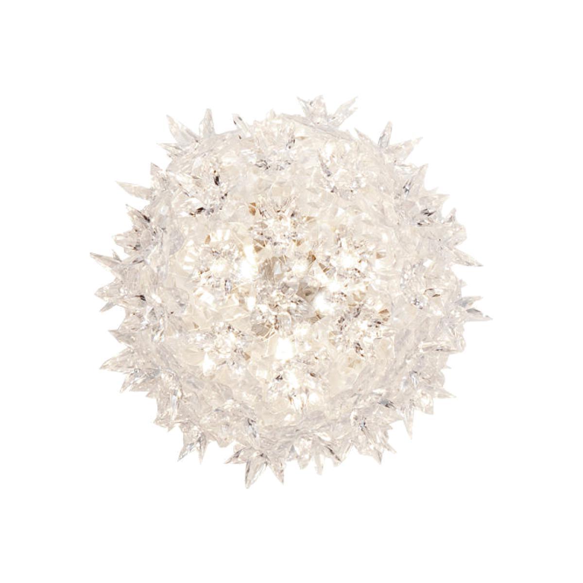 A lamp as precious as Murano glass, as irreverent as a rock opera - Bloom literally blooms in a scintillating and lavish cascade of crystal. Bloom is composed of a tubular polycarbonate framework entirely overlaid with a structure of tiny polycarbonate double corolla flowers. The result is a lamp produced industrially but with all the forms and complexities of a unique handcrafted piece. A series of tiny lights located within the skeletal structure beams light shafts through the petals to refract on the faceted surfaces of the petals and multiply a thousand reflections. Bloom is a new way of interpreting a traditional lamp with that added special touch. A work of art that can furnish and fill a room all by itself, creating that sparkling atmosphere of splendour.