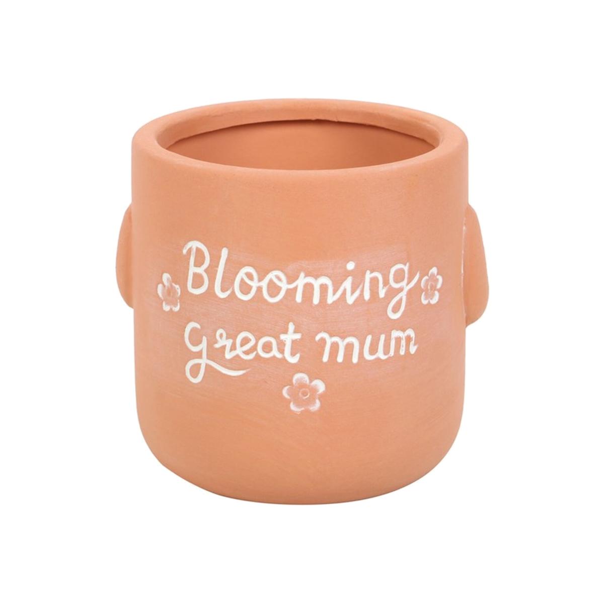 This quirky plant pot will be a welcome companion to any small house plant. Features adorable dangly legs that sit perfectly over a shelf or ledge and 'Blooming Great Mum' text on the back. Plant not included.
