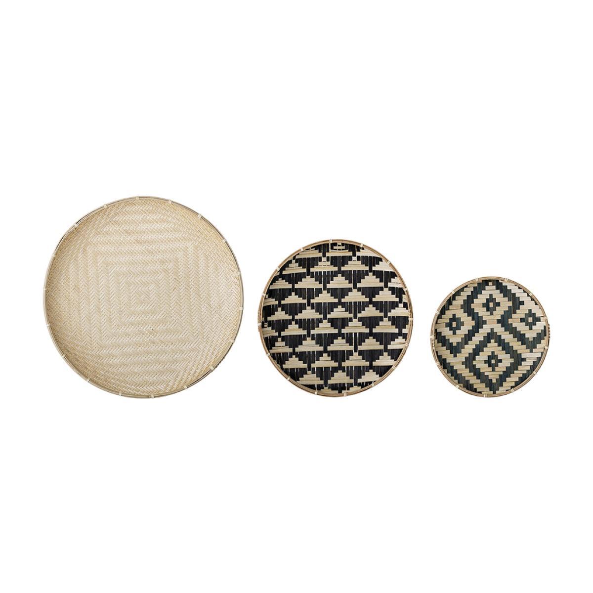 Dress your walls with these Bamboo Wall Baskets from Bloomingville. With three different patterns, this beautiful set will instantly refresh your home. Made from bamboo, place them individually or display them together in a cluster. Key features: * Set of three * Material: bamboo * Dimensions: * 1 x D30xH3cm * 1 x D39xH5.5cm * 1 x D50xH6cm * Black and natural shades