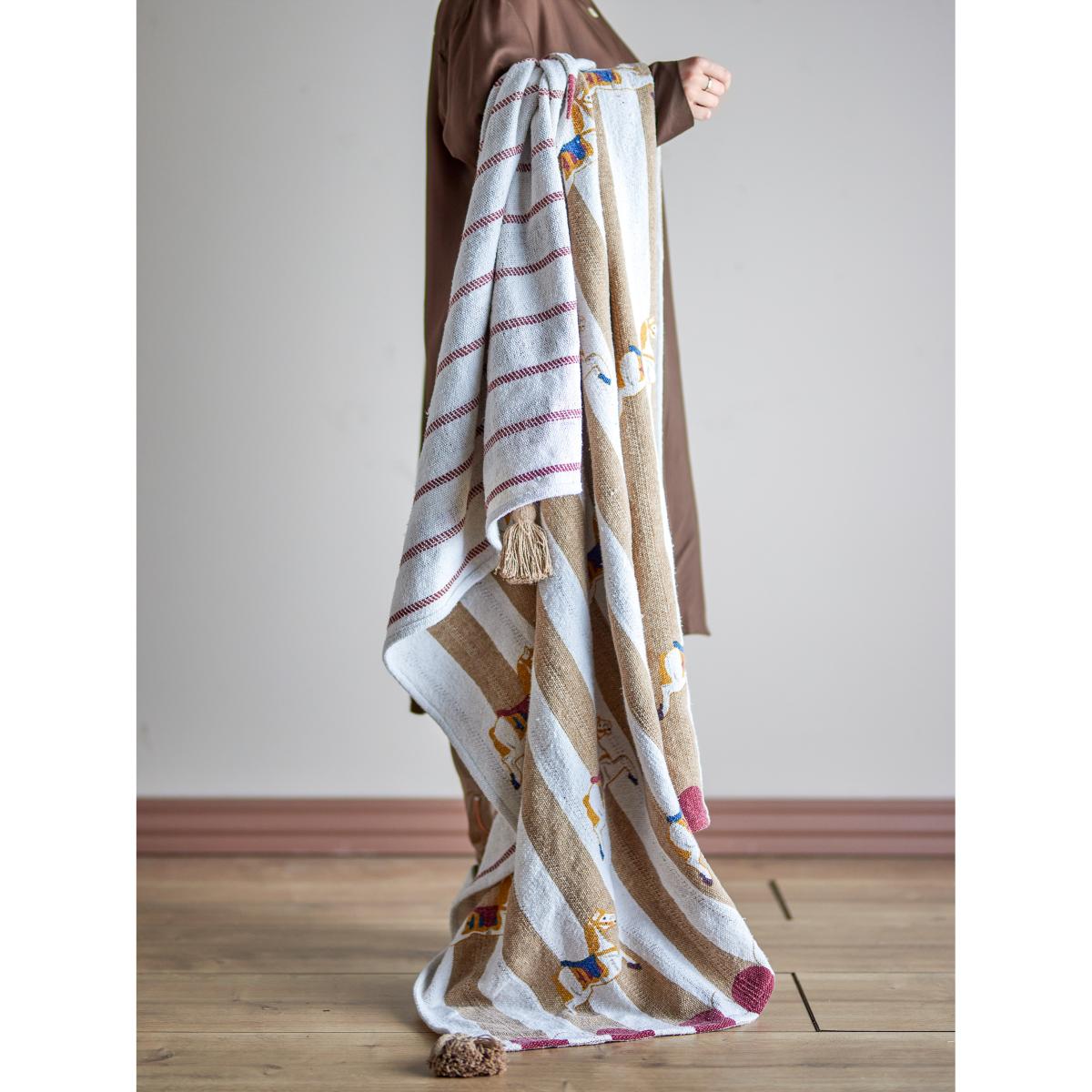 I love this blanket for its playful yet cosy aesthetic, making it a great addition to both children’s rooms and more relaxed living spaces. The design, with its neutral tones and charming merry-go-round motif, strikes a lovely balance between whimsy and sophistication-perfect for adding warmth without overwhelming other decor elements. It works particularly well layered over neutral sofas or beds, where it can serve as an inviting accent piece. Practical styling tips include folding it neatly with the tassels showing for a tactile detail or draping it casually over a sofa to introduce colour and texture effortlessly. Additionally, its soft fabric makes it versatile for snuggling up during colder months while maintaining a pleasing visual appeal.