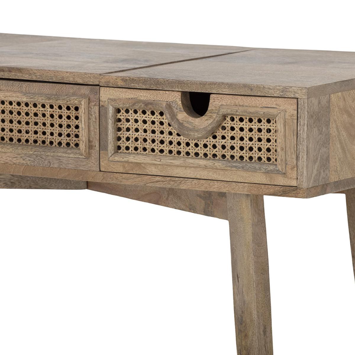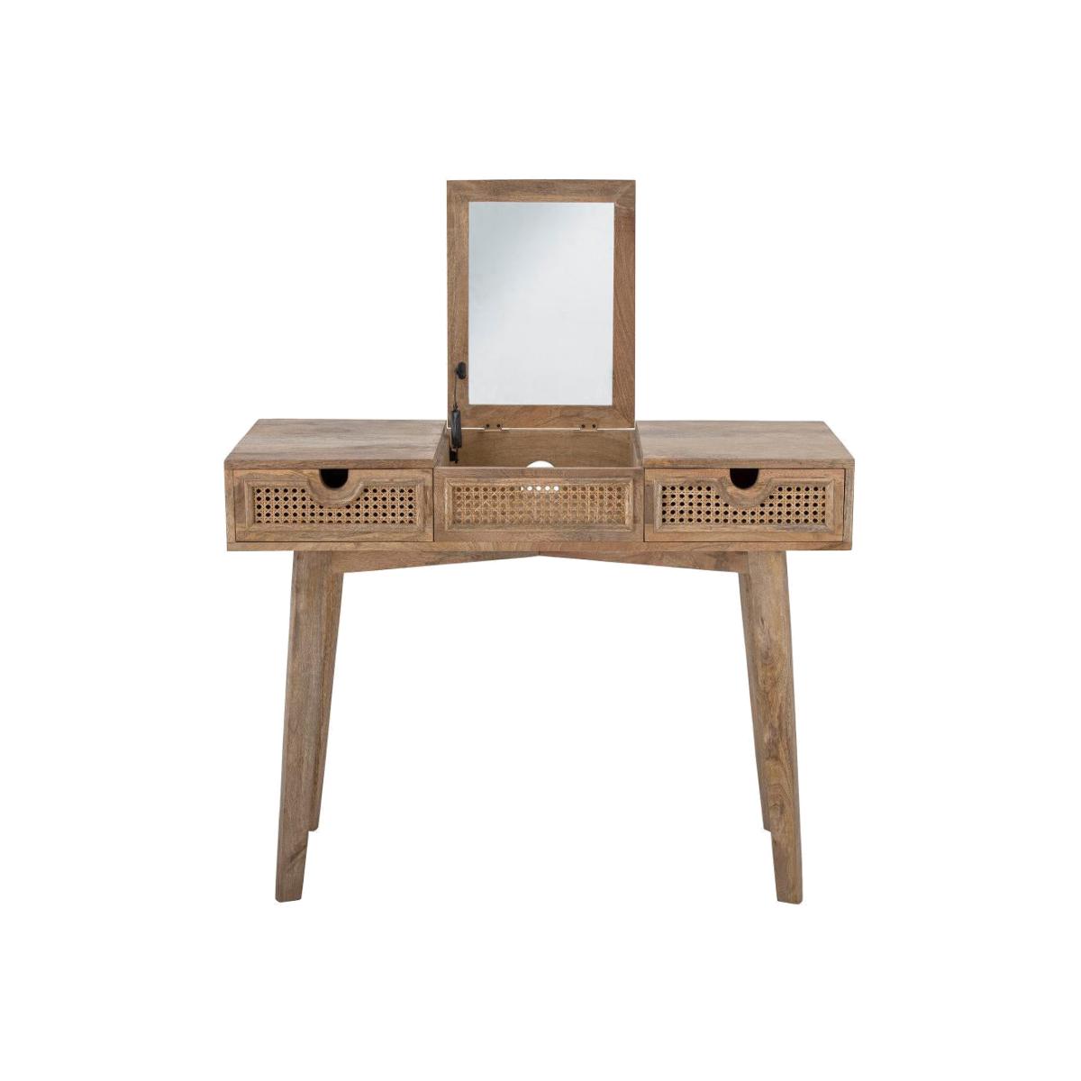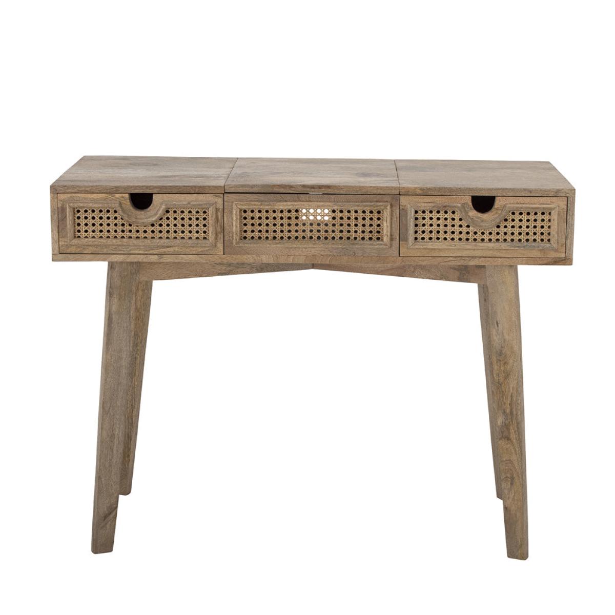 The Perth Console Table by Bloomingville will become an essential piece in your bedroom. It features a beautiful mirror and a mix of Mango Wood, MDF and Cane in a natural color, along with two practical drawers. Use the table as a make-up table or as a desk. Store the mirror inside the table, for a 2-in-1 solution. Dimensions: H: 76 x W: 45 x D: 102 cm Materials: Mango Wood Assembly Required: Y Care Instructions:Wipe clean with a damp cloth. No harsh abrasives or cleaners.
