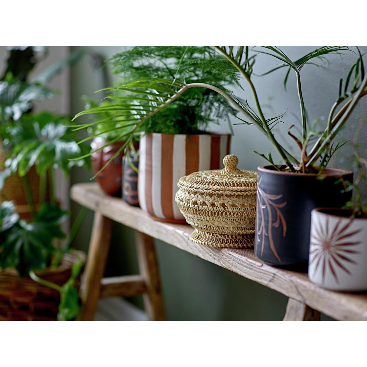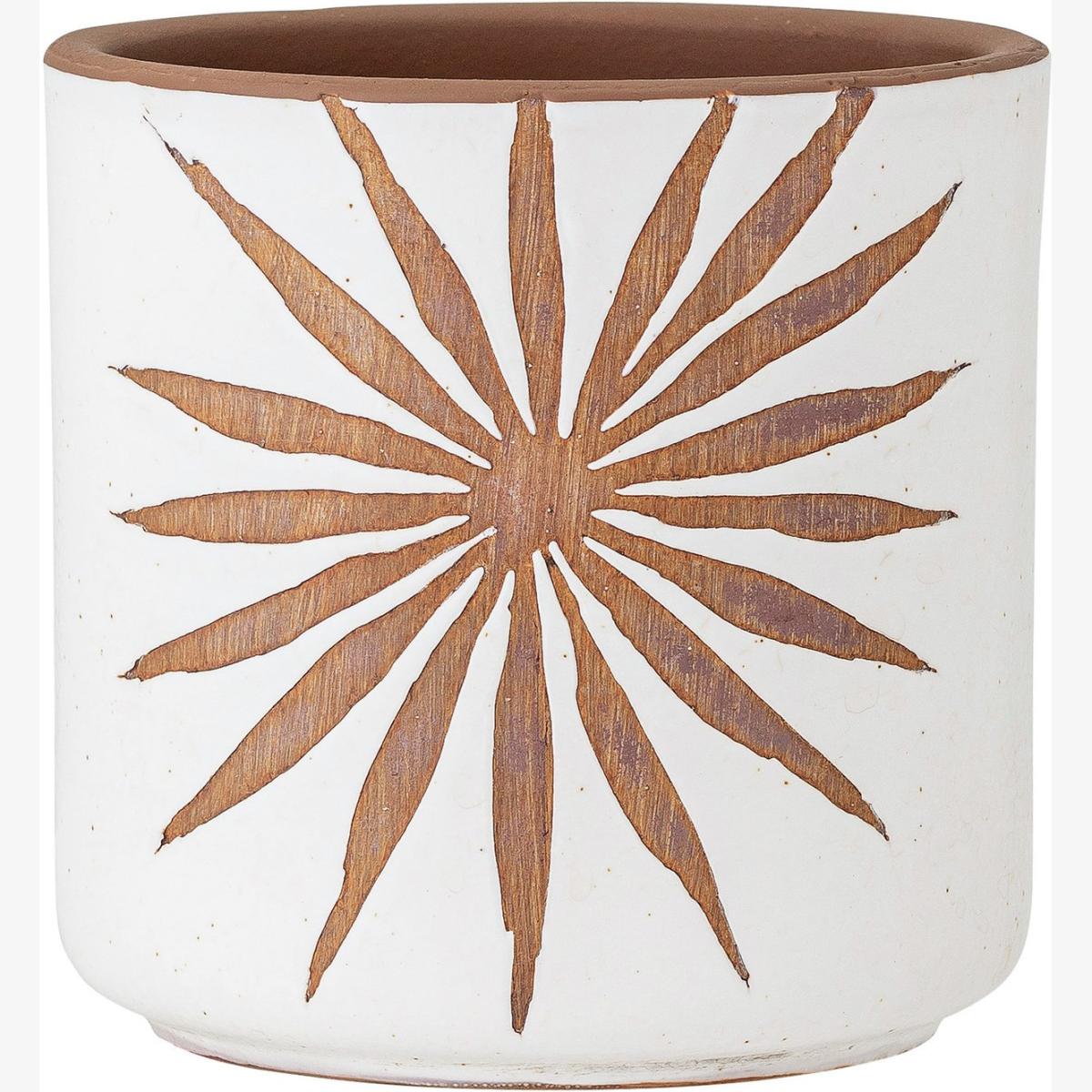 The Idris Flowerpot by Bloomingville is the ideal container for your plants. It is a unique piece in terracotta, with a beautiful design that resembles a flower on a white background. Due to the nature of the glaze and it is handcrafted, it may not be 100% waterproof, and color variations may occur. Its handcrafted nature ensures no two pieces are exactly alike, contributing to its individual charm. Size H12,. Diameter 12cm.