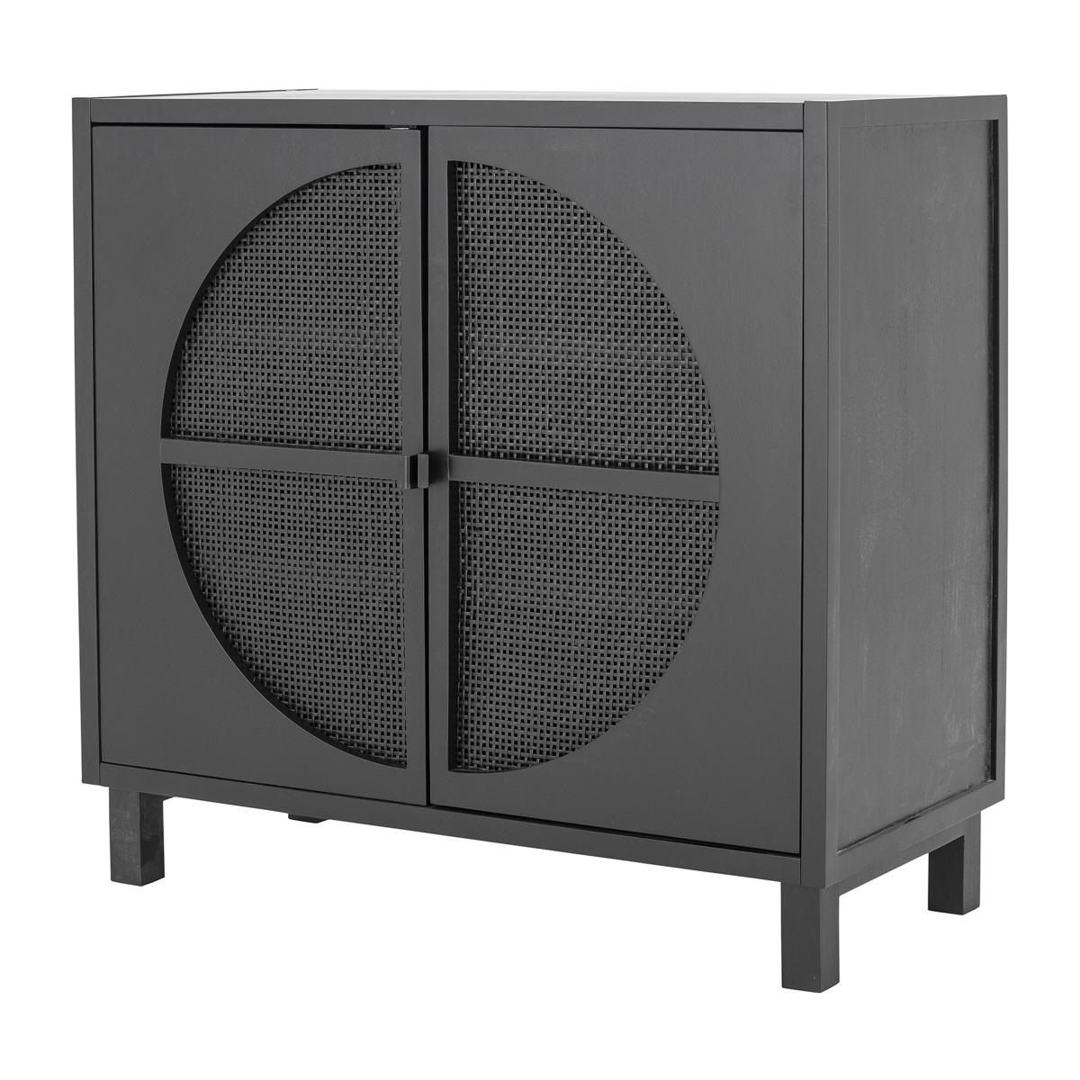 I really like this piece because of its sleek, modern silhouette combined with the distinctive circular detailing on the doors, which adds visual interest without overwhelming the space. It works particularly well in contemporary or minimalist interiors, providing both style and storage in a compact footprint. For styling tips, consider pairing it with matte or textured accessories in neutral or contrasting colours to highlight its black finish. Practical use could include living rooms for media storage, dining areas for crockery, or even outdoor spaces if it’s suitable for weather resistance. Keep accessories simple inside to keep it looking streamlined and let the unique design be the focal point.