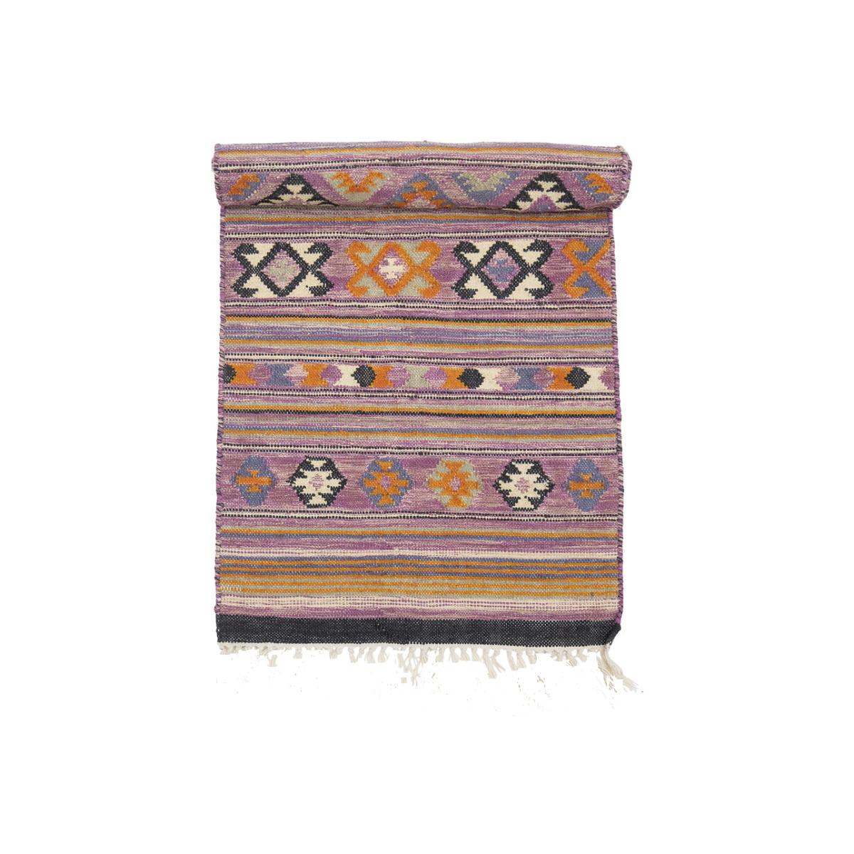 I love this rug because of its vibrant purple hue and the lively, geometric pattern that adds visual interest without overwhelming a space. It works particularly well in eclectic, boho, or modern interiors that benefit from a splash of colour and personality. When styling, consider pairing it with neutral or muted furnishings to make the colours pop, or layer it over a larger plain rug for added texture. Practical tips include placing it in a living area or bedroom where it can serve as a cosy focal point, and choosing furniture with simple lines to let the rug stand out. Its manageable size makes it versatile for different room layouts, making it a playful yet functional addition to many interiors.