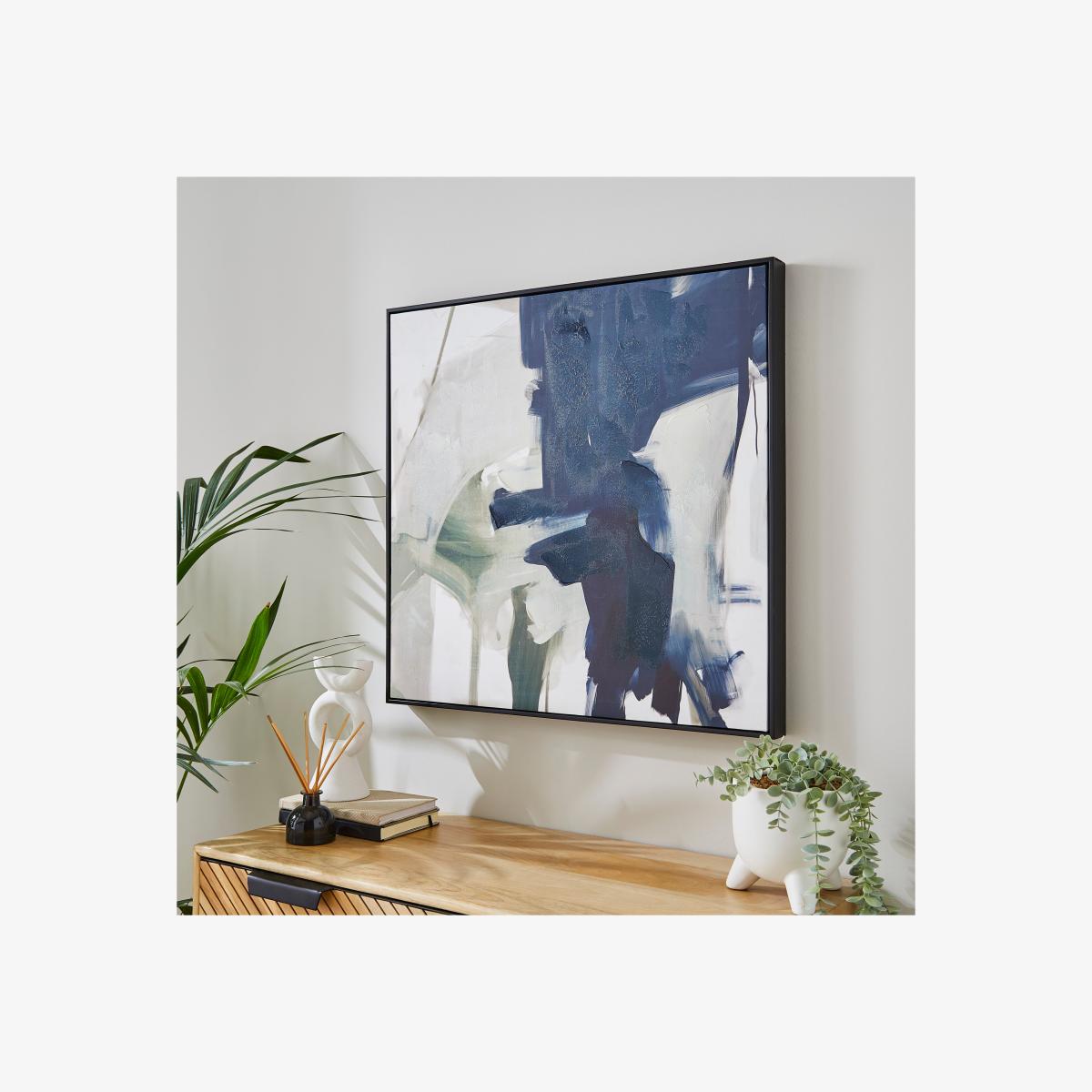 **The Edited Life** – Blue Abstract Framed Canvas * Simple abstract design * Blue and white hues * Modern black frame * Partly hand painted This canvas carries a modern abstract design in blues and whites and has been partly hand painted for a beautiful finish. It’s a great way to add colour and interest to your walls and comes complete with a modern black frame. Live well. Mean well. Be well. Many of us want to live simpler, more responsible lives. As we become more aware of our surroundings and understand how our choices contribute to the world around us, more people are choosing to consume less and curate more. The Edited Life introduces a new era of thoughtfulness in the home, with an understated collection of pieces chosen for their simple beauty, quality craftsmanship and innate usefulness that will last beyond any trend. Having it all is no longer the goal; having enough, and it being just right, is.