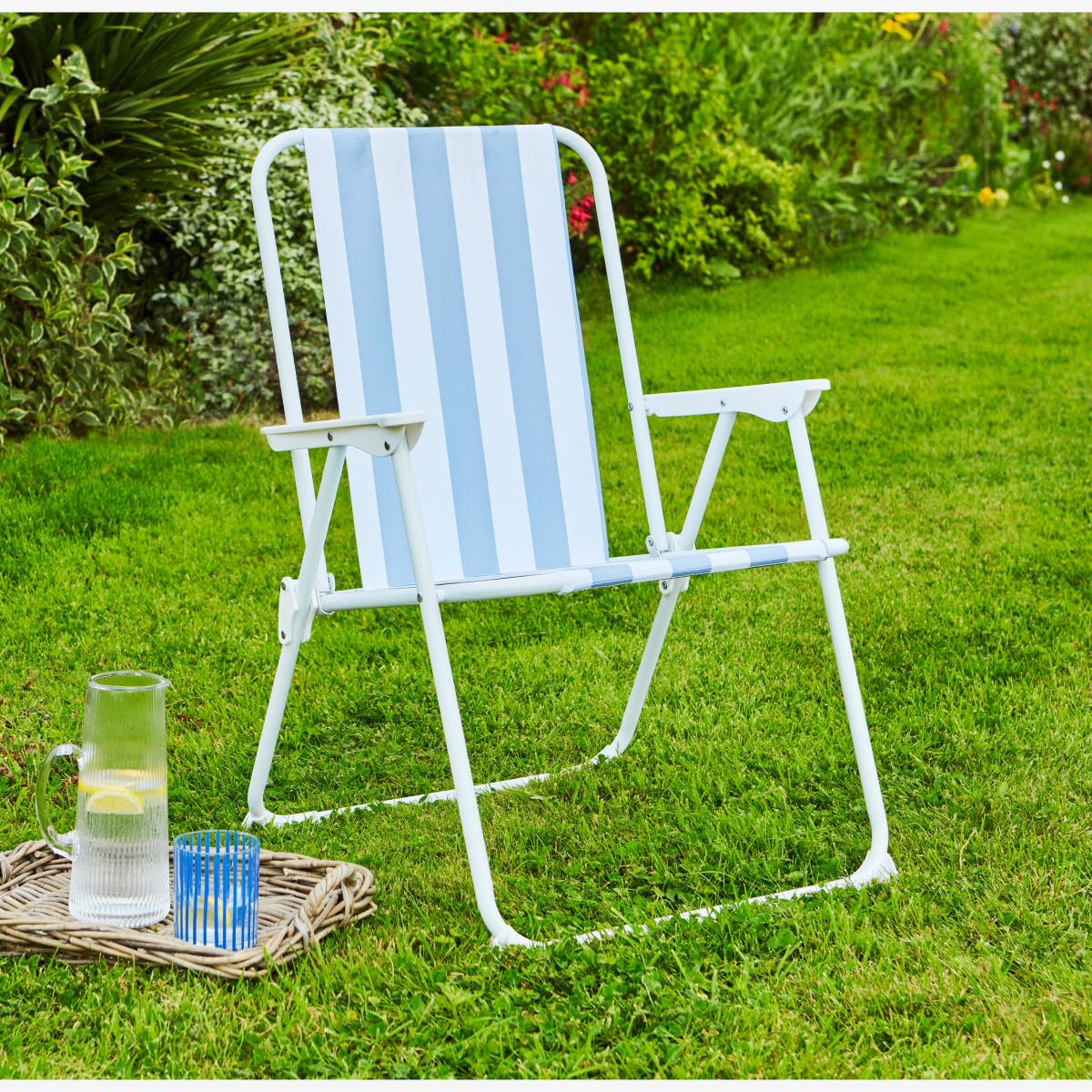 * Perfect for the beach or picnics * Foldable for easy storage * Fun design Add a pop of colour to your outdoor adventures with this vibrant blue and white folding chair. Perfect for the beach, picnics, or sunny days in the garden, it brings comfort and style wherever you go. The colourful blue stripe design adds a cheerful touch to any setting. Plus, its foldable design makes it easy to store when you're done relaxing. Whether you're soaking up the sun or enjoying a leisurely lunch outdoors, this chair is your ideal companion. Compact, stylish, and practical – it's everything you need for a perfect day outside.