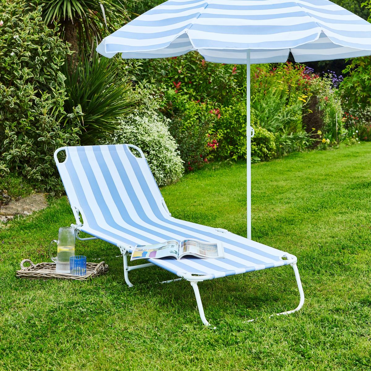 * Great for relaxing in the sun * Foldable for easy storage * Lovely striped design Relax in style with this blue and white folding lounger, perfect for the beach, picnics, or simply lounging in the garden. The vibrant blue stripe design adds a cheerful touch to any outdoor setting. Its foldable design makes it easy to store away when you're not using it, saving you space and hassle. Lightweight yet sturdy, this lounger offers the ideal blend of comfort and practicality. Whether you're soaking up the sun or unwinding after a busy day, it’s the perfect way to kick back and relax. Brighten up your outdoor moments with this easy-to-use, colourful lounger.
