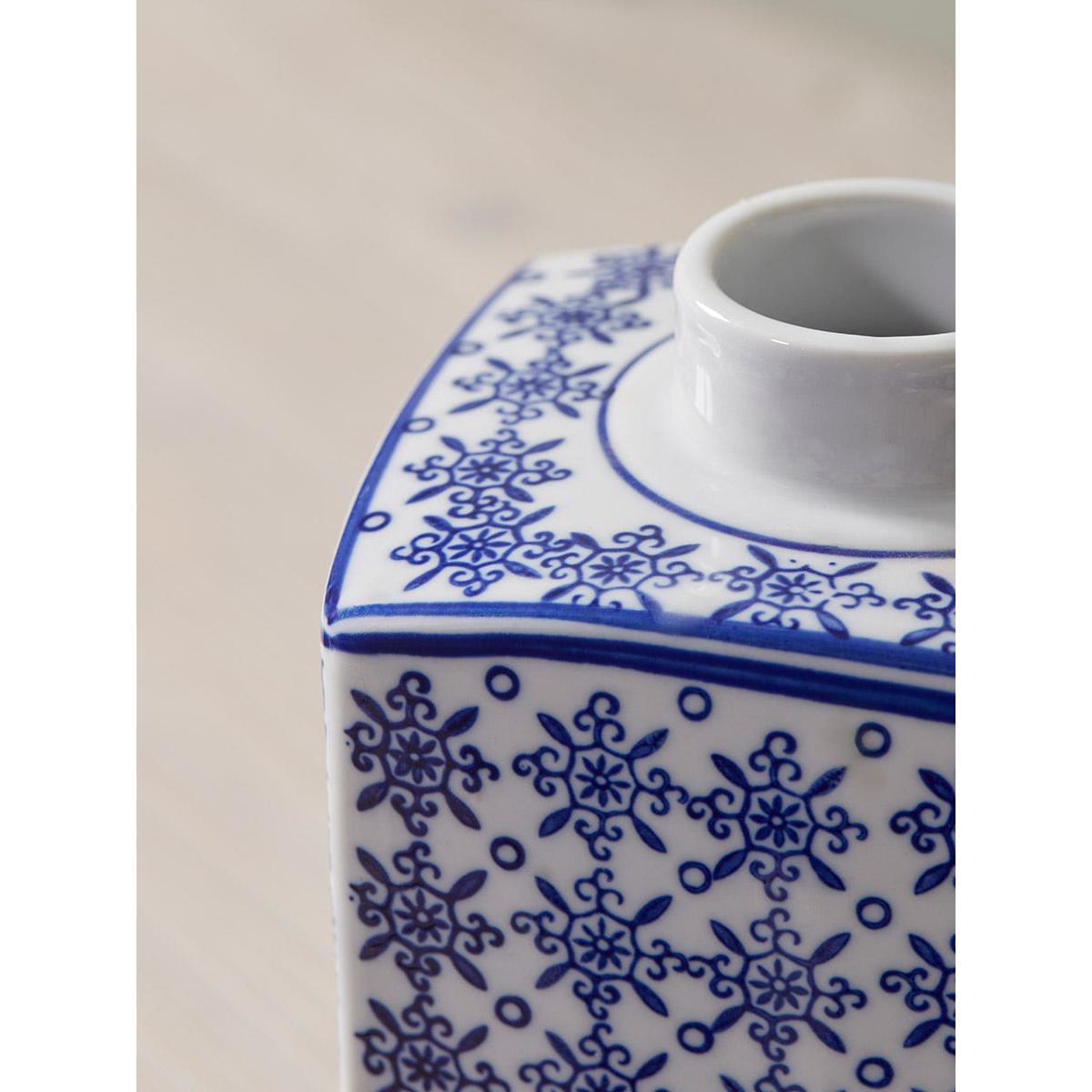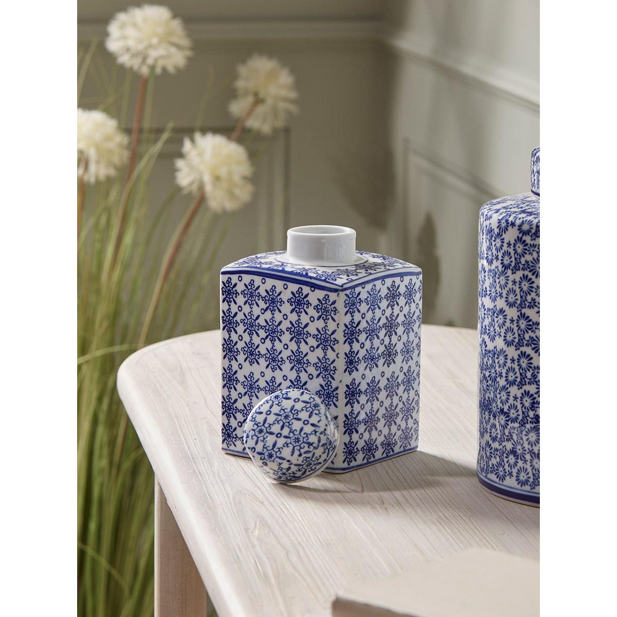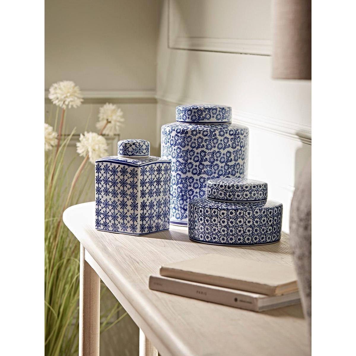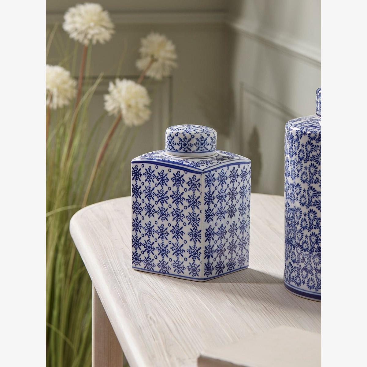 Strong lines pair with a pretty geometric pattern that sweeps over this storage pot, adding a delicate touch to your home. Perfectly suited to standing alone, the blue and white tones add a pop of colour to your space, whilst maintaining a peaceful and restorative atmosphere.