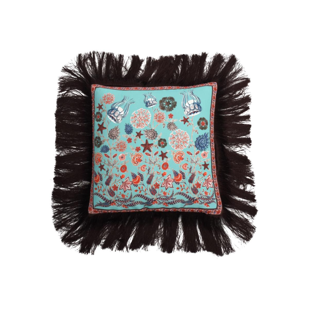 Silk twill and velvet sea creatures print turquoise cushion with fringes. Make a bold and poetic statement with the Aqua Chintz cushion, which features an Indian-Chintz inspired pattern with a variety of sea creatures and corals blossoming like flowers. The rich turquoise colour of the cushion is contrasted with a deep brown tassel fringe and a crushed velvet back to match. The movement from the fringes gives the cushion an ocean like fluidity and the silken finish adds elegance. The Aqua Chintz will enhance and brighten any living living space, be it in Orient or Occident style. Composition: Silk twill front, crushed effect velvet back, silky rayon tassels Digitally printed front Includes feather pad Removable cover Discreet zip closure Colours may vary slightly due to batch printing Dry clean only