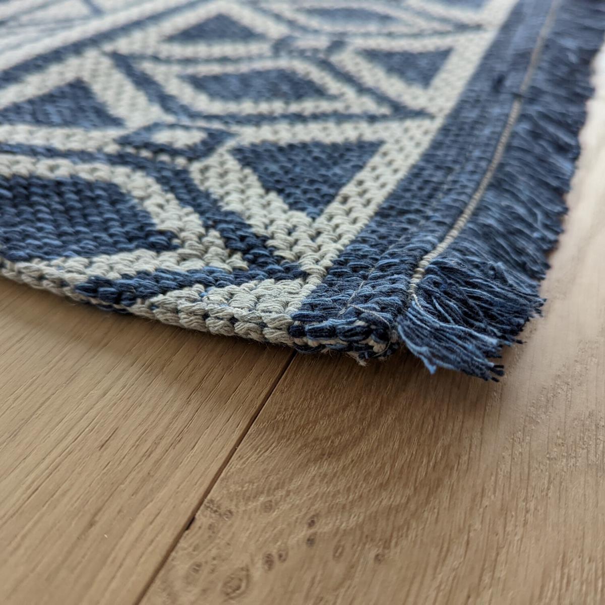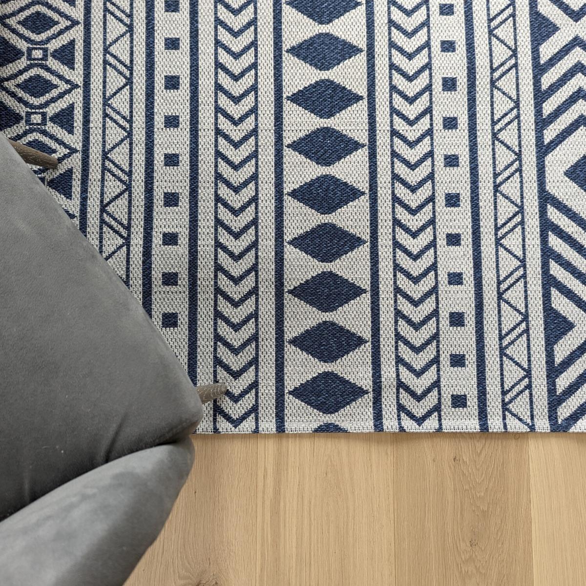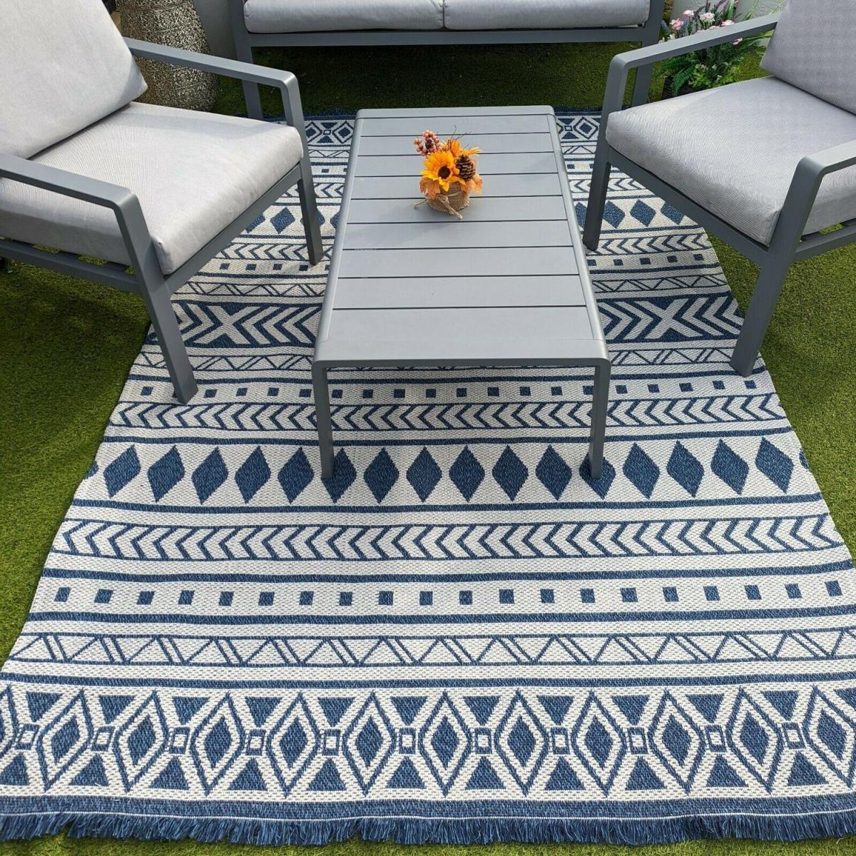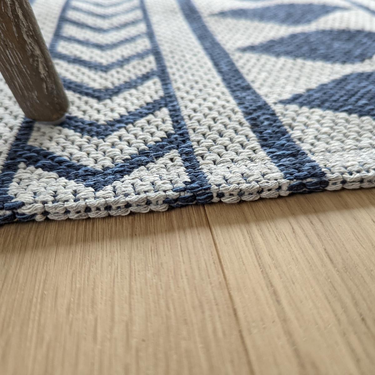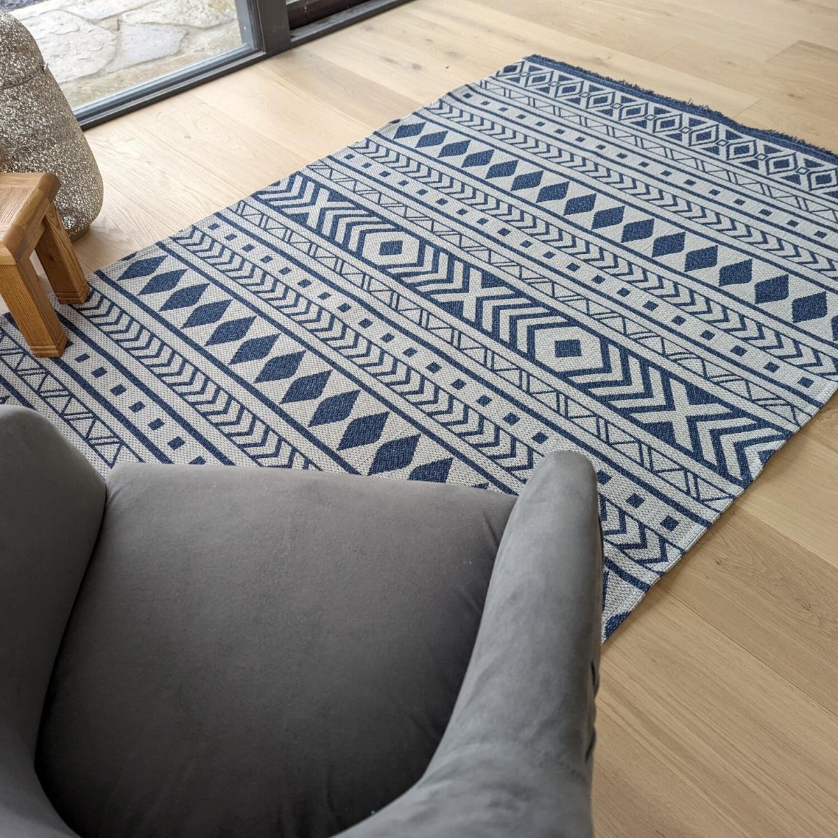I love this blue aztec rug because its vibrant pattern and colour really make outdoor or indoor-outdoor spaces feel lively and inviting. It works beautifully in casual, relaxed settings such as patios, garden lounges, or even covered terraces. The 220cm size is versatile, providing enough coverage to define a seating area without overwhelming the space. For styling, team it with neutral tones in your furniture and cushions to let the pattern stand out, or pair it with other navy and white accessories for a cohesive look. Practical tips include choosing furniture with weather-resistant cushions and adding some potted plants to enhance its relaxed, inviting vibe.
