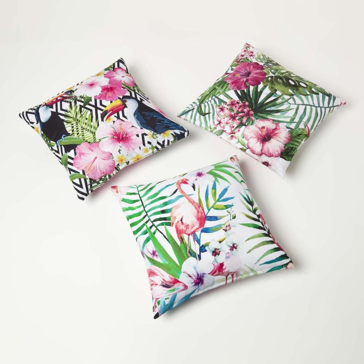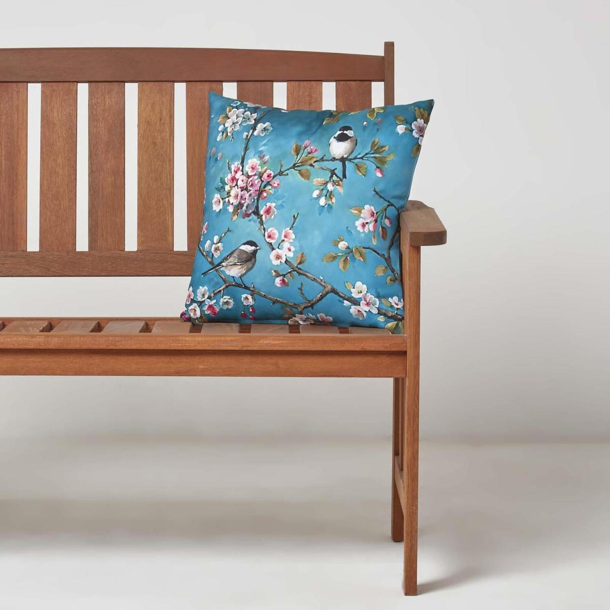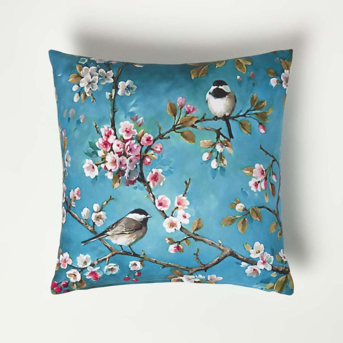 Colourful square garden cushion measuring 45 x 45 cm. This decorative outdoor cushion features lifelike birds sitting on a colourful cherry blossom tree against a vivid blue background. A great way to inject a splash of colour into your outdoor space, this blue outdoor cushion is sure to add a touch of personality and style to your home. Woven from a thick and durable water-resistant polyester, these durable cushions are perfect for styling outdoors. And provide extra comfort and support to your garden chairs, garden sofas and benches. A versatile cushion they can be used around your outside spaces as well as in conservatories, summer houses or even around the home. Prefilled with a bounce-back, super microfibre hypoallergenic cushion insert these cushions will remain plump and comfortable even with regular use. We recommend that you always store your cushions indoors when not in use and keep them out of direct sunlight and heavy rain. Spot clean with mild soapy water and leave to dry naturally. Part of Homescapes exclusive garden and outdoor accessories, the collection includes garden seat pads and bench cushions, garden accessories and a colourful range of outdoor rugs available in a range of colours and sizes.