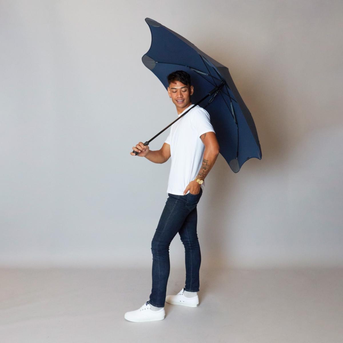 Broad and elegant, the BLUNT Exec is perfect for business, and those whose business it is to keep others dry. The largest full-length street umbrella in the Blunt range, with a stylish handle strap, the Exec is big enough for at least two people making it perfect for rainy morning coffee runs or lunchtime meetings out of the office. The BLUNT Exec model is built with a strong lightweight aluminum shaft to withstand the elements. Comes with a black carry sleeve.