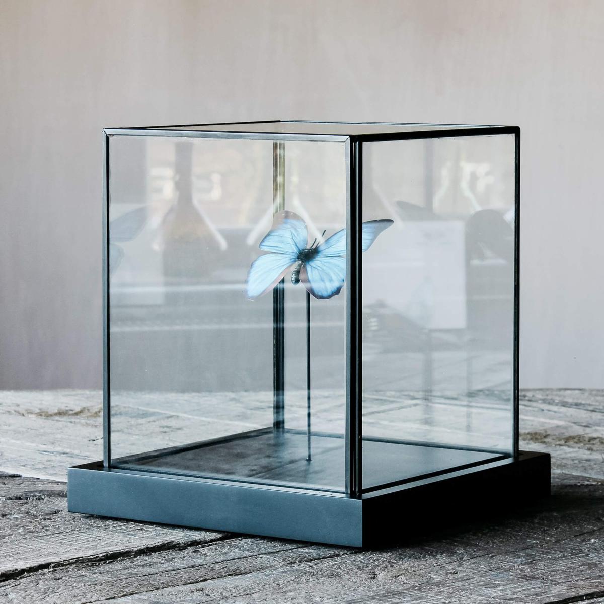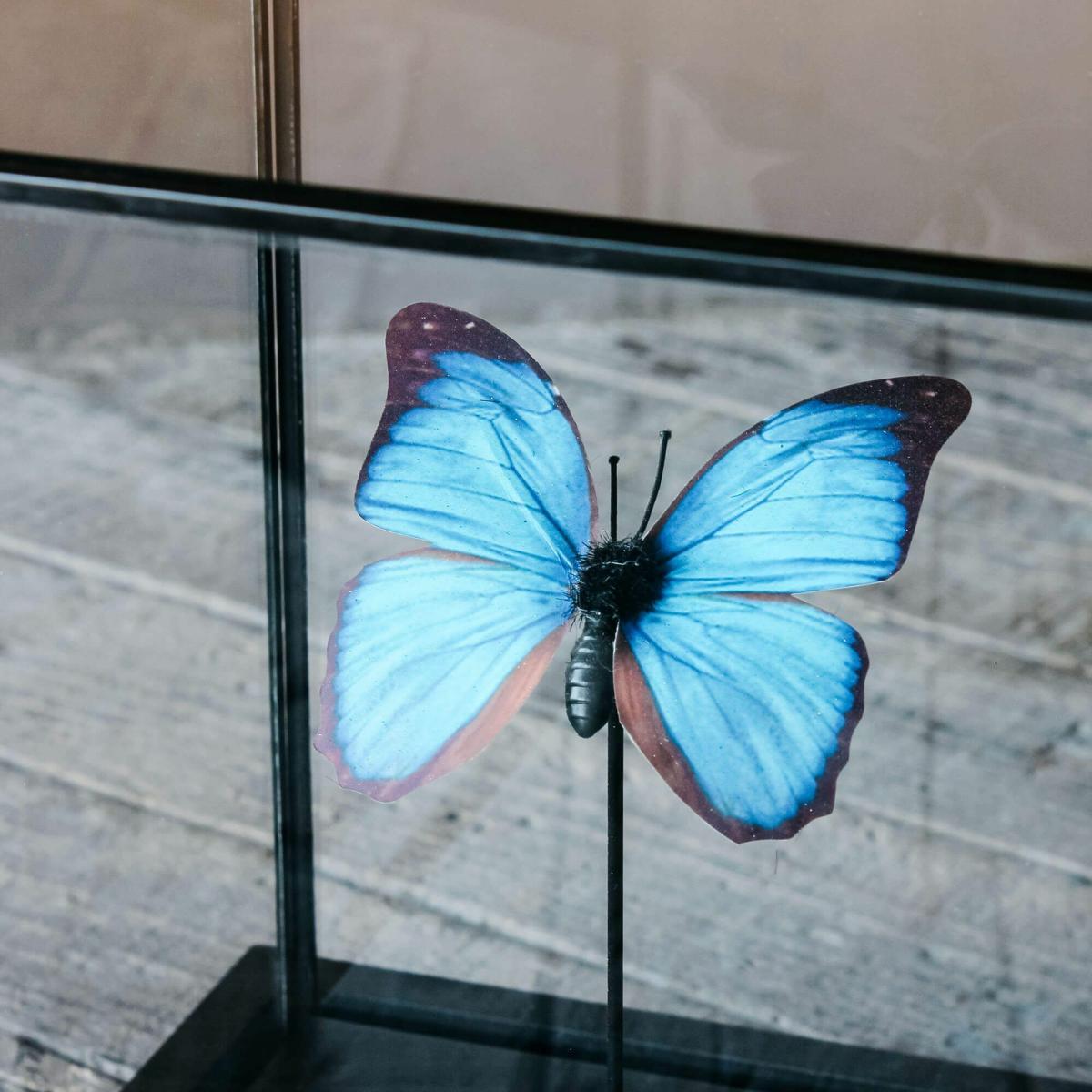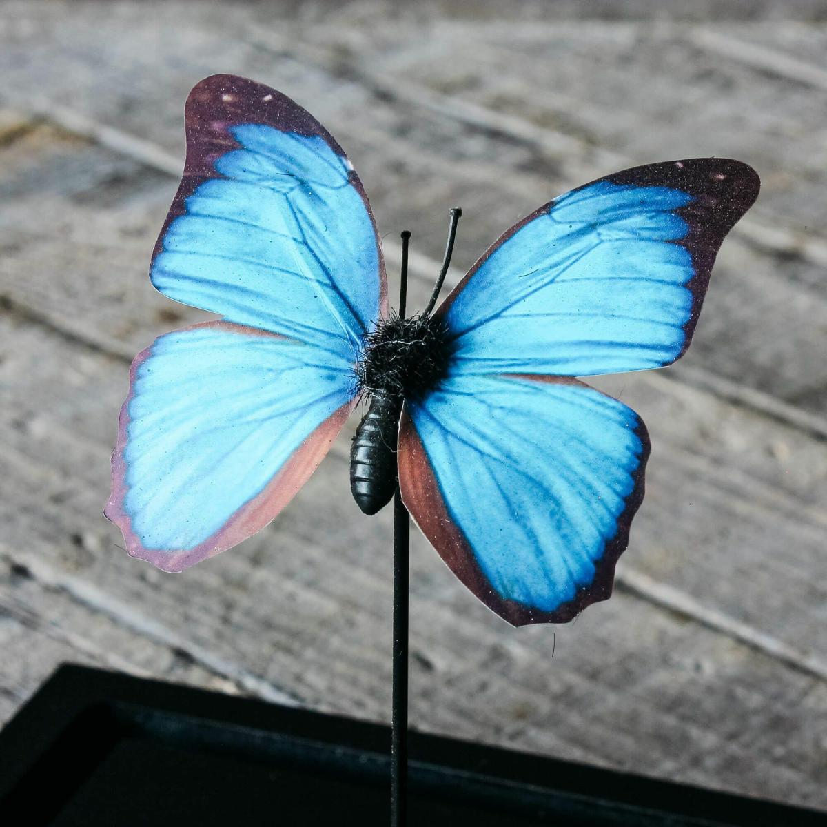 Curate your own Victorian-inspired cabinet of curiosities with this marvellous blue morphos butterfly, native to rainforests in Mexico and South America, made of handpainted feathers and housed in a square glass cloche with a black stand.