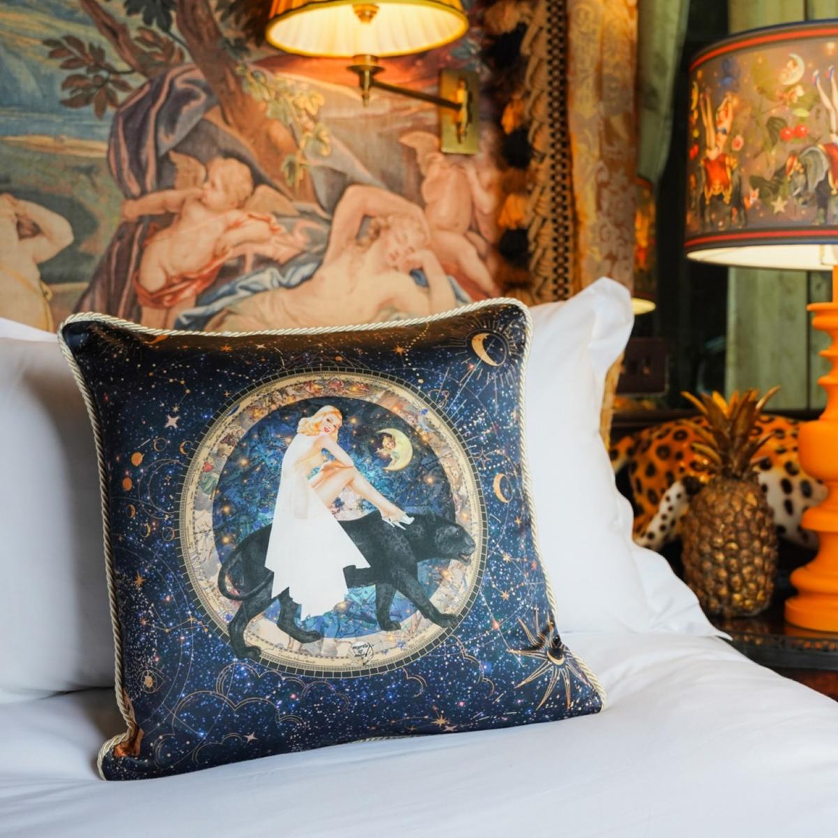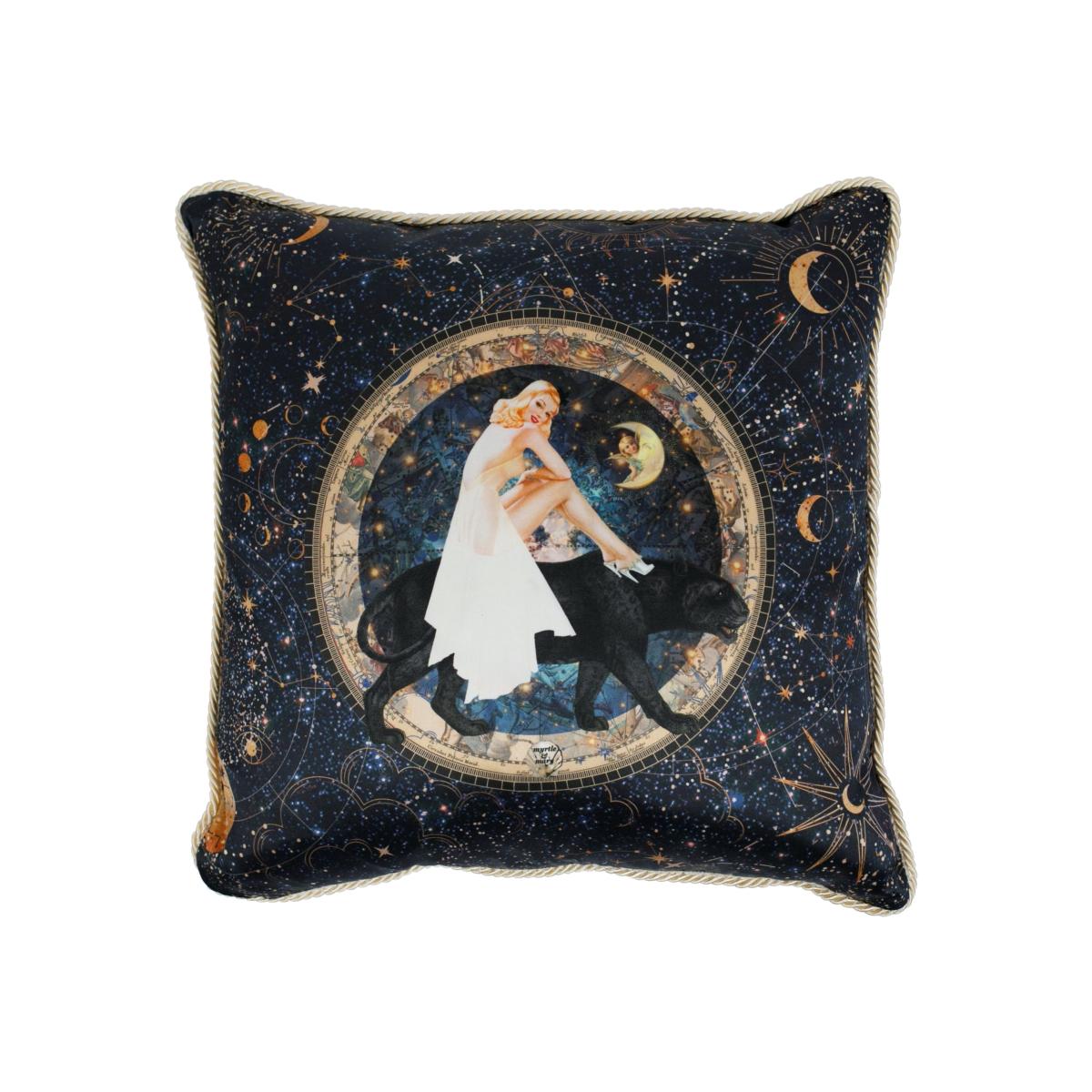 I love this cushion for its striking celestial design combined with the soft silk fabric, making it both a visual focal point and a luxurious tactile piece. It works particularly well in eclectic or bohemian interiors, where its mythic imagery can add a whimsical touch, or in bedrooms and lounge areas where a hint of mystical charm is desired. When styling, consider pairing it with neutral-toned throws and other textured cushions to let it stand out, or blend it with similarly themed accessories for a cohesive look. It's a versatile piece that adds personality and a hint of glamour, perfect for those looking to inject a bit of cosmic allure into their space.