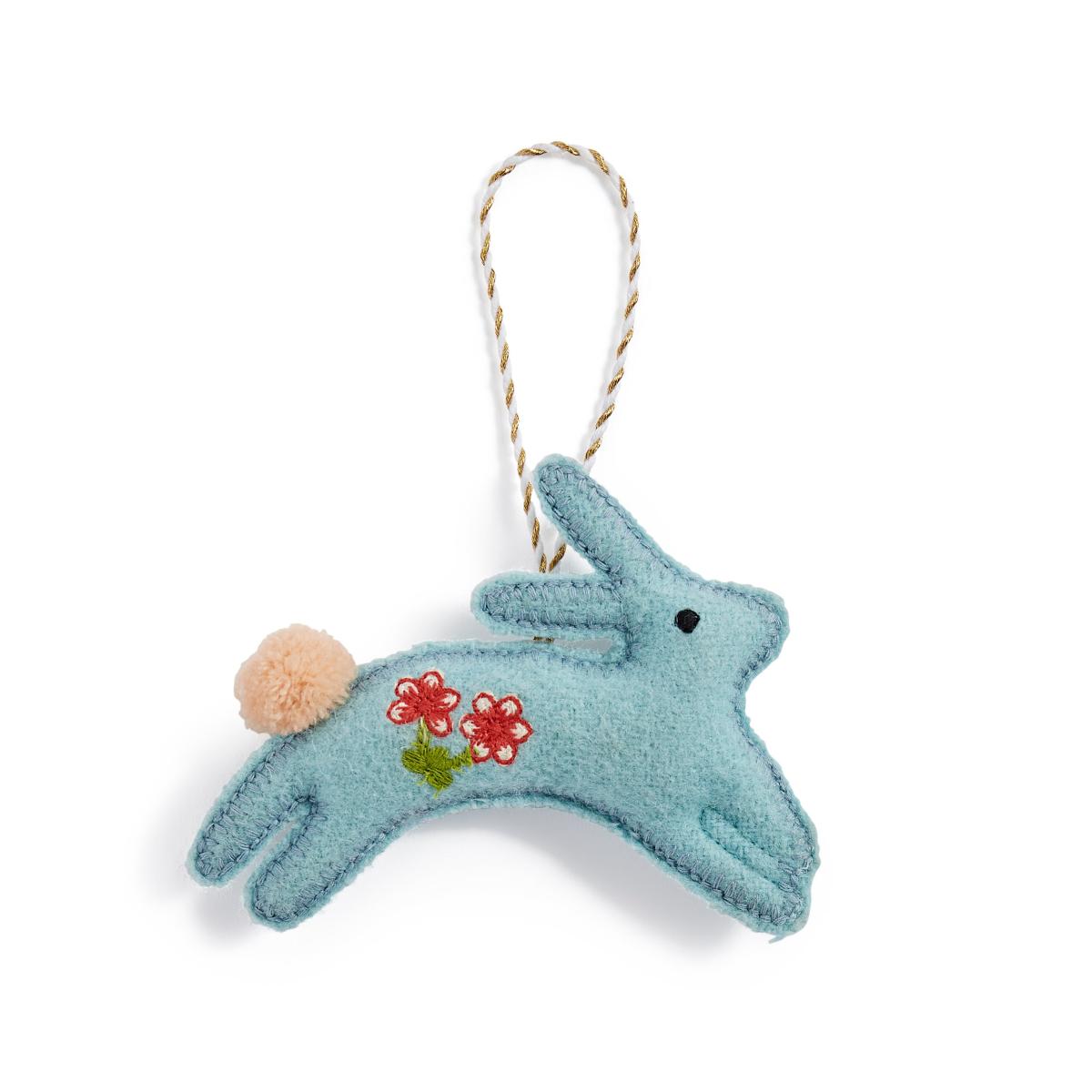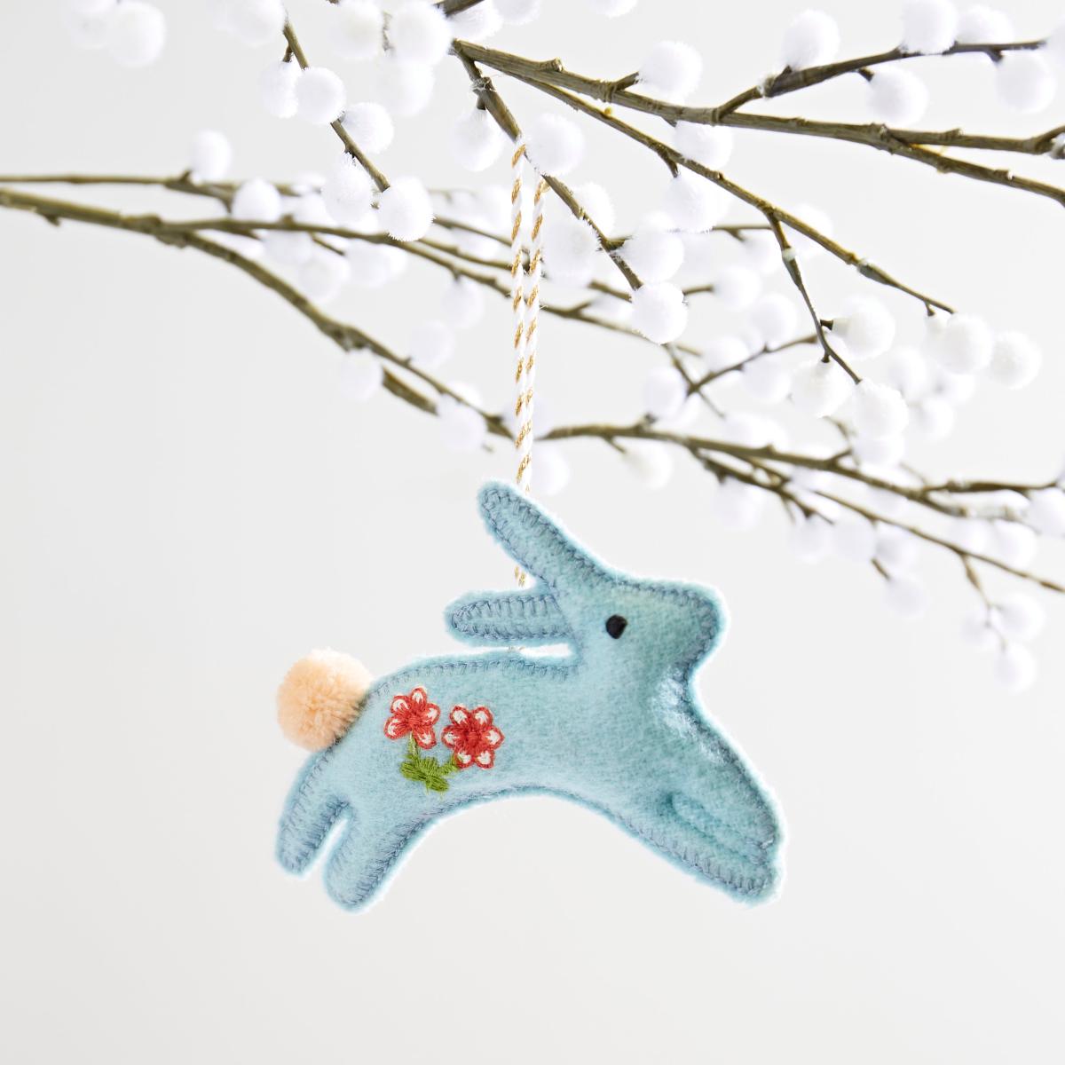 * Felt rabbit * Hanging loop * Blue colourway * Flowers embroidery Add some Spring cheer to your living space with this cute hanging Bunny decoration. This little blue rabbit features a built-in hanging loop for easy display and pretty flower embroidery. Made from durable felt, this is a decoration that can be enjoyed every Spring or Easter, or even year-round!