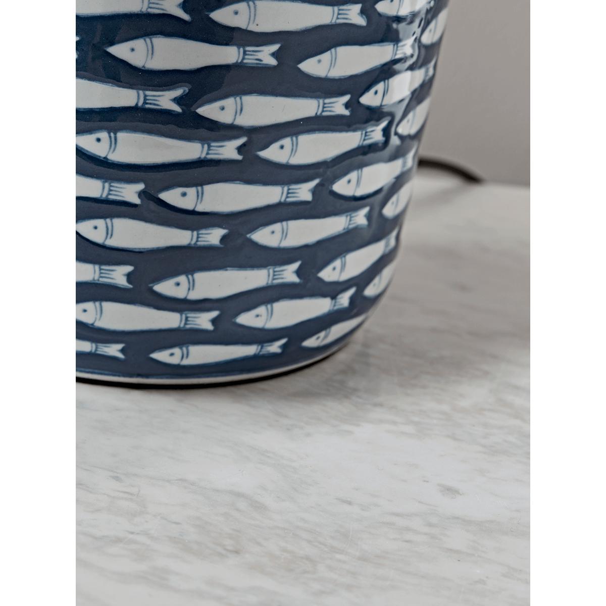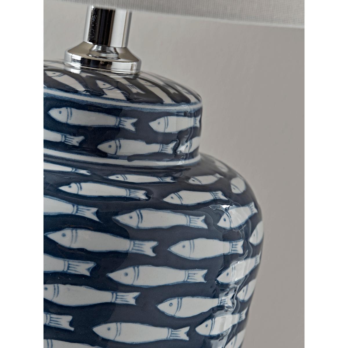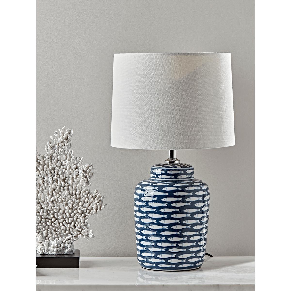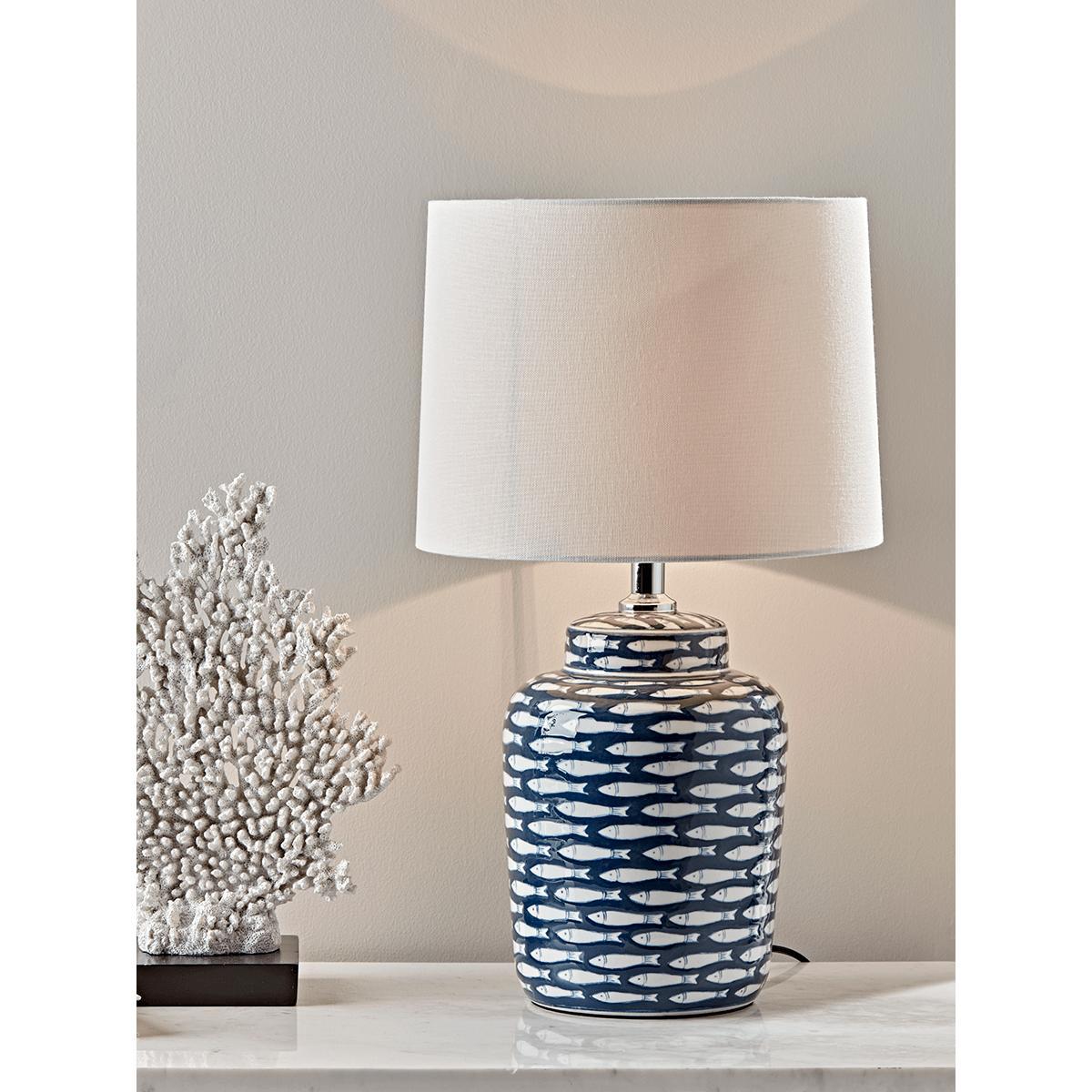 Crafted from ceramic and topped with a pale cream cotton shade, our simple, urn-shaped lamp has an elegant, hand painted fish design in navy and white, with a glossy finish and simple chrome fittings. Perfect for adding a touch of nautical chic to your living space.