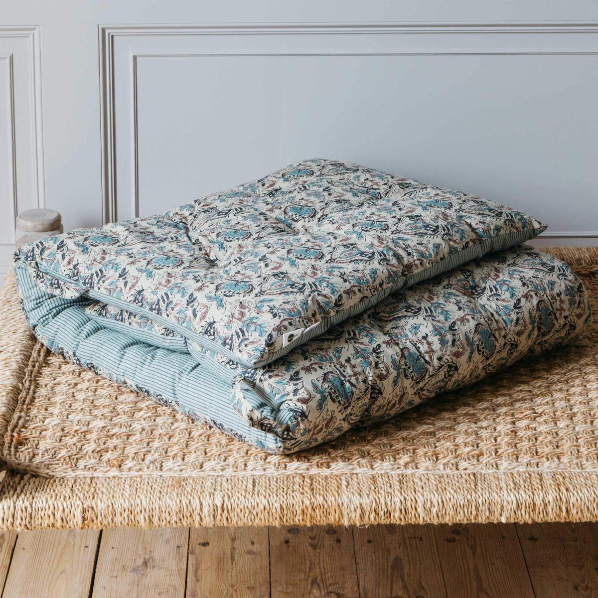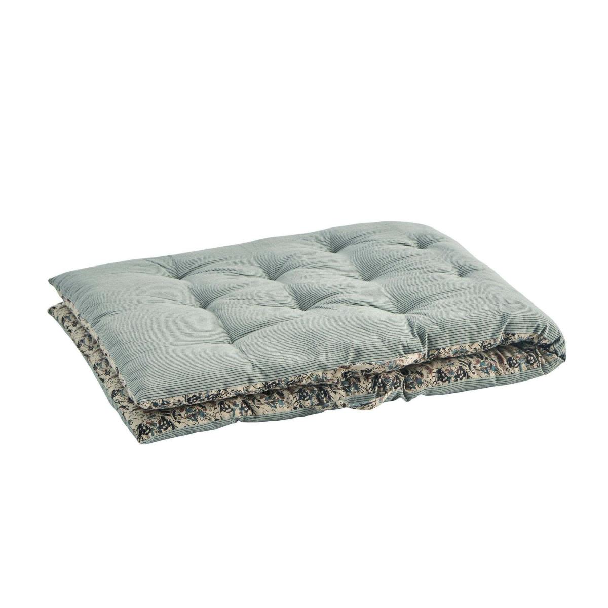 A retro-inspired padded bed roll with a blue and ivory floral print and a striped reverse, ideal for additional bedding for a bohemian bedroom.