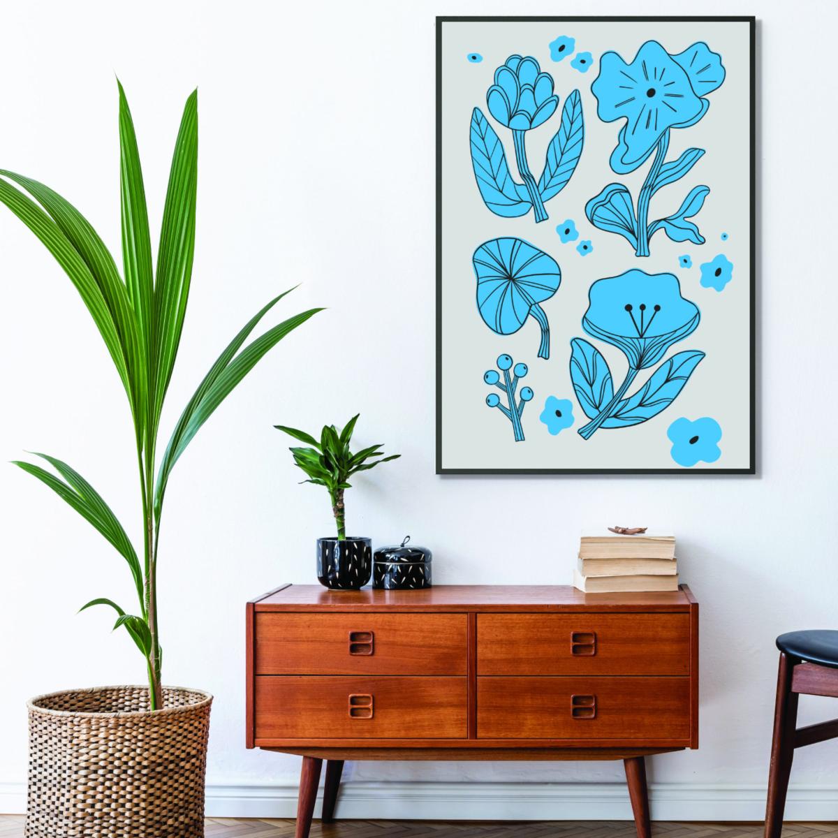I love this blue flowers print because it adds a fresh, contemporary touch to any room. Its medium size makes it versatile for both larger walls and smaller spaces, and the calming colour palette works well in bedrooms, living rooms, or even bathrooms. To style it effectively, pair it with neutral or softly coloured furnishings to let the artwork stand out, or mix it with other blue accents for a cohesive look. Practical tips include hanging it at eye level for optimal viewing and using a clean, minimal frame to highlight the modern illustration style. It’s a great choice for adding personality without overwhelming a space.