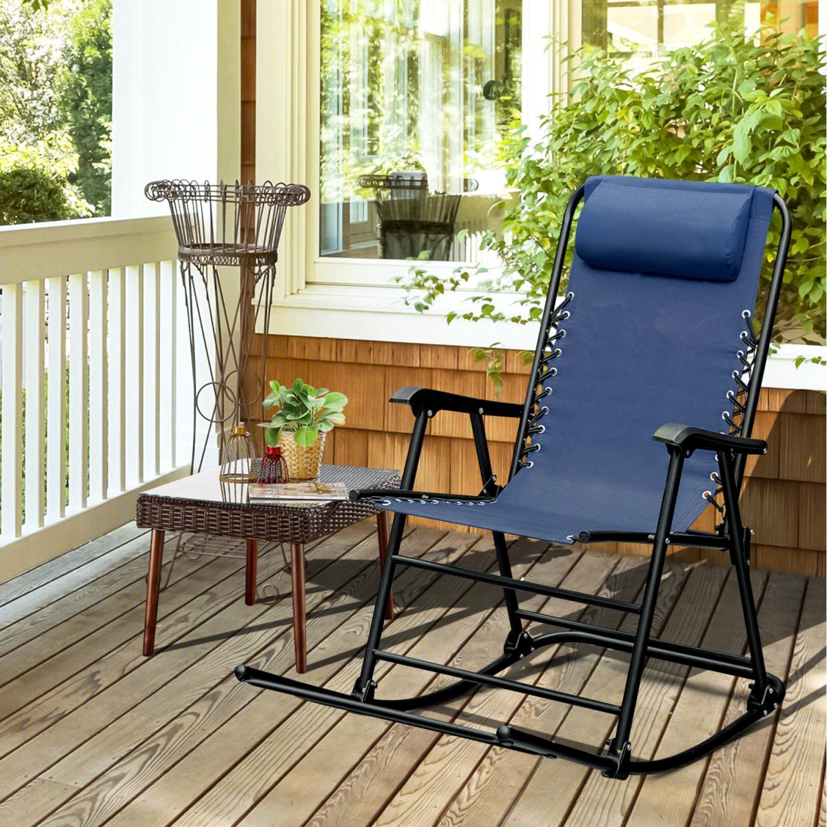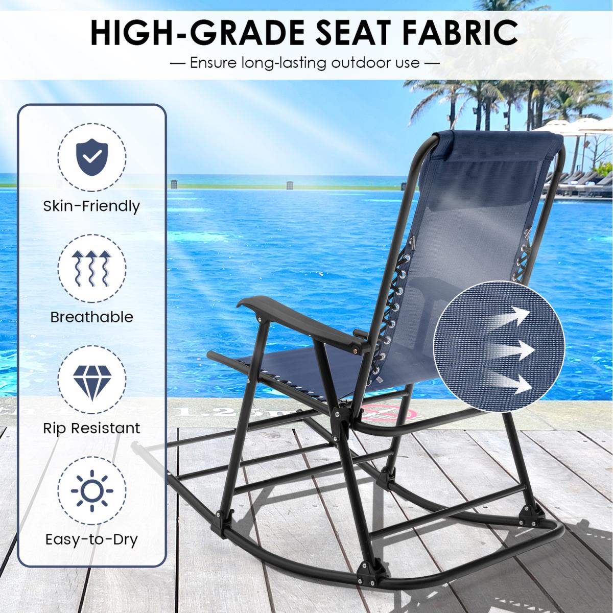 Our folding rocking chair can provide you with comfortable sitting and rocking experience, allowing you to relax better and enjoy your leisure time. The sturdy steel frame with rust-resistant coating ensures high stability and durability of the chair. And the ergonomic seat with extended footrest and soft head pillow will provide you with more comfort. Moreover, the seat fabric is not only wearable for long time use, but also breathable and easy to dry. The rocking function of this chair can help you relieve the stress of work and relax nicely. In addition, the folding design of the chair saves much effort to store and carry. This folding rocking chair will be an awesome addition for balcony, garden, backyard, poolside, etc.