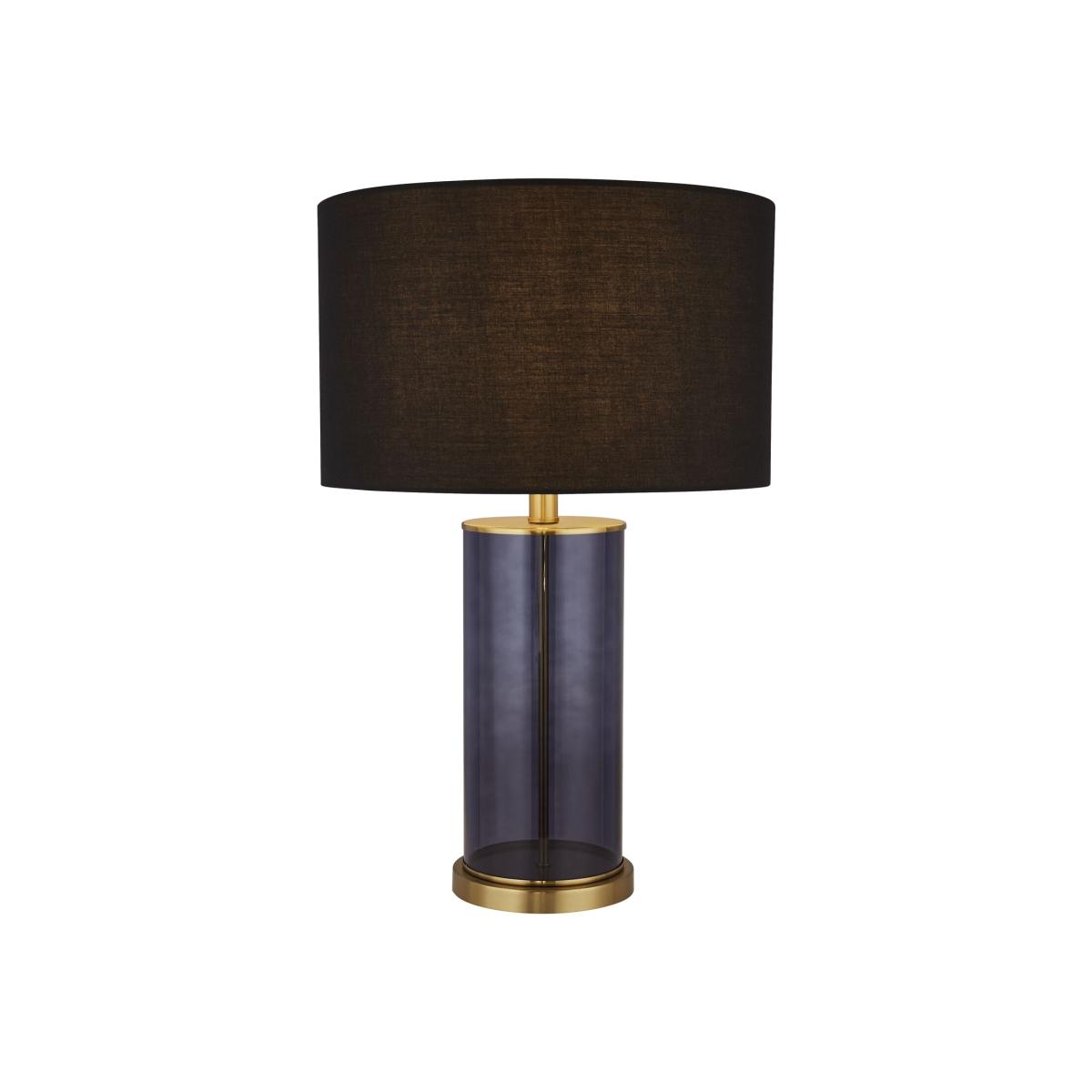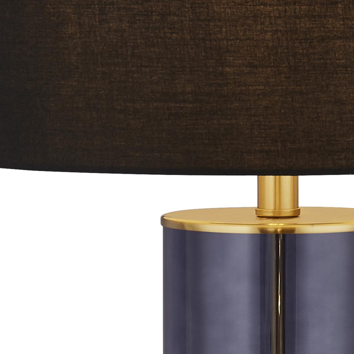 Add a touch of luxury to any living room or bedroom with this table lamp. With a blue glass and gold base, topped with a contrasting black fabric shade, this lamp will elevate any room.