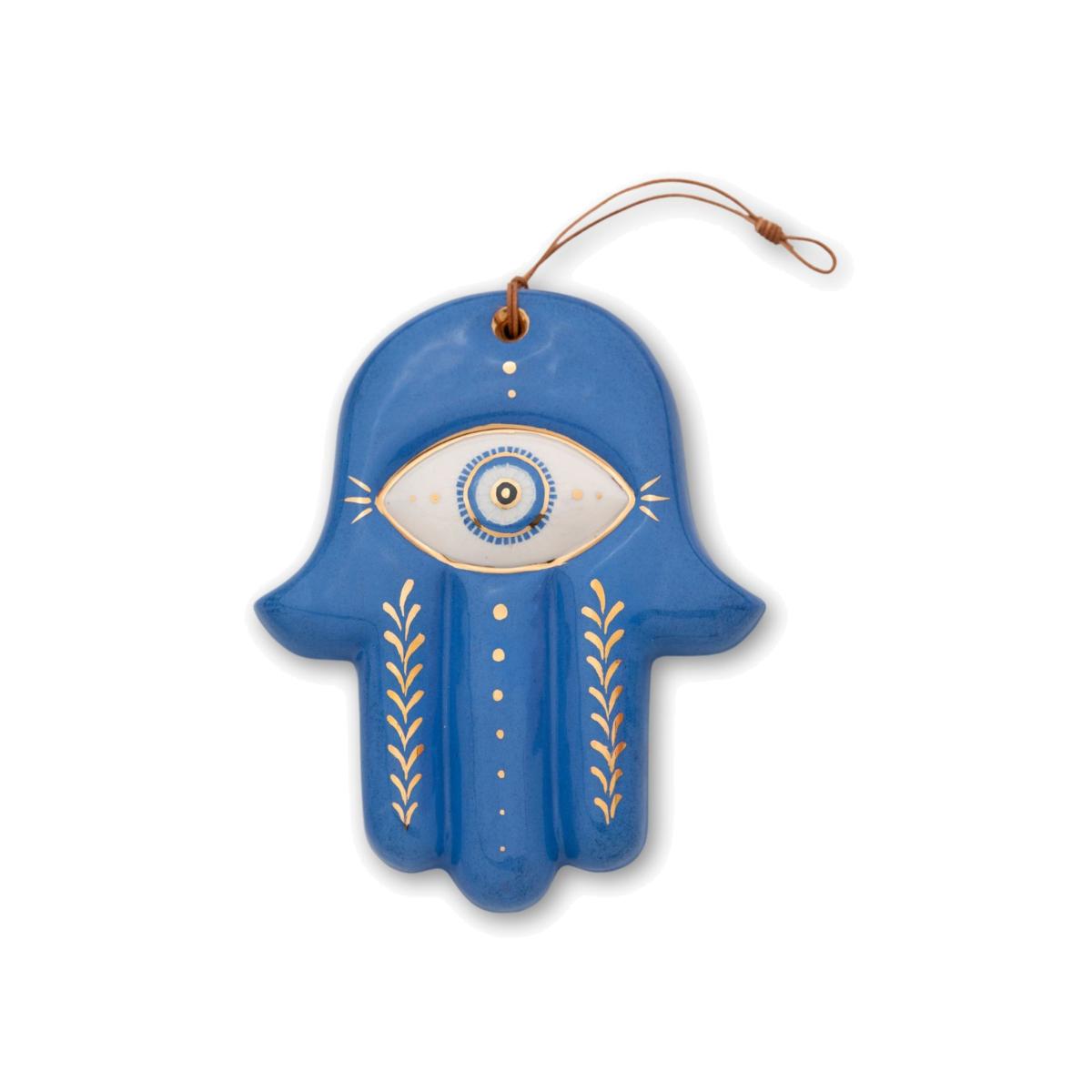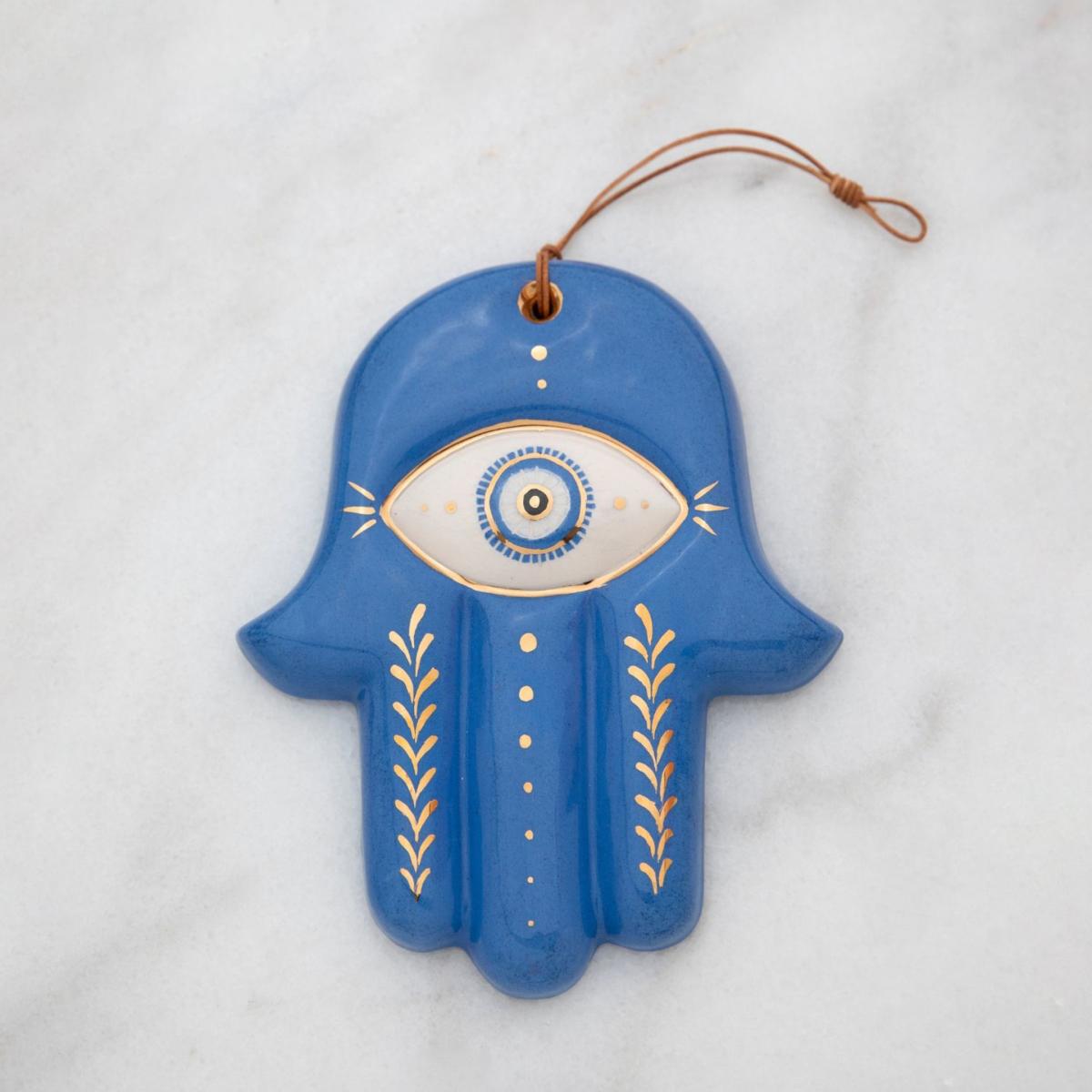 The Hand (HAMSA), particularly the open right hand, is a sign of protection that also represents blessings, power and strength, and is seen as potent in deflecting the evil eye. 🪬 Each piece is hand-built earthenware ceramics, fired, glazed, and then fired for the 3rd time for golden details with real 24ct Gold Luster. Comes in a gift pack with a handmade felt gift case. Each one is %100 handmade so there may be slight differences.