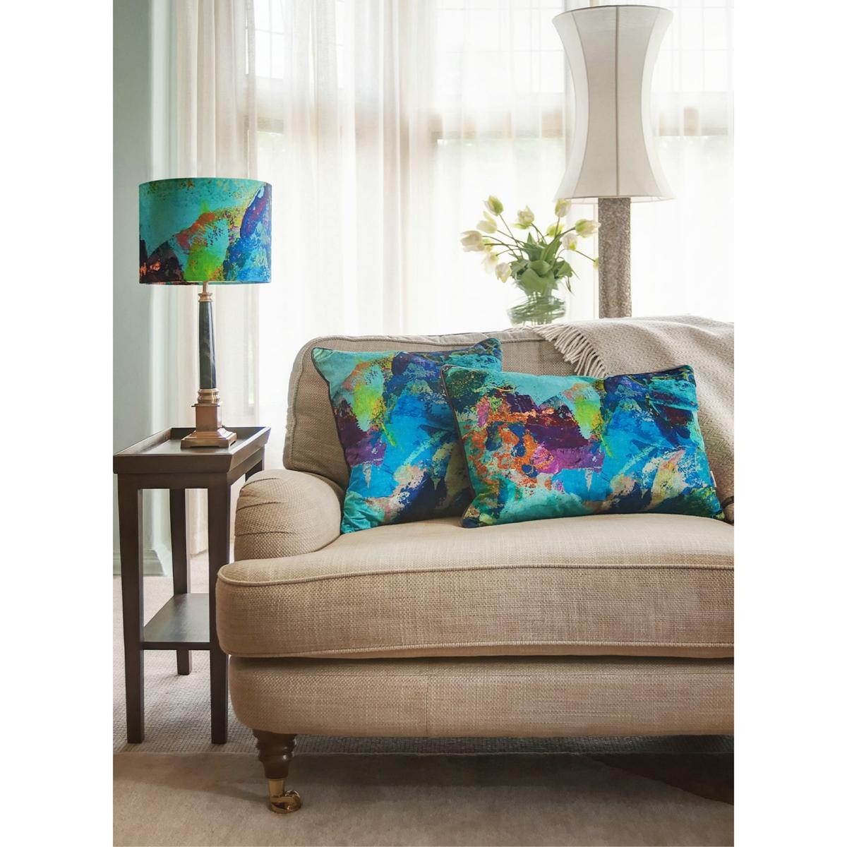 Susi's artwork is inspired by the beautiful colours and light in her landscapes of Northumberland and Tuscany and this Azure design is a microcosm of one of her colourful paintings. The idea of taking art off the walls and incorporating these designs into the home gives a 'one of a kind' edge to any interior. We love the Bluish colour palette too with shades from Turquoise to Teal to dark Purple. Striving for sustainability and keeping their carbon footprint at a minimum, the brand's cushions are printed in the UK and made by their local artisan makers before being packed up in recycled and recyclable packaging. The inserted cushion pads are made in Norfolk and their duck feathers are ethically and sustainably sourced.