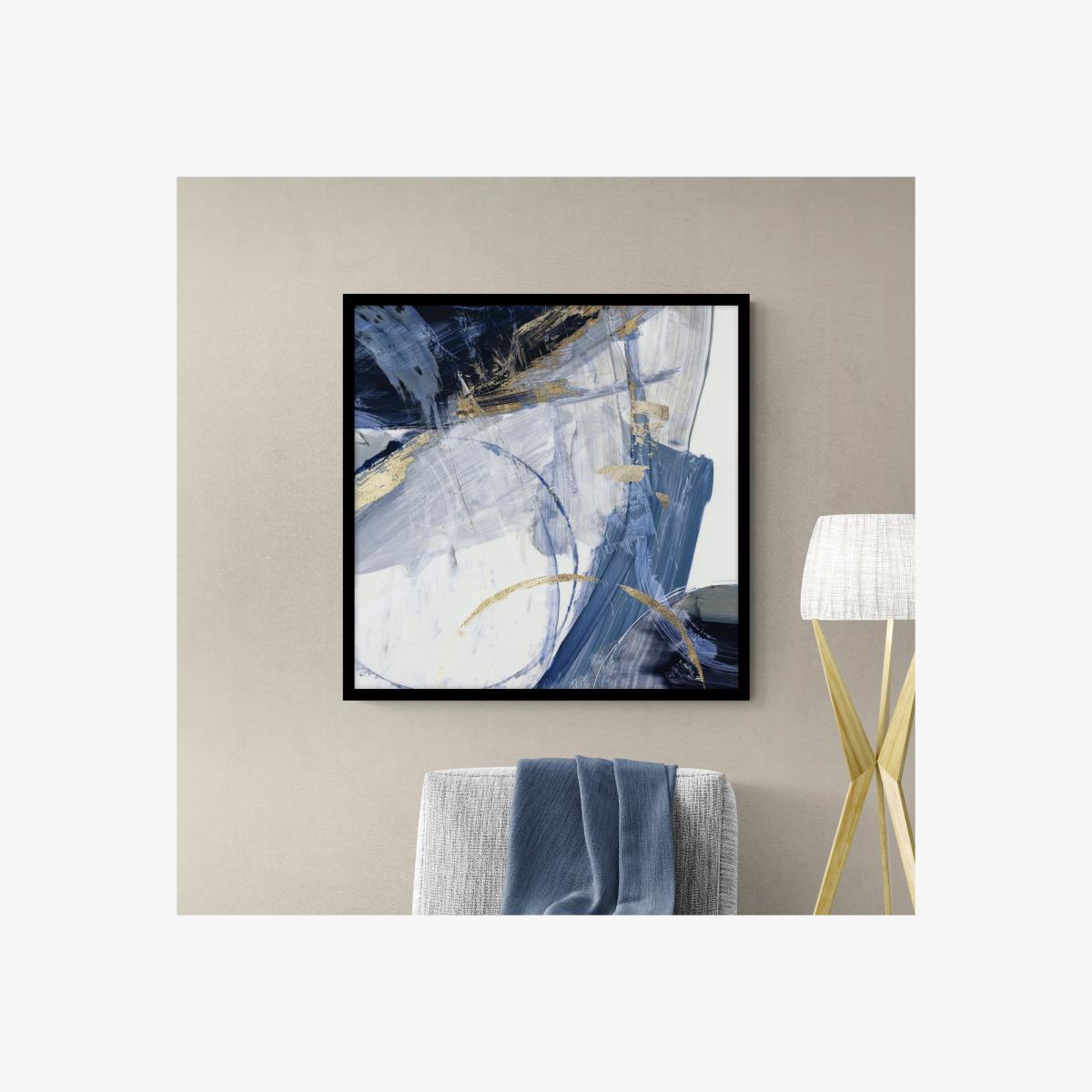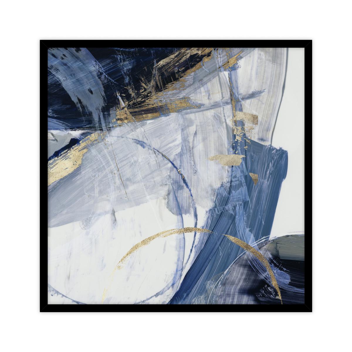 * Modern, abstract print * Framed and ready to display * Blue tones with metallic accents This striking abstract artwork by Tom Reeves features bold brushstrokes in deep blue and white tones, creating a dynamic focal point for any room. Framed in sleek black moulding with a grained effect, it offers a modern and sophisticated presentation. Subtle gold accents contrast beautifully with the colours, adding a touch of elegance. The layered textures and curved, circular forms bring a fluid movement to the piece, while the textured finish enhances its painterly quality. With no glass, it’s ready to hang and brings depth and visual interest to your walls. A perfect addition to contemporary interiors looking for a touch of artistry and flair.